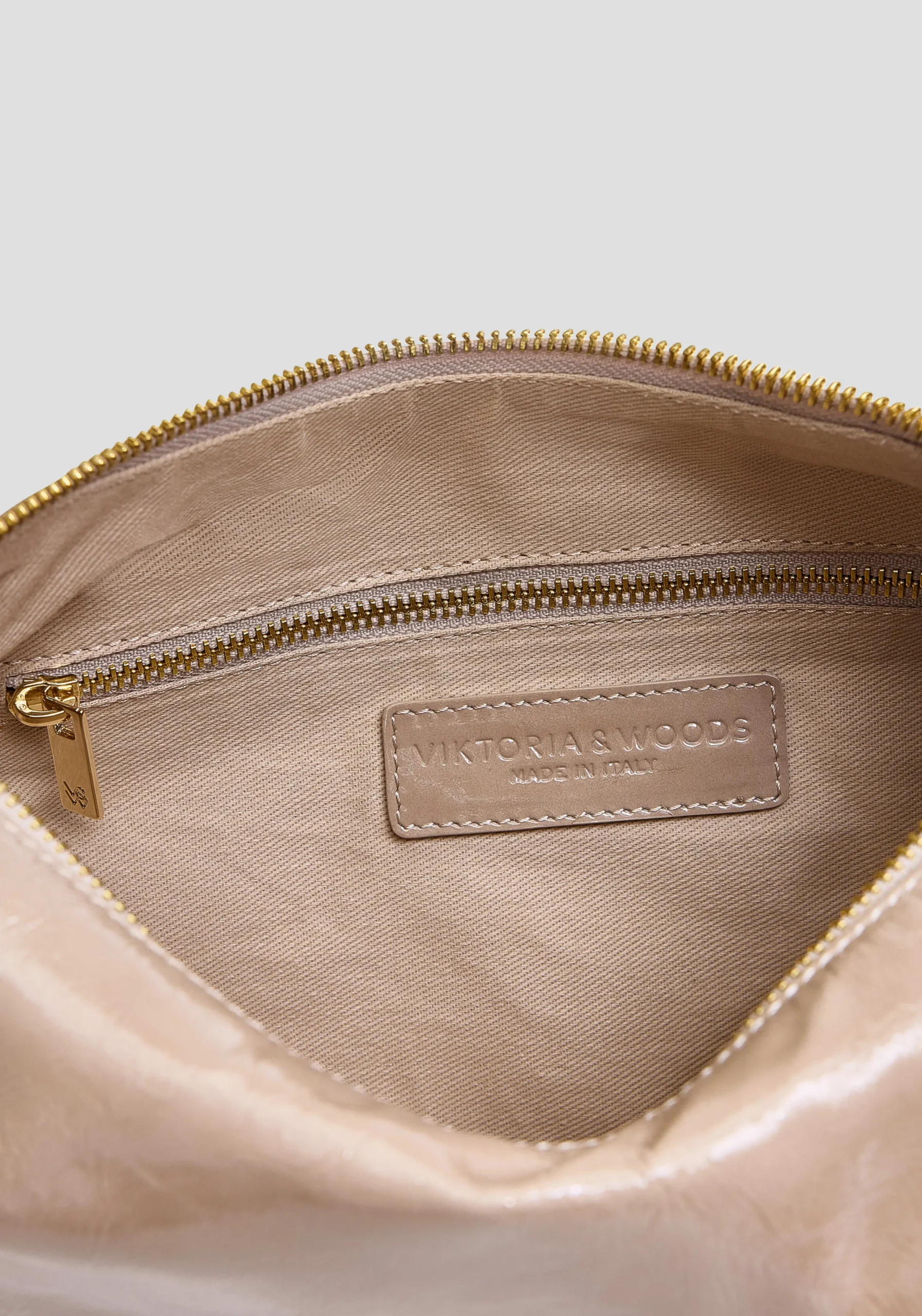 Effortlessly elevate your outfitting with the Harvey Bag, crafted from crinkled patent taupe leather. Accented with gold V&W hardware, a zip opening, and an internal pocket with a branded leather patch. This sleek design adds refined intrigue to any look – a timeless addition to every wardrobe.MADE IN ITALY