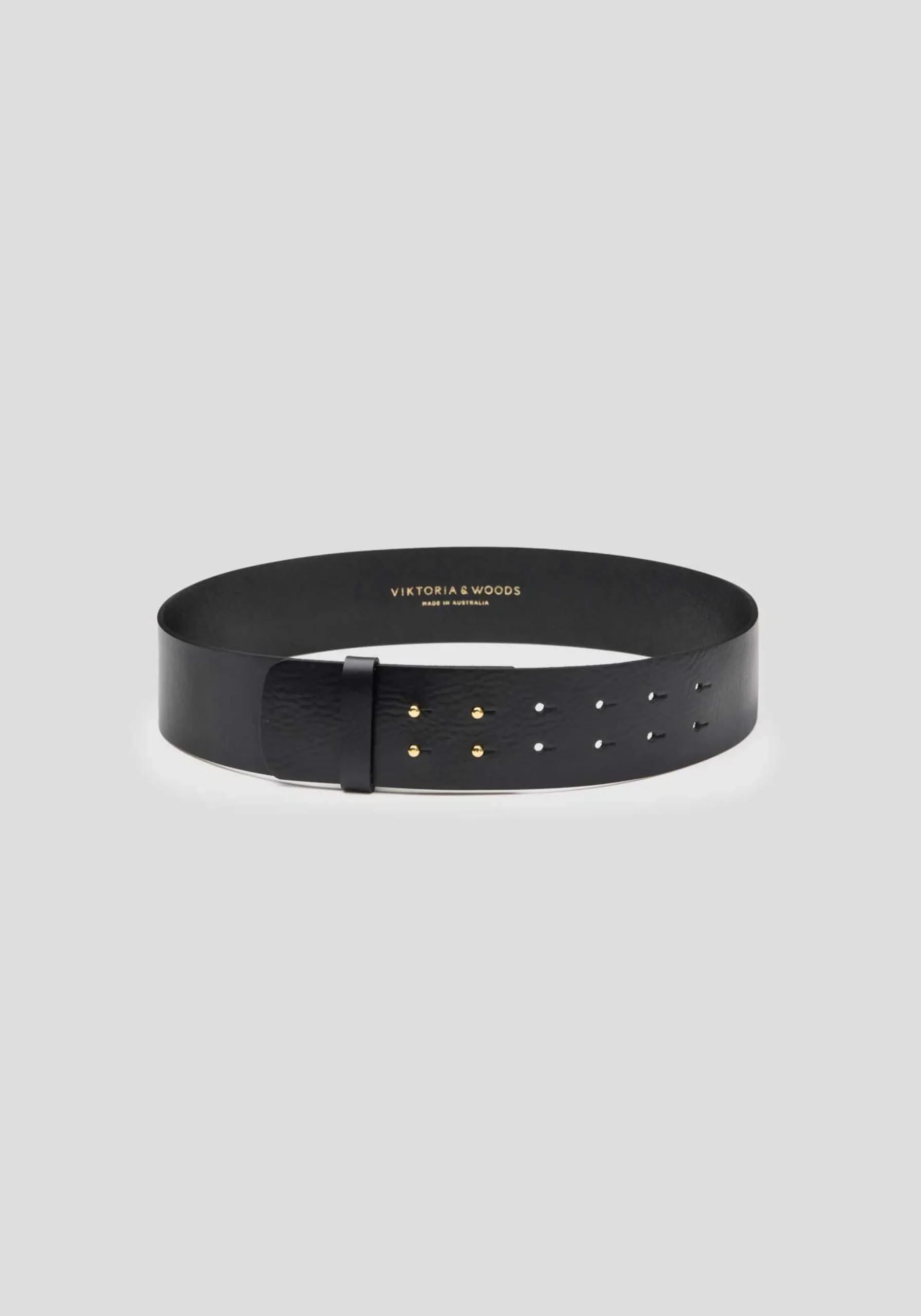 Complete your look with the Stella Belt, a thick waist belt crafted from black leather with a 55mm depth. Featuring a stud opening detail, it is perfect for styling over blazers and relaxed shirting to cinch in the waist for elevated effortlessness.MADE IN AUSTRALIA