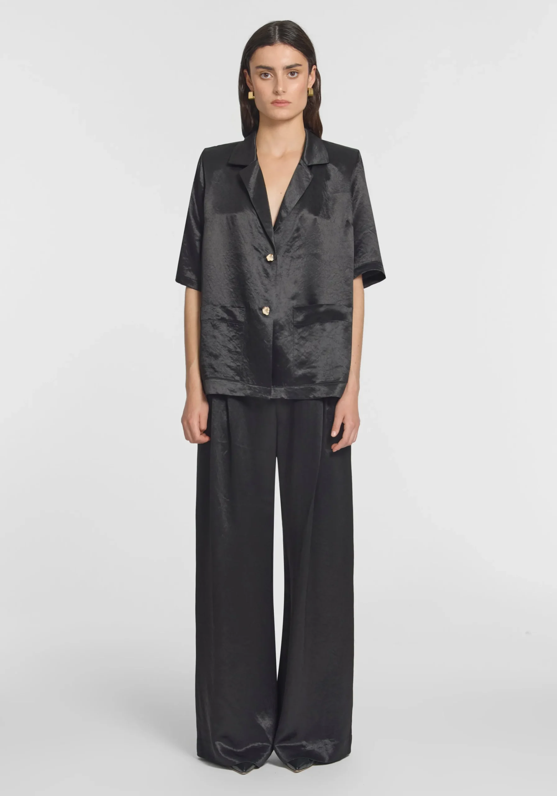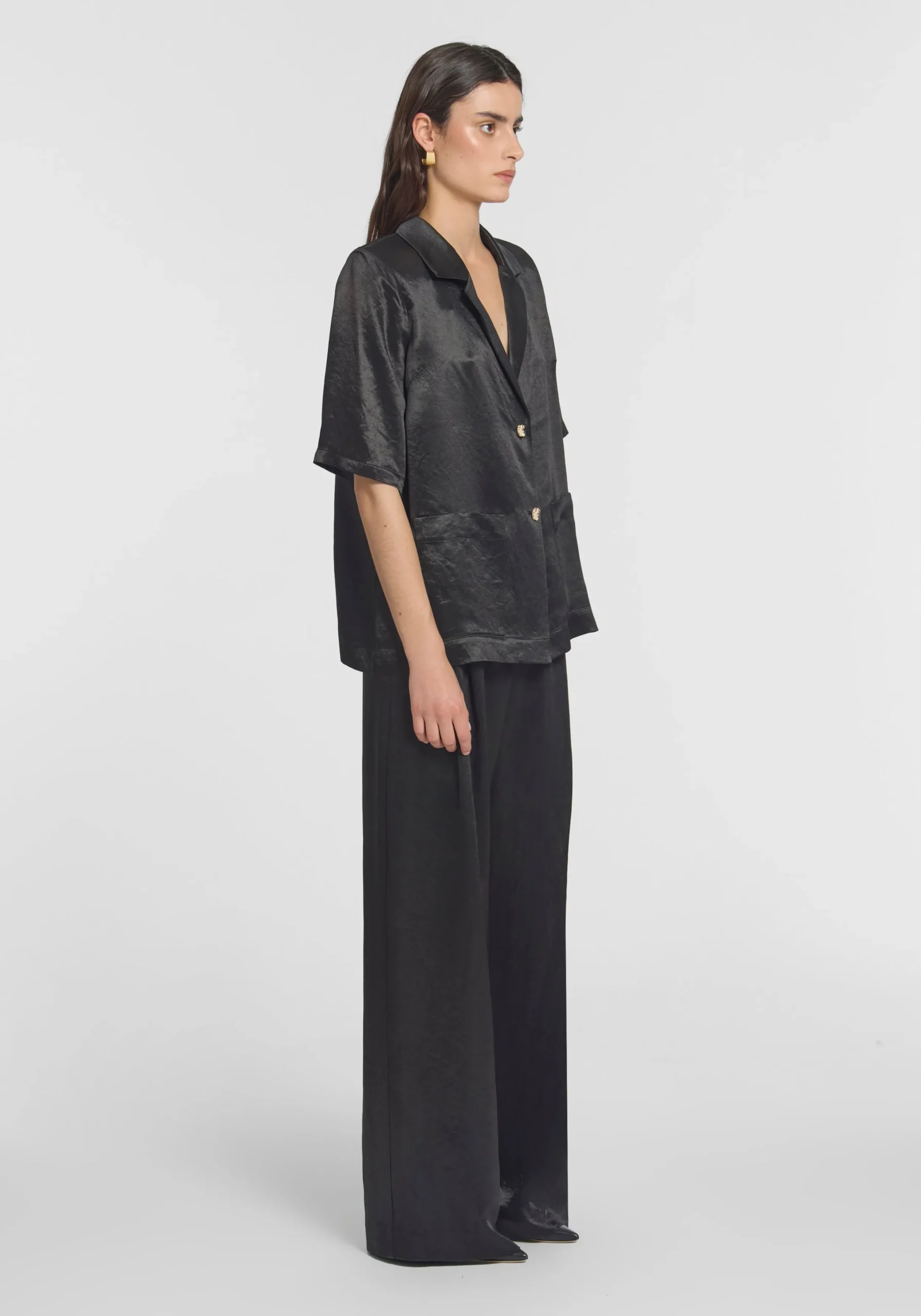 The Hampshire Shirt reimagines our iconic Chorus Shirt, tailored in classic black naia acetate with a vintage-inspired patina and subtle crinkle effect. Offering a relaxed silhouette and soft shoulder pads. It’s finished with unique gold buttons. Complete the look with the Malone Pant for an effortlessly elevated set dressing moment.MADE IN AUSTRALIA