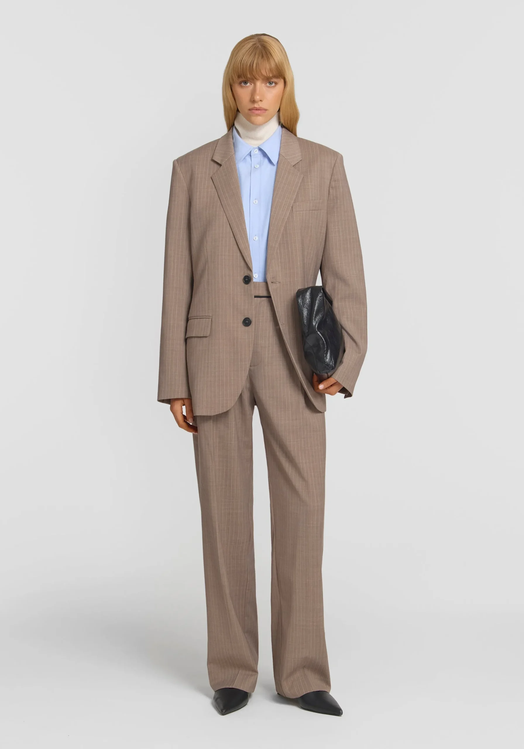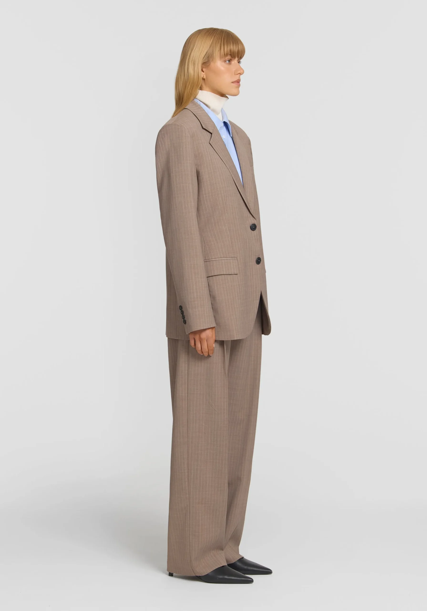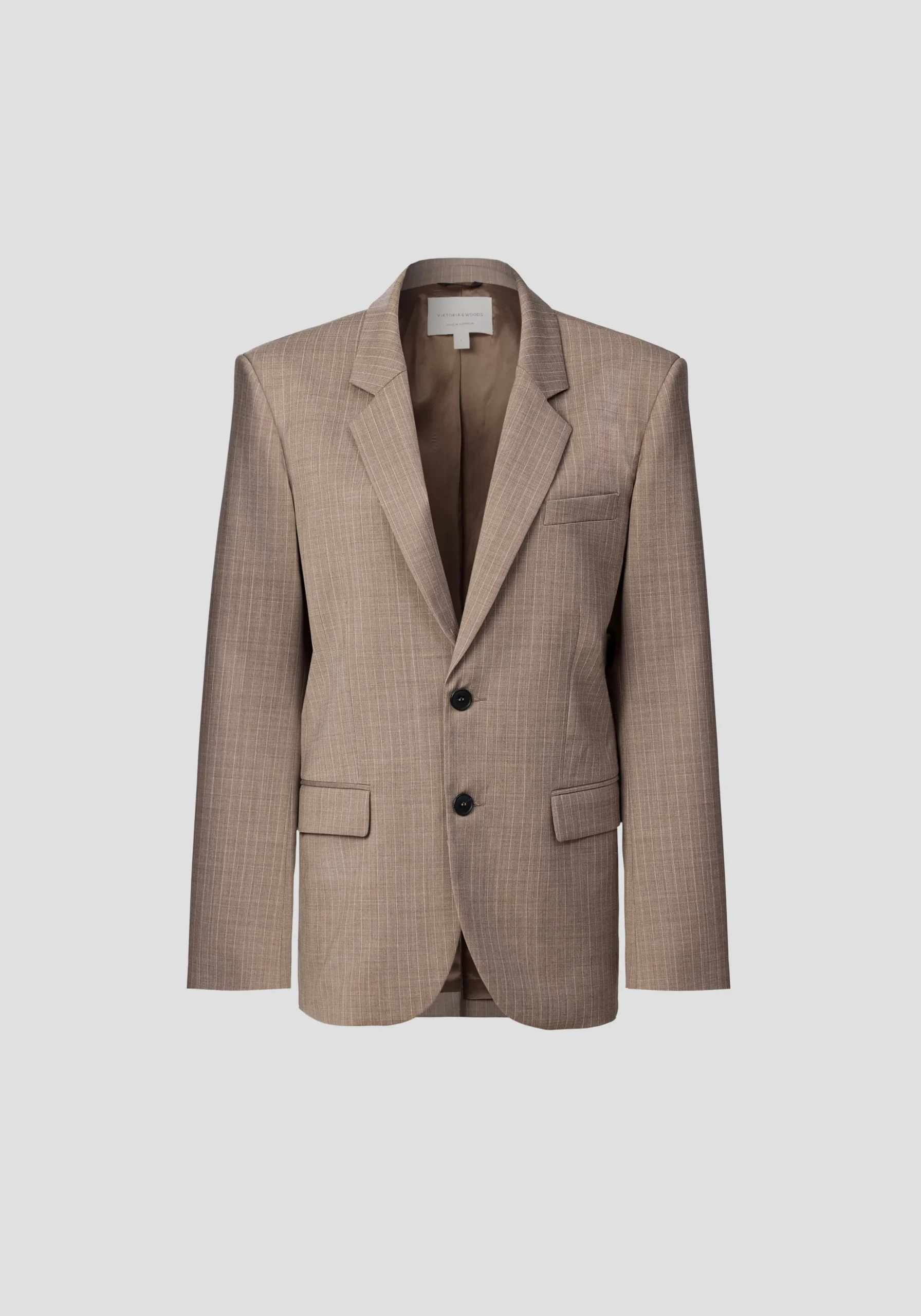 Add dimension to your outfitting with the Marmaduke Unisex Blazer, crafted from a wool blend in a timeless brown pinstripe. Featuring a single breasted, relaxed silhouette, it’s detailed with pocket accents, a centre back vent, and V&W logo buttons. Fusing masculine and feminine elements, it pairs back with the Archibold Unisex Trouser for an effortlessly considered suiting moment.MADE IN AUSTRALIA