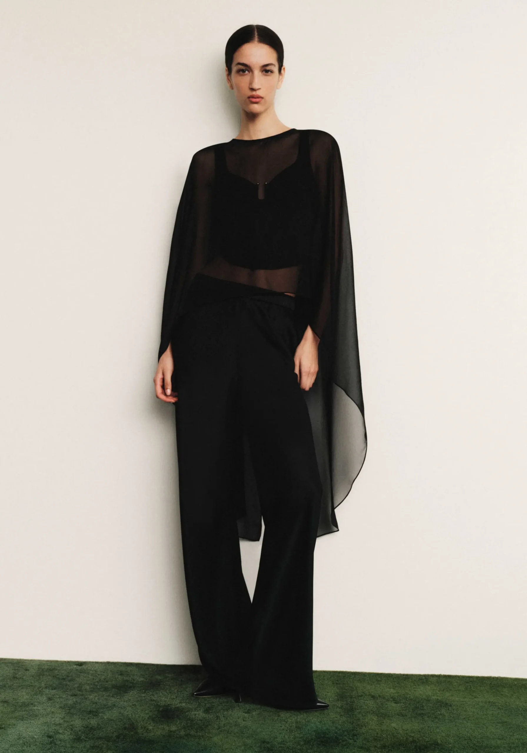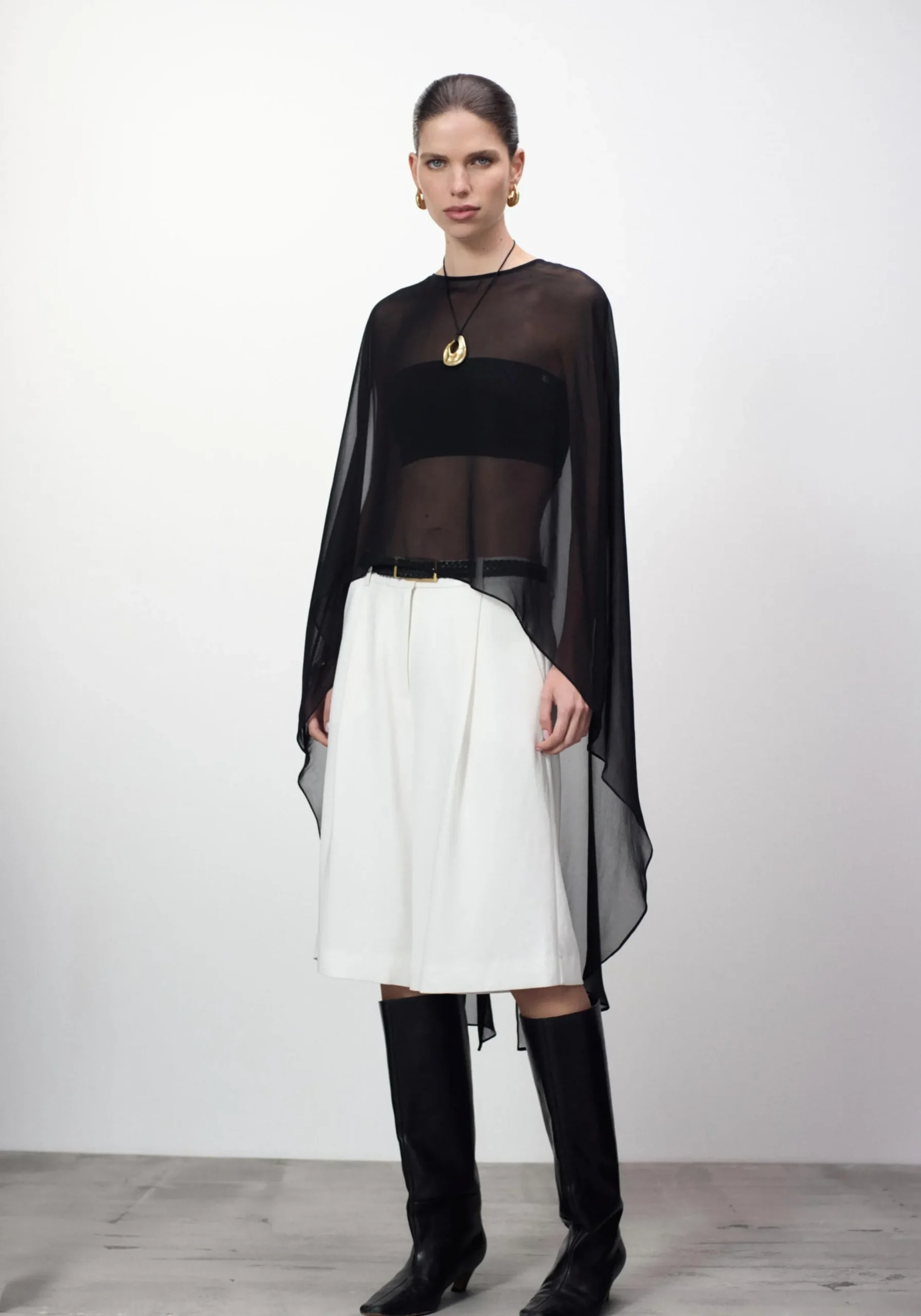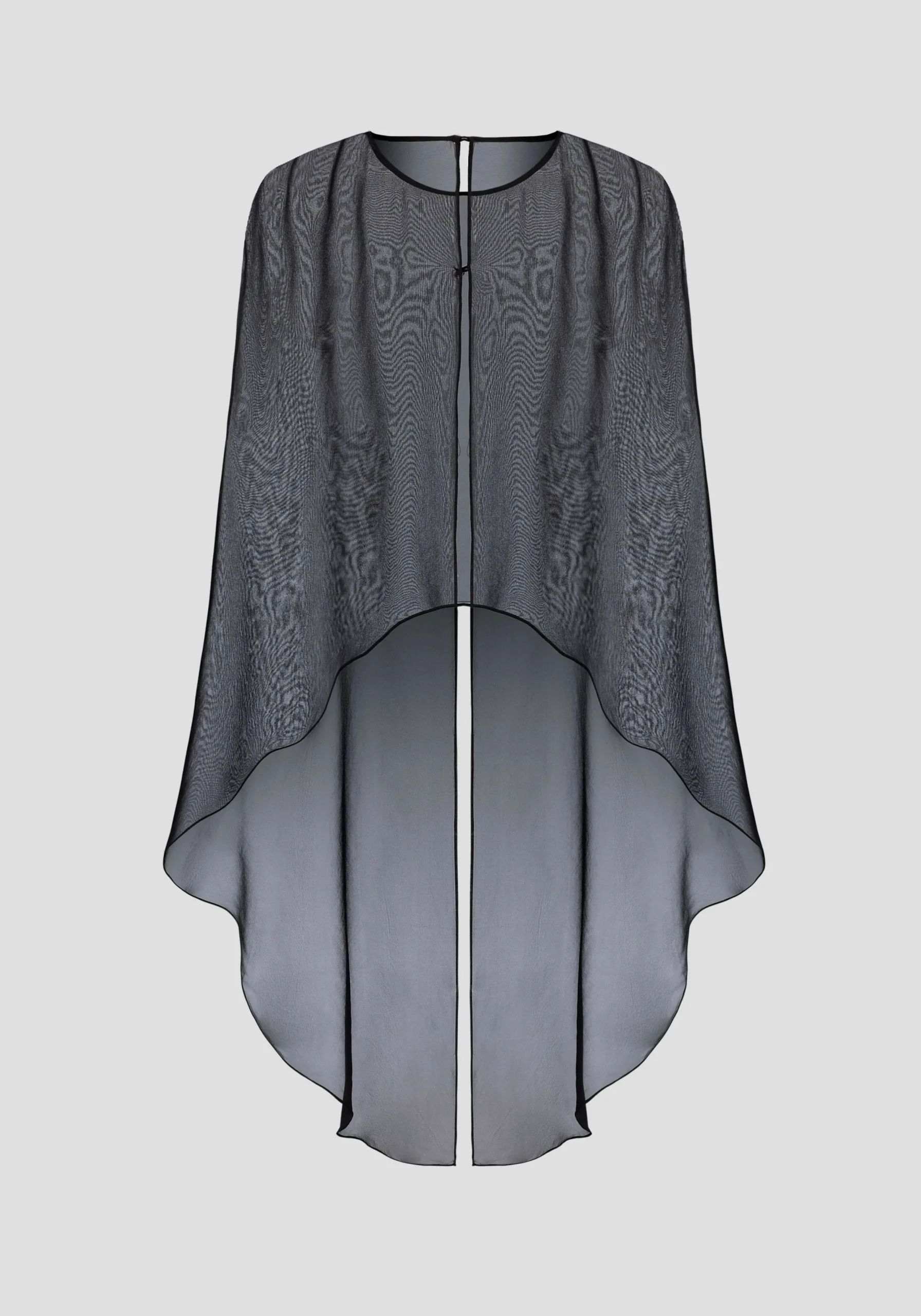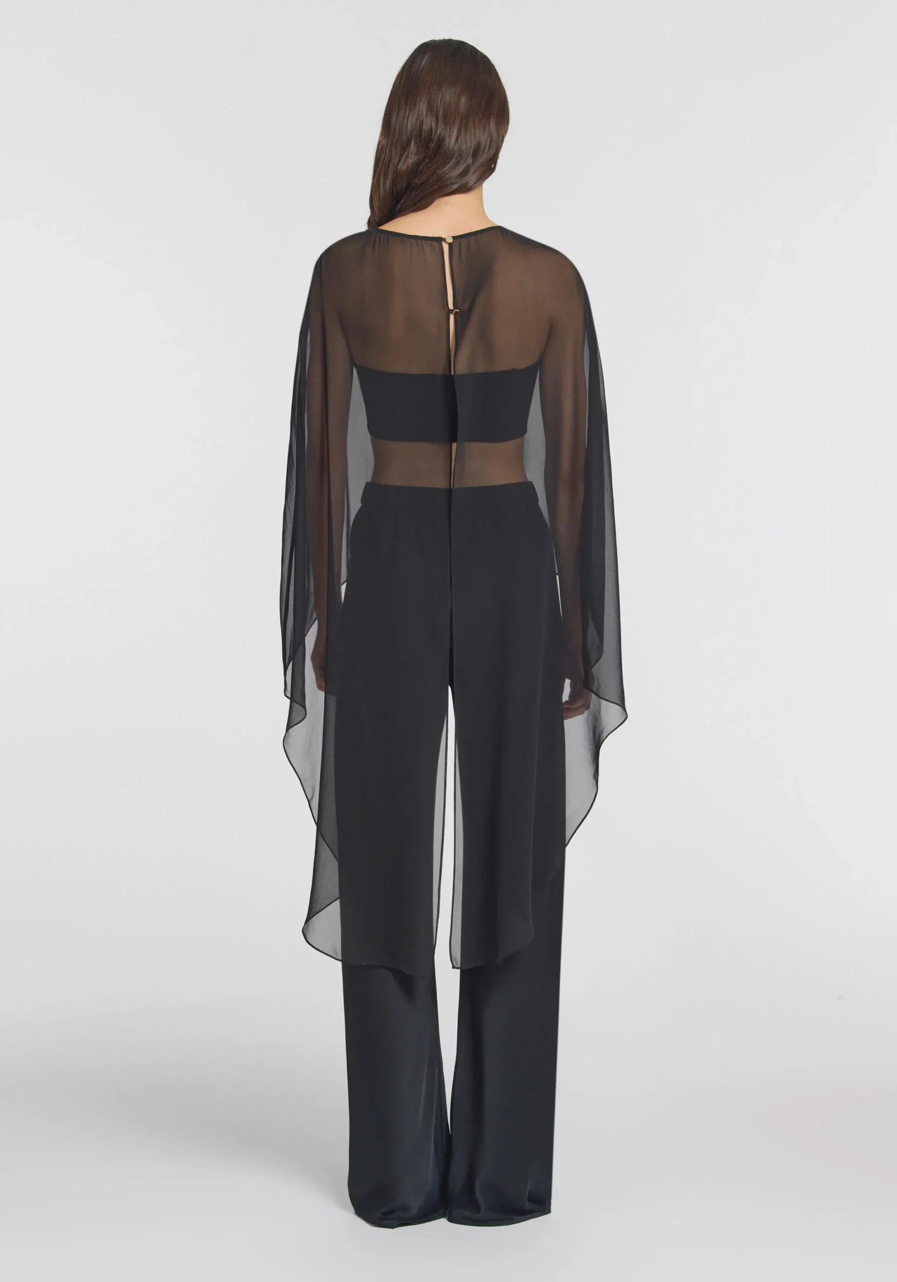 Exude ethereal femininity in the Holliday Cape Top, crafted from black silk georgette. Falling longer at the back with a soft waterfall drape, it captures the essence of fluidity in luxurious sheer detailing. Pair with V&W Foundation undergarments for effortless wear.MADE IN AUSTRALIA