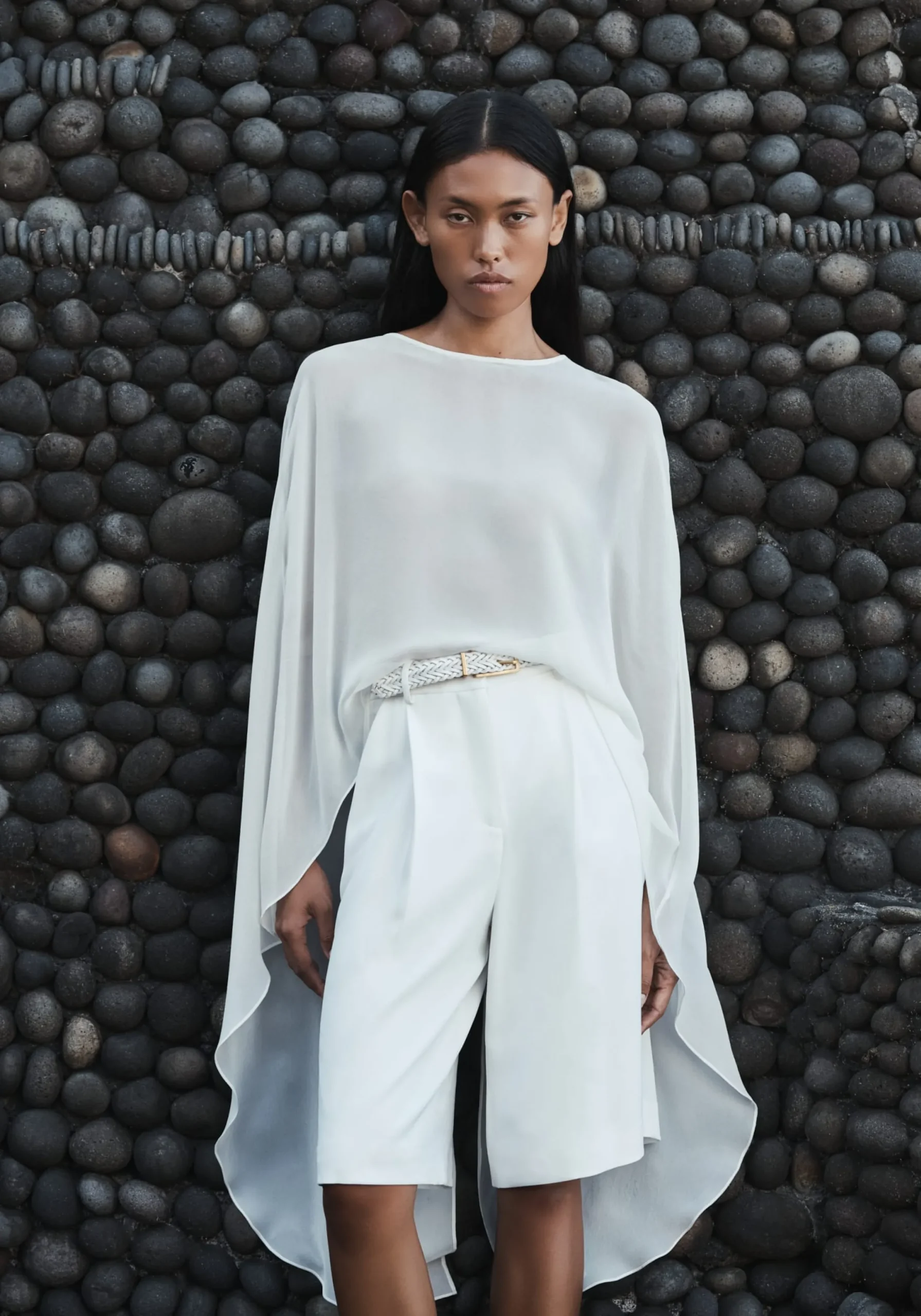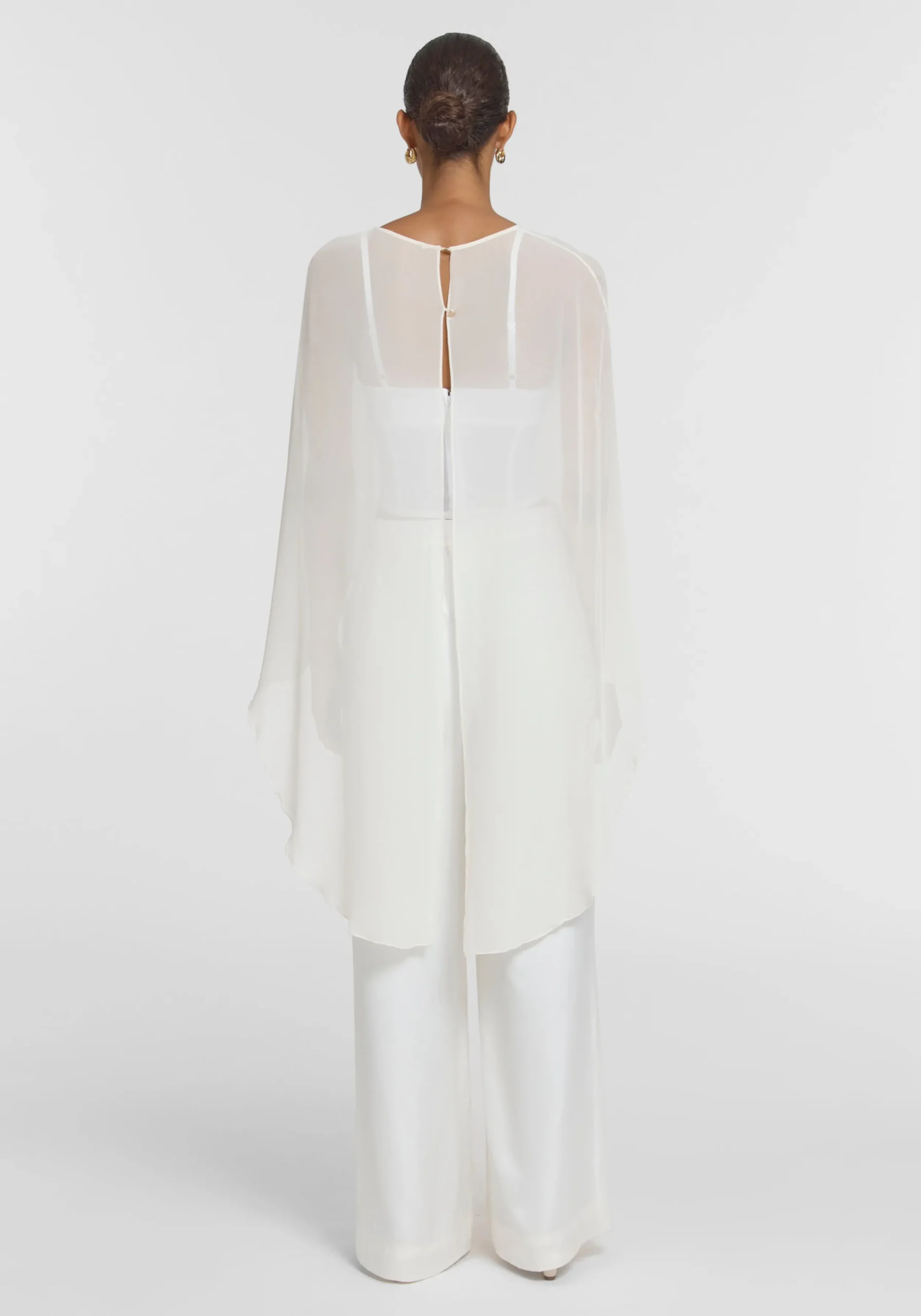 Exude ethereal femininity in the Holliday Cape Top, crafted from ivory silk georgette. Falling longer at the back with a soft waterfall drape, it captures the essence of fluidity in luxurious sheer detailing. Pair with the Omega Bustier or V&W Foundation undergarments for effortless wear. MADE IN AUSTRALIA