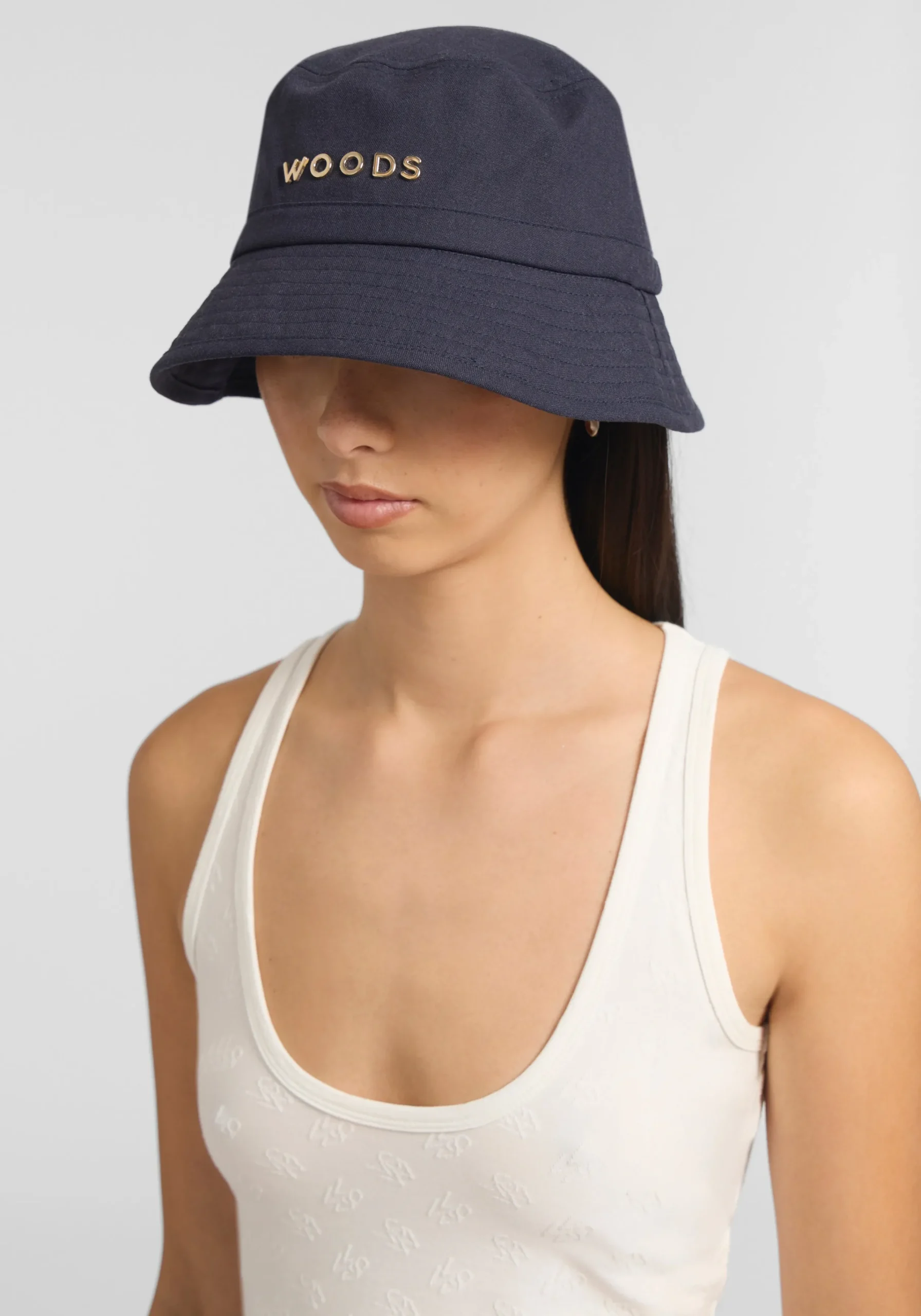 The Woods Metal Bucket Hat, crafted in black cotton, is an elevated essential for sun-soaked days. Designed for the art of escape, it showcases an embossed gold WOODS logo, an adjustable back drawcord, and multi-topstitch detailing around the brim.