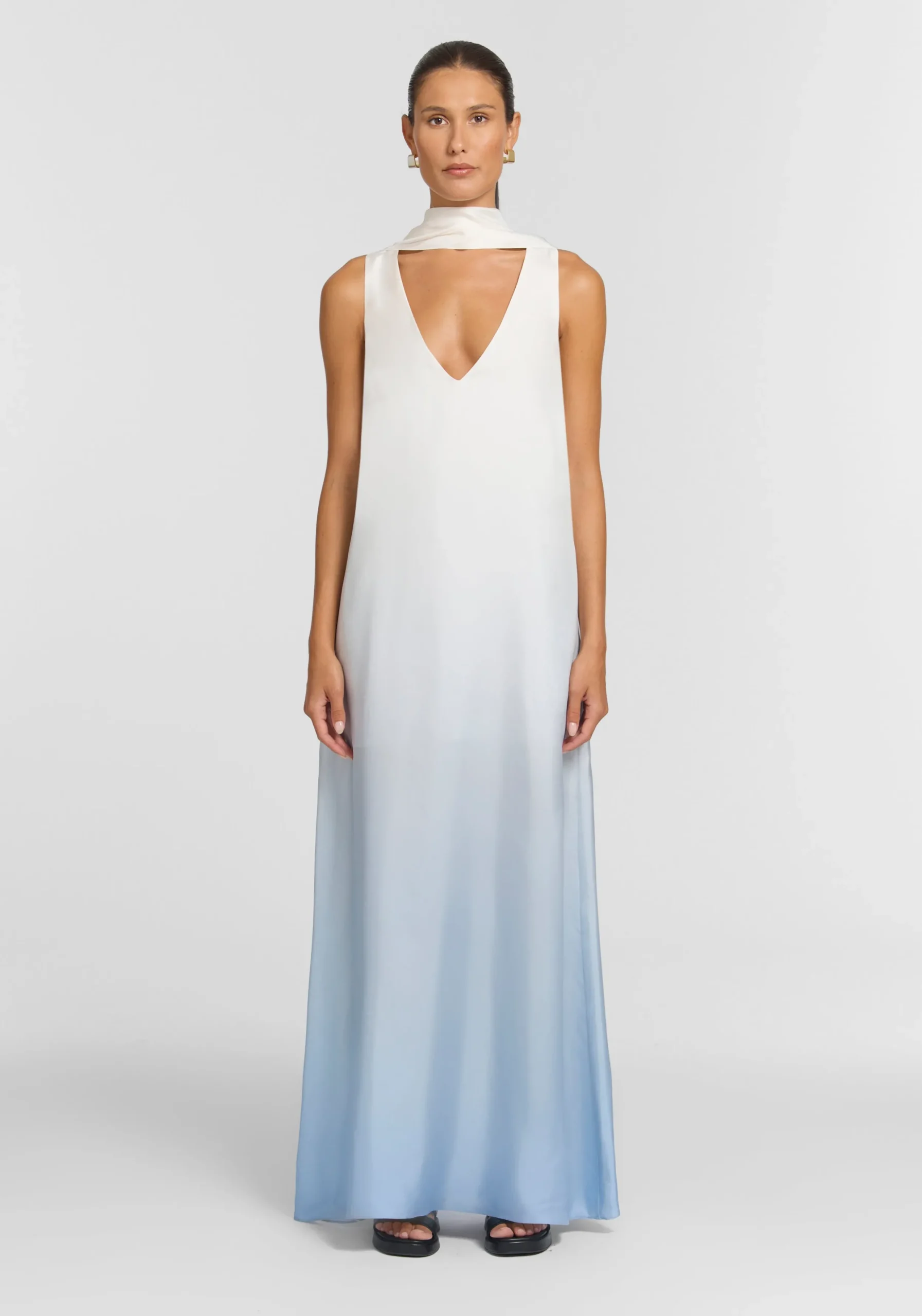 The Dreamland Dress echoes the waves of the sea, with deep blue washing into crisp white in a graceful silk ombré. This uncomplicated dress features a deep V-neckline and flows effortlessly into a soft A-line silhouette, with pockets discreetly concealed. Embodying the quiet luxury of calm, style it with the Asta Scarf for a serene statement.