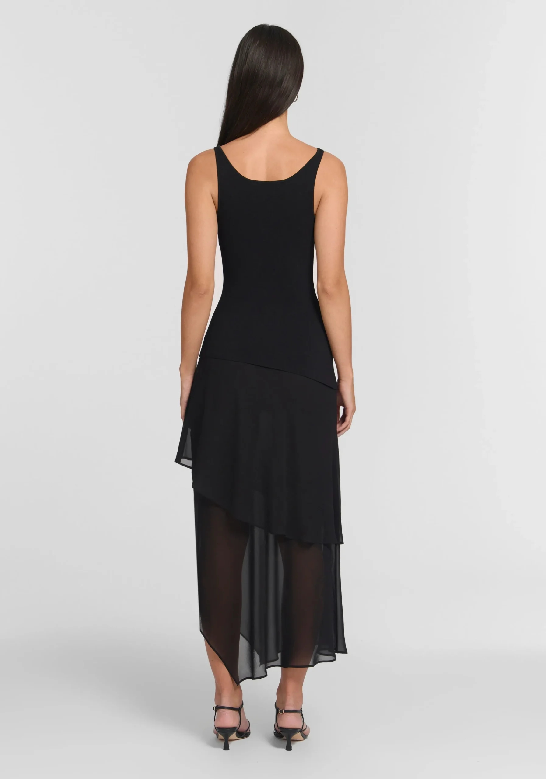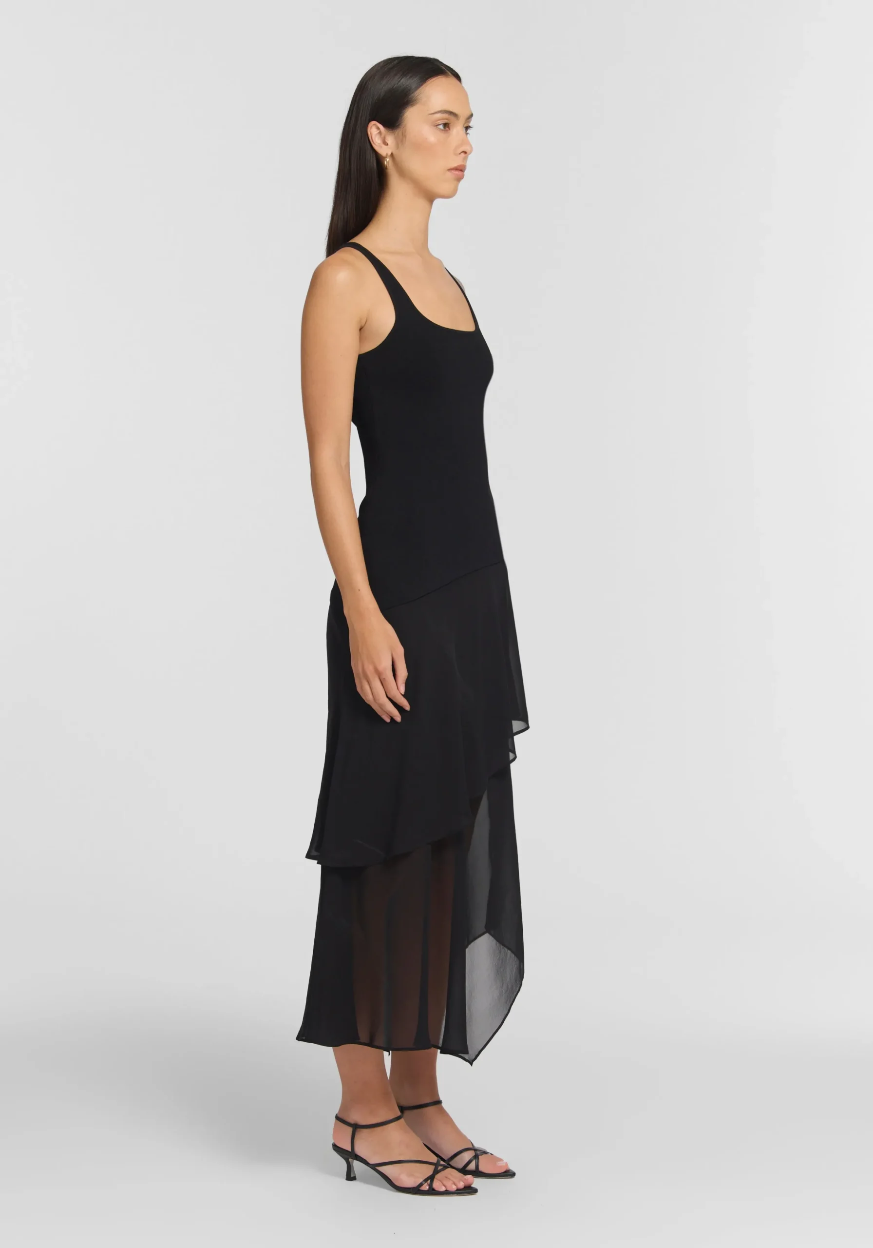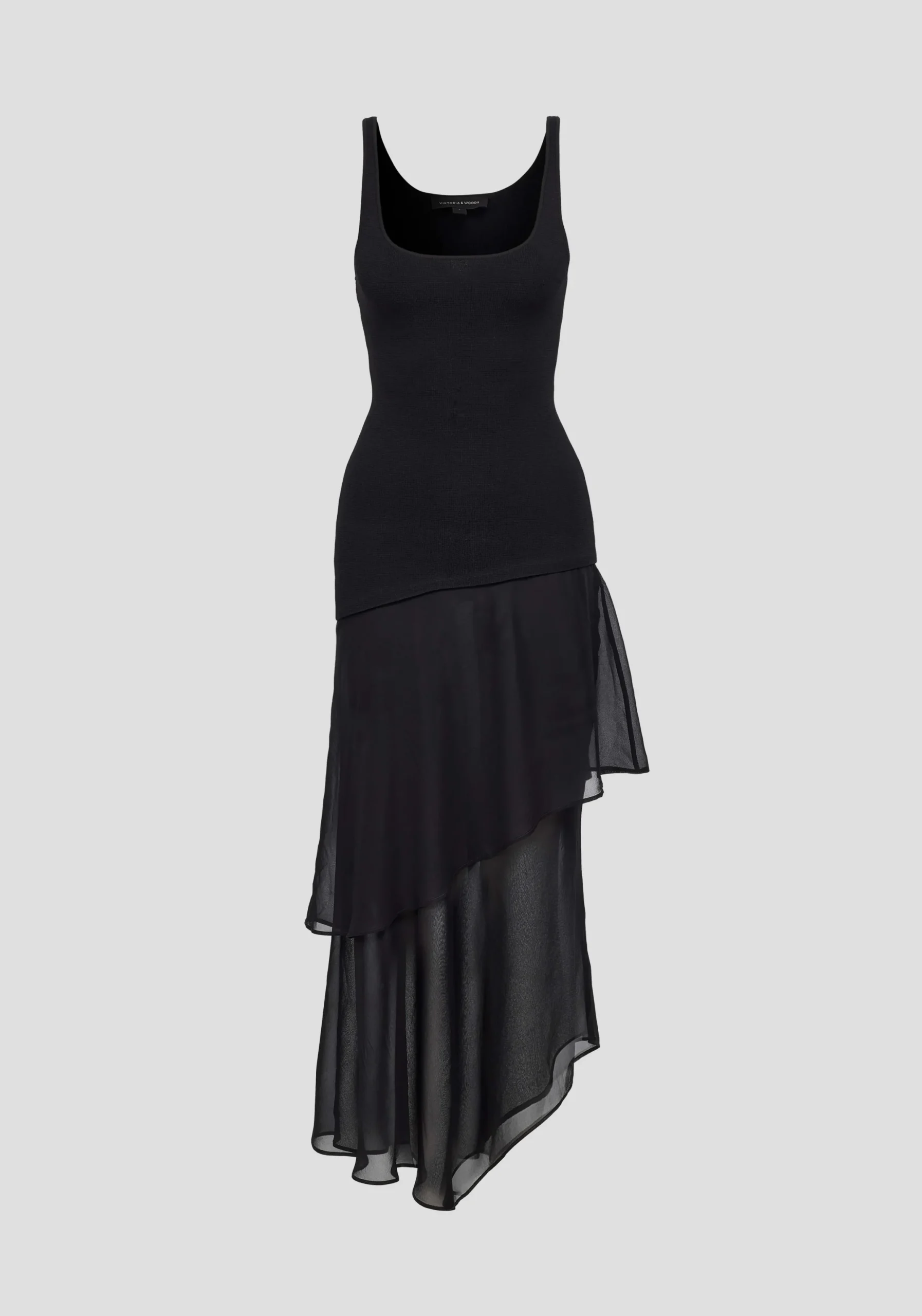 The Enamoured Dress offers structure and fluidity, crafted in a black milano stitch with subtle side boning and asymmetric shaping for effortless contouring. Spliced with silk georgette, it moves with ethereal layers and a softly sheer drape. Style with the Cleo Headscarf in black silk georgette to complete your look for your next event.