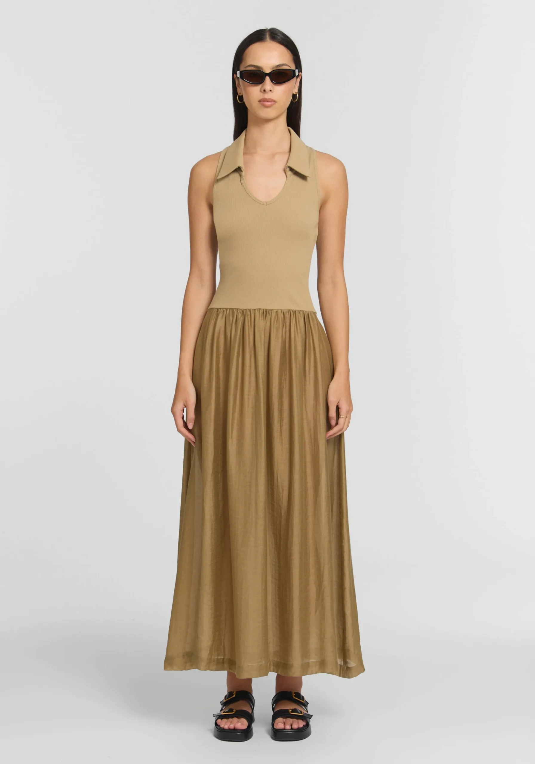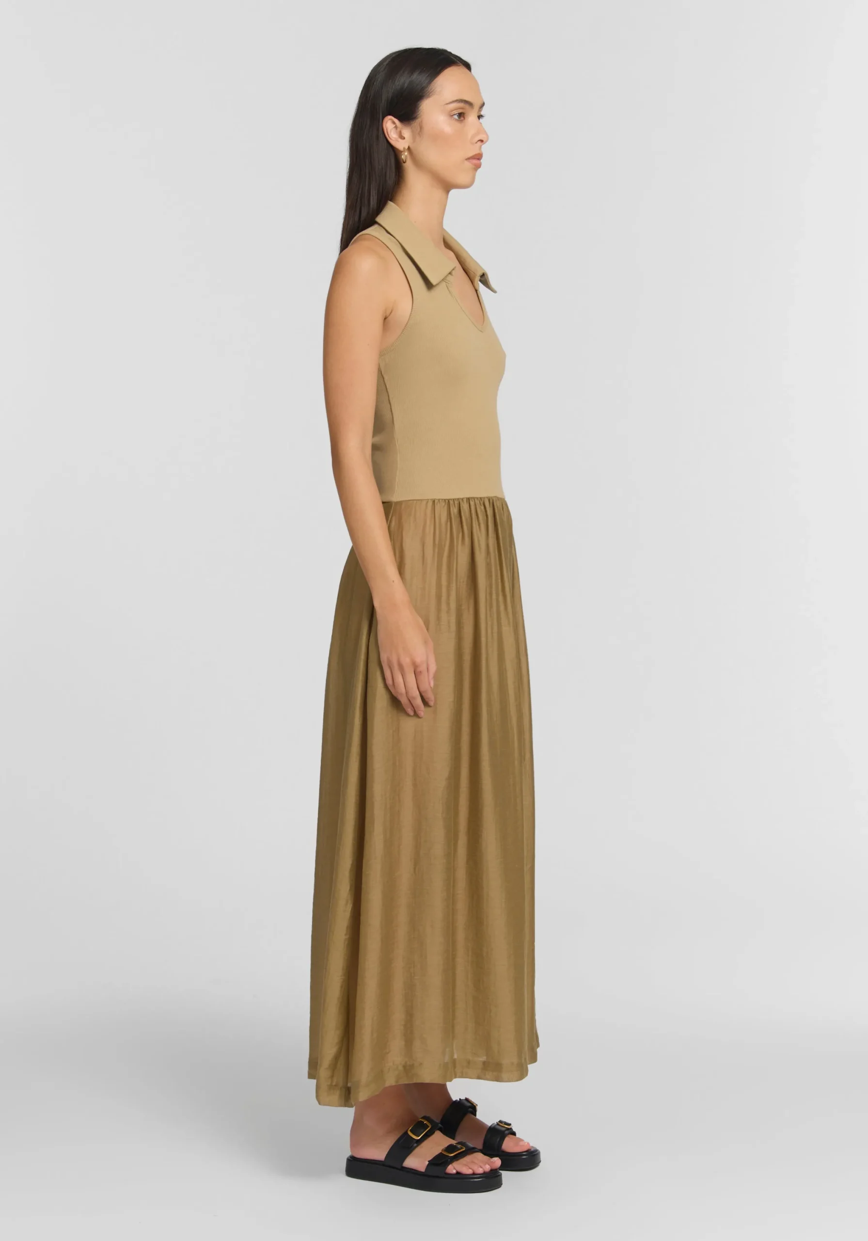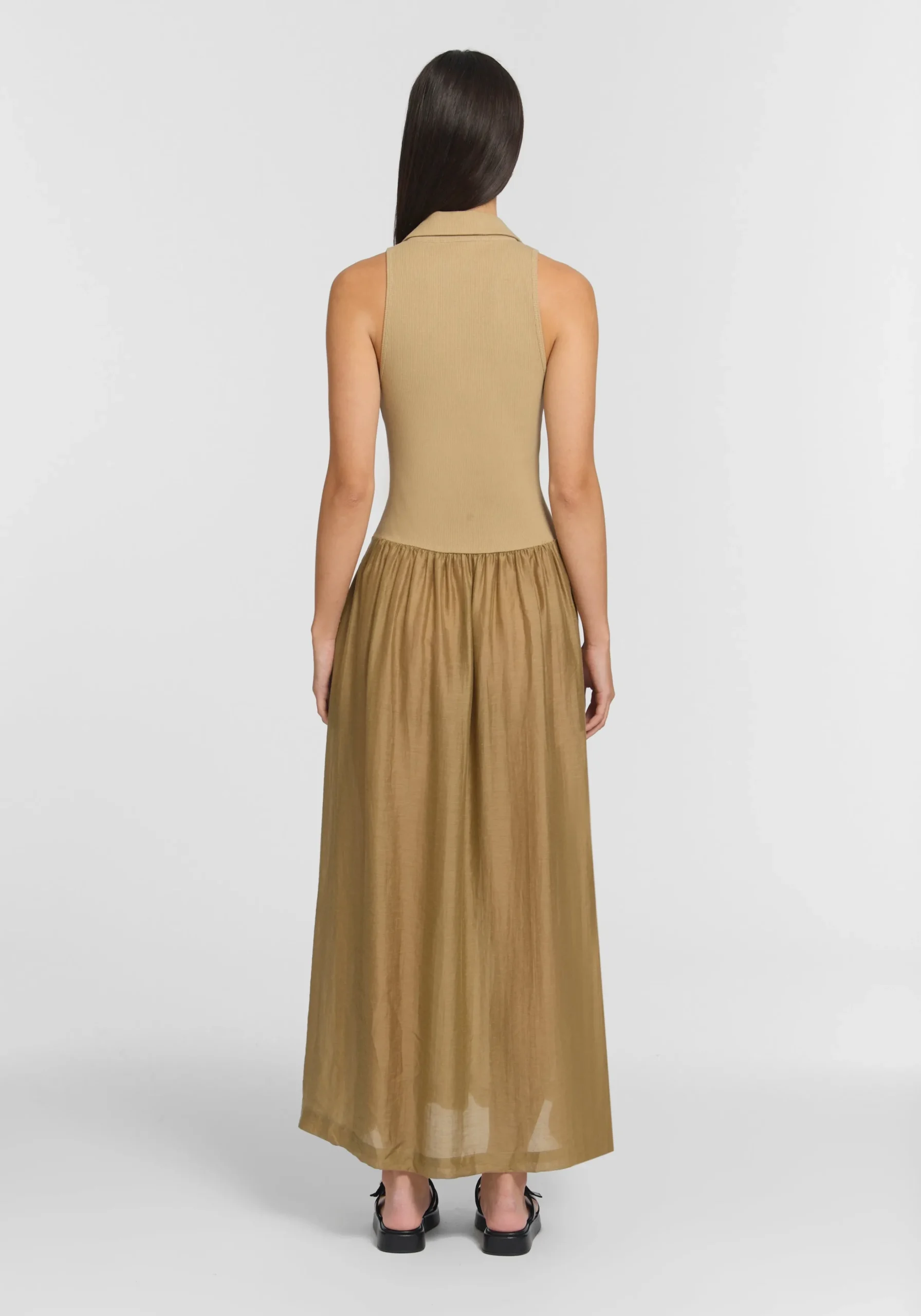 The Caretaker Dress, crafted in soft sage, offers a minimalist approach to summer dressing. Featuring a ribbed collar and a woven skirt with soft gathering at a slightly dropped waist, its pull-on style delivers uncomplicated, elevated ease, balancing pure form with quiet functionality.MADE IN AUSTRALIA