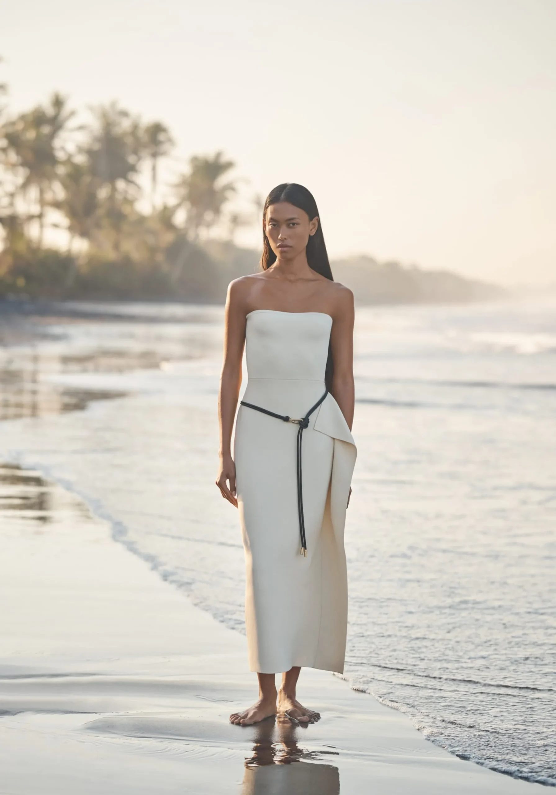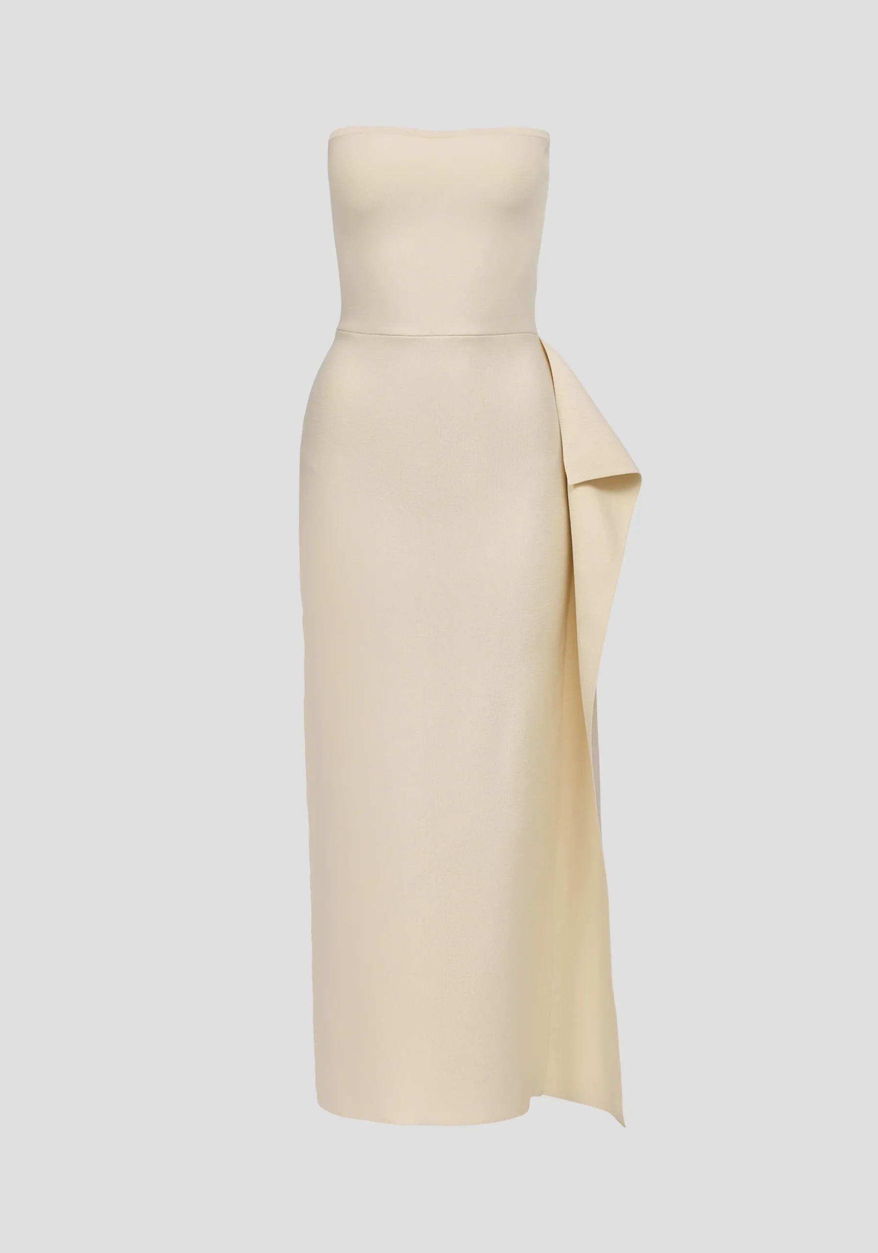 The Honeydew Dress, in a warm buttermilk hue, offers a simple strapless silhouette imbued with effortless sophistication – designed for resort event dressing. Crafted from structured milano knit with light boning, it holds a defined shape, while a subtle side seam ruffle introduces architectural detail for an understated statement.