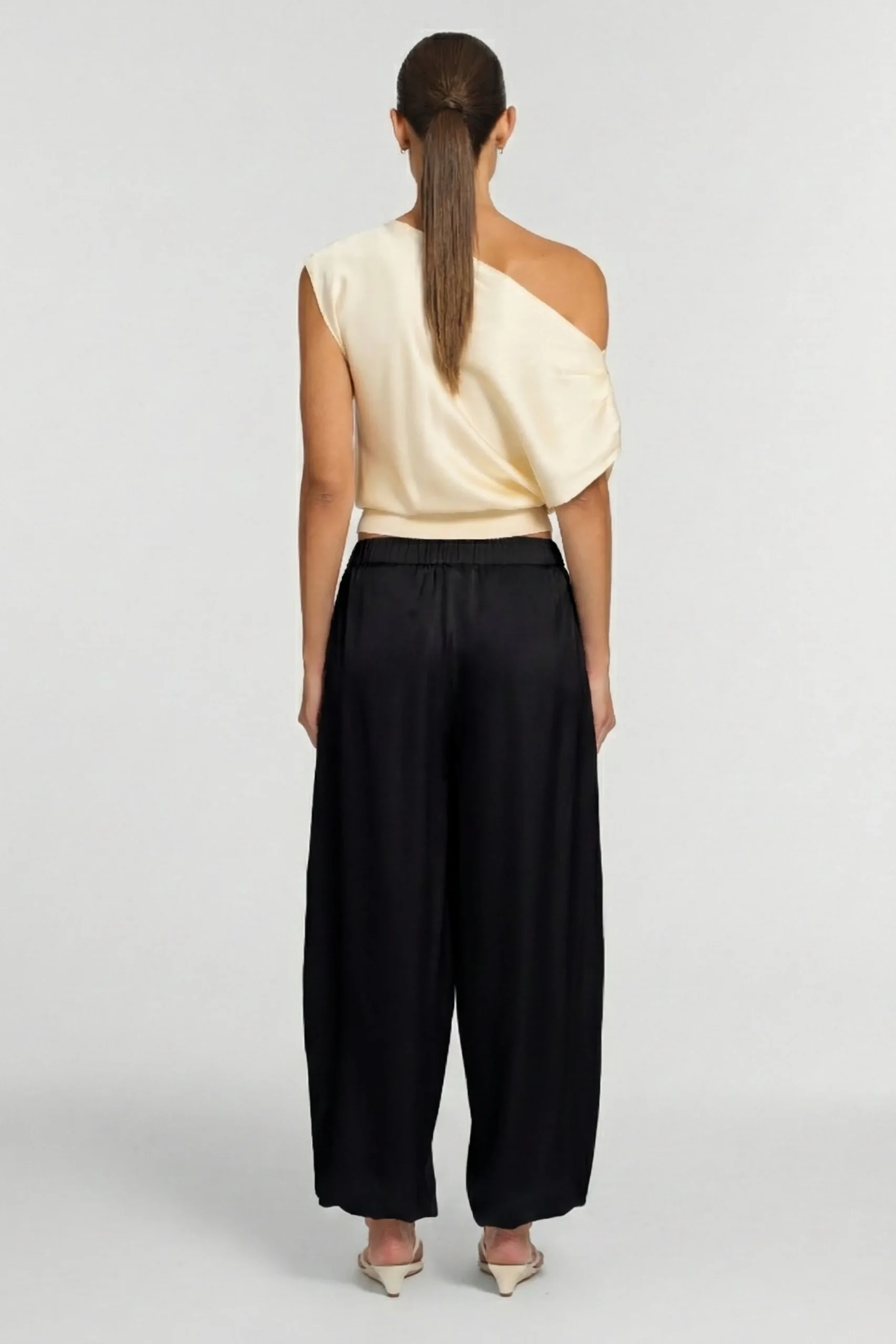 The Duetto Trouser, crafted in our signature cupro blend in black, offers relaxed elevation and a refreshing point of interest. Designed with a mid-rise, genie-inspired balloon leg silhouette, it features an elasticated waistband, pockets, and an elasticated cuff that can be worn long or adjusted for varied lengths.MADE IN AUSTRALIA