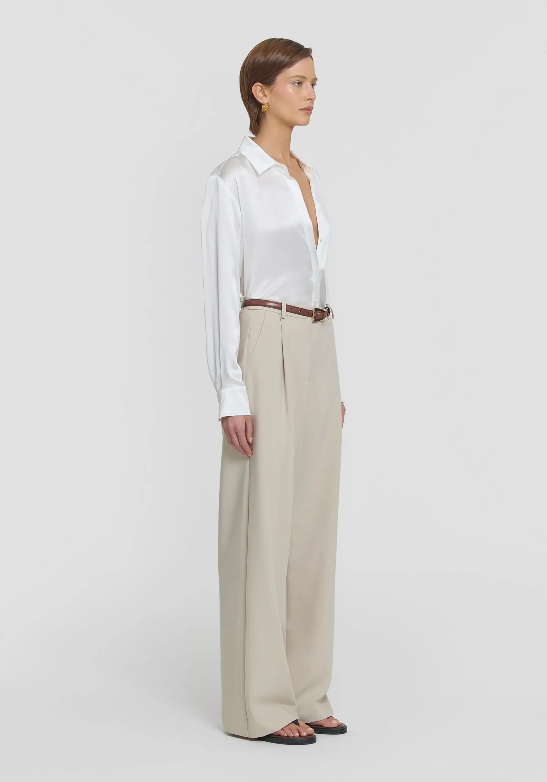 An elevated classic, the Idol Pant is crafted in a soft rayon blend fabrication in a subtle neutral hue. Falling to a full length and wide leg silhouette, this style features front tucks and functional angled side pockets, pairing perfectly with tailored blazers and shirting for effortless styling. MADE IN AUSTRALIA