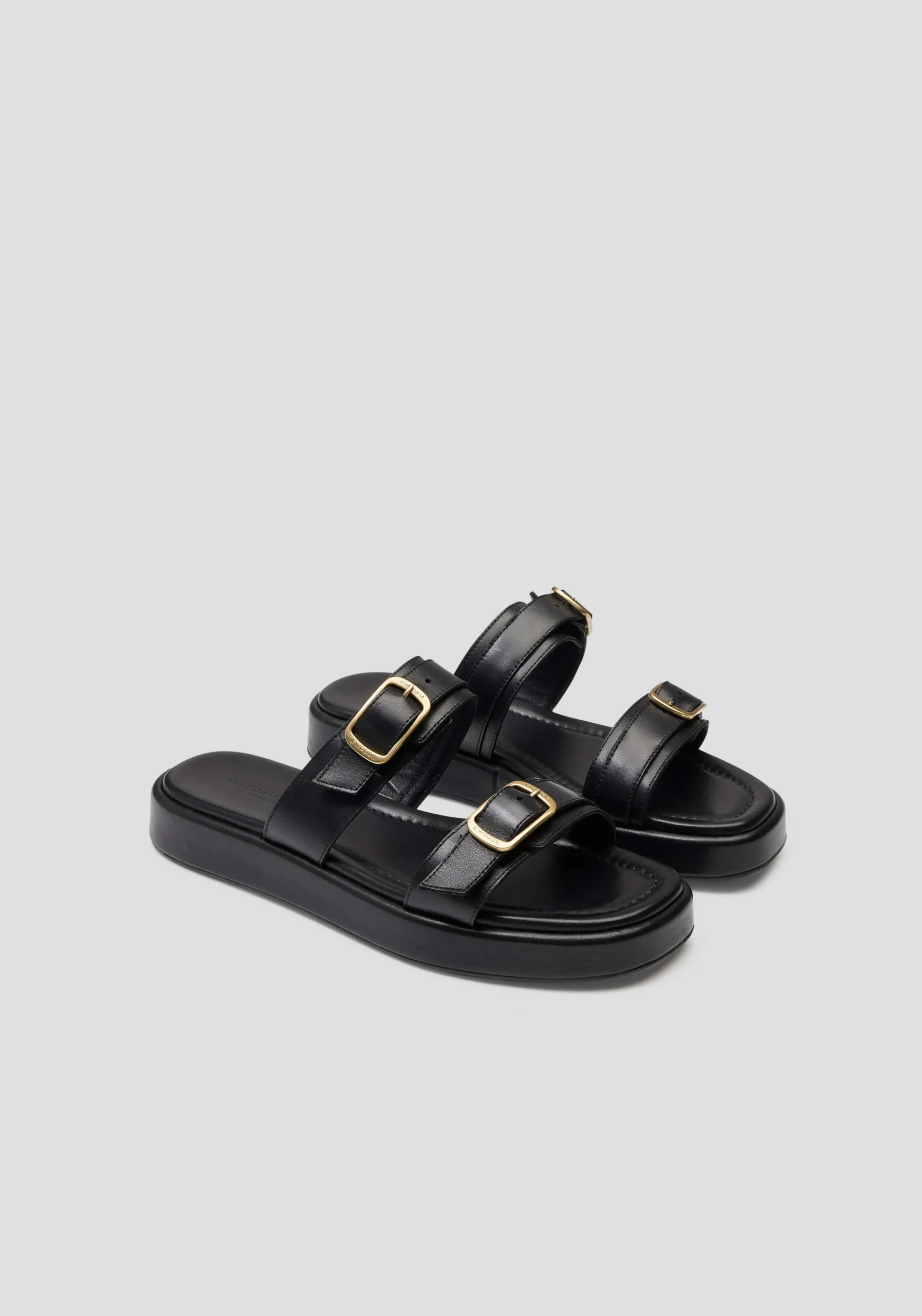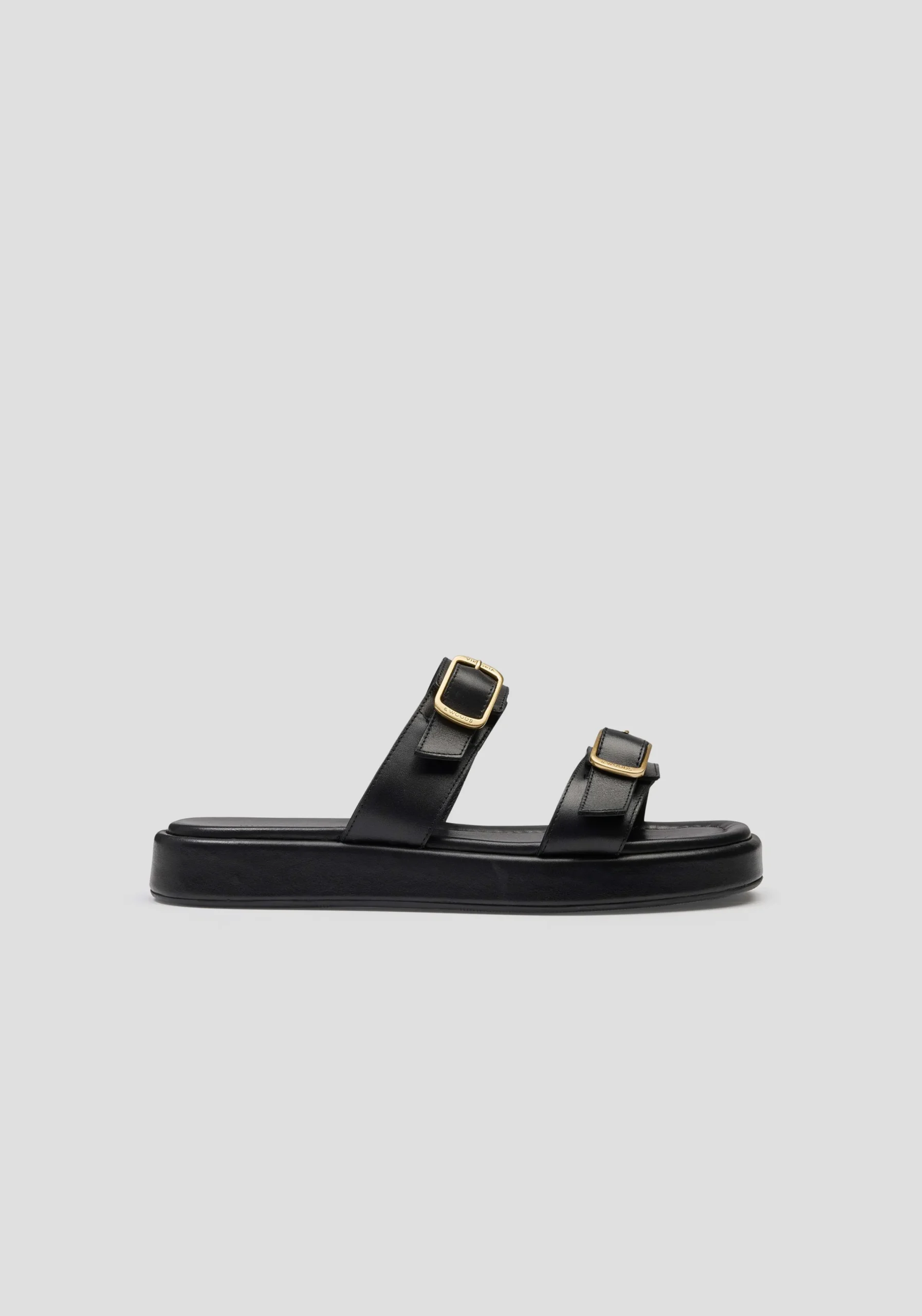The Rowan Sandal is your new summer sandal, crafted in black leather for enduring style. Designed with a chunky platform sole and double adjustable straps with antique gold branded buckles, it’s made for effortless everyday wear and destination dressing.