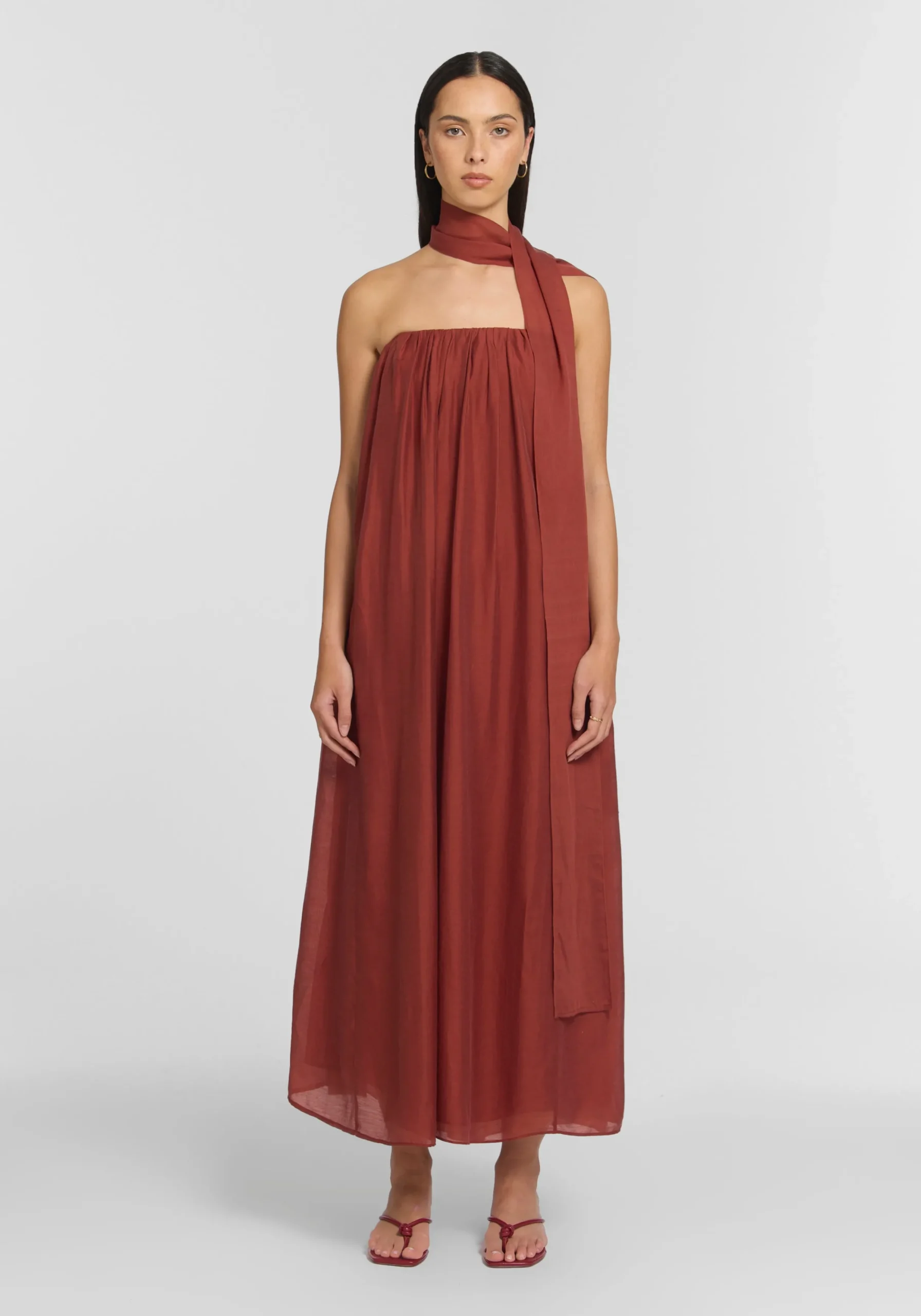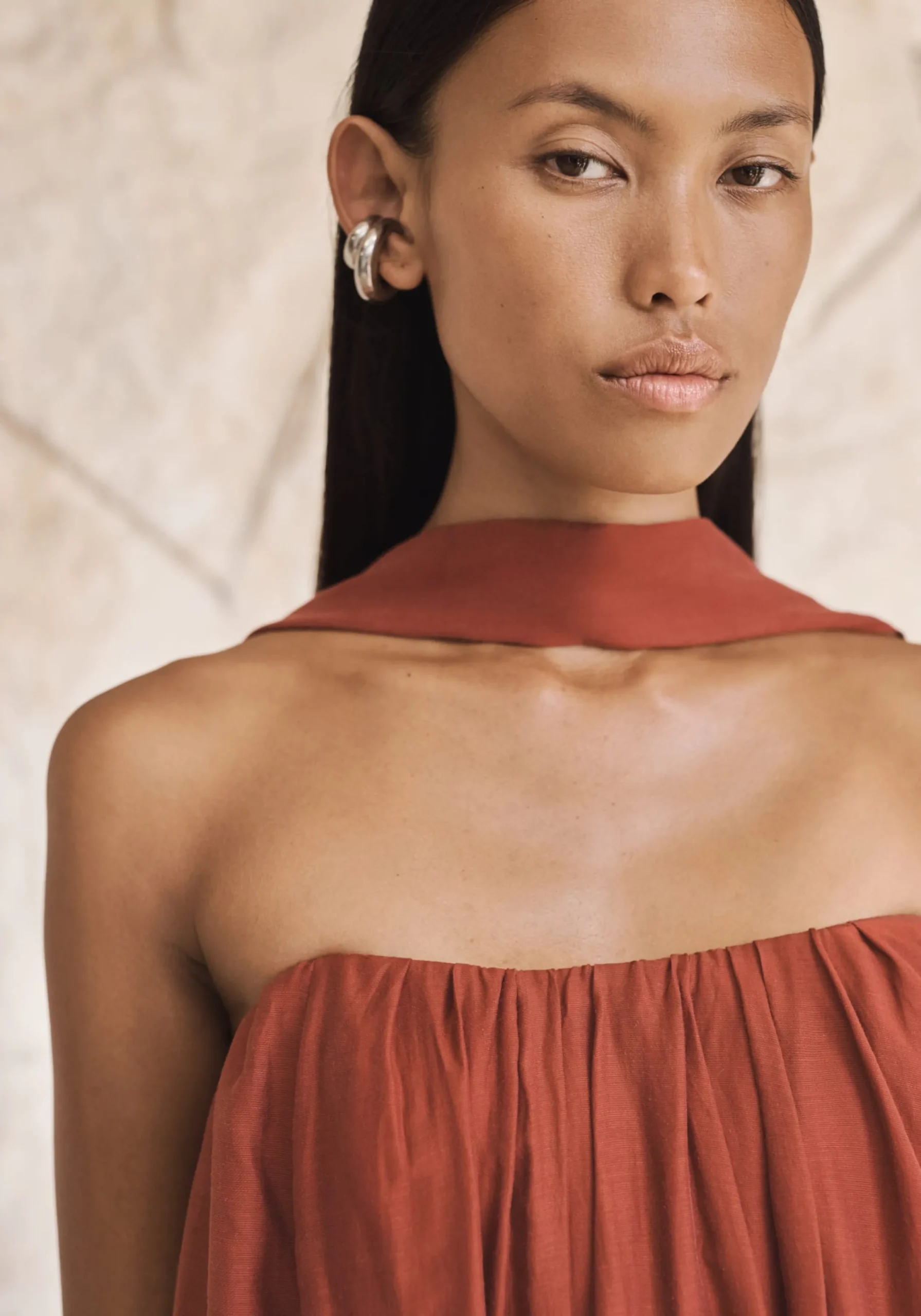 The Vale Scarf, a modern accessory crafted from a linen blend in a deep red hue, offers versatile styling as a headscarf, top, neck piece, hair accessory, or handbag tie – infusing spirited individuality into any outfit. Pair with the Beaumont Dress for a sculptural statement, perfect for your next event or elevated resort-season styling.MADE IN AUSTRALIA