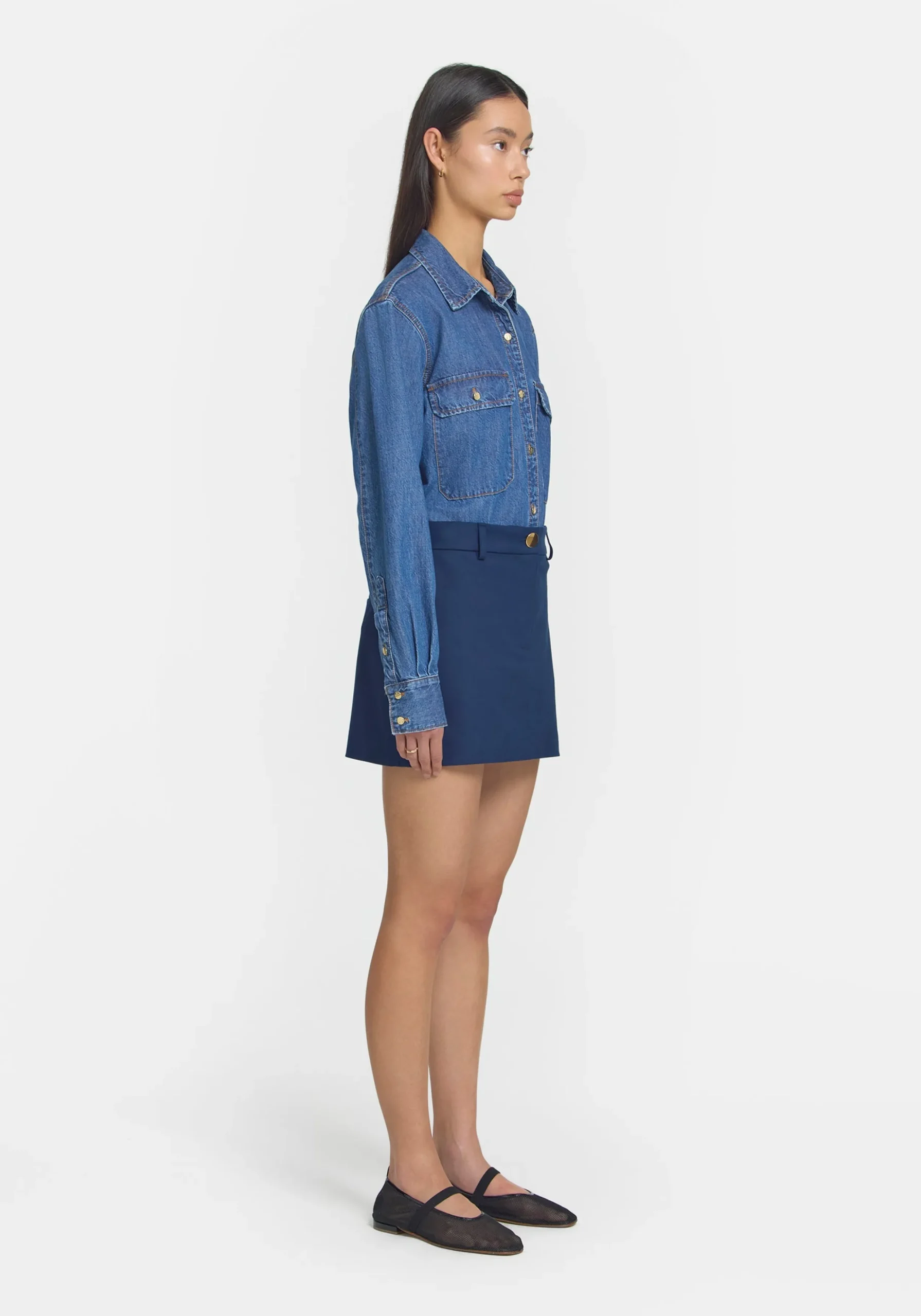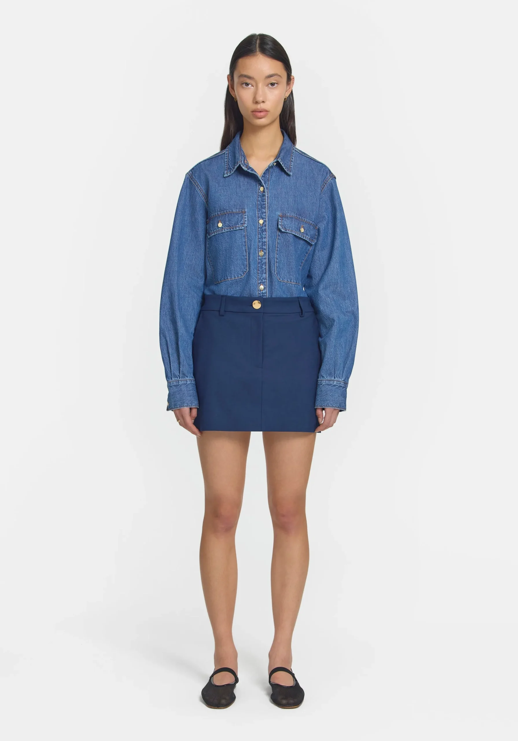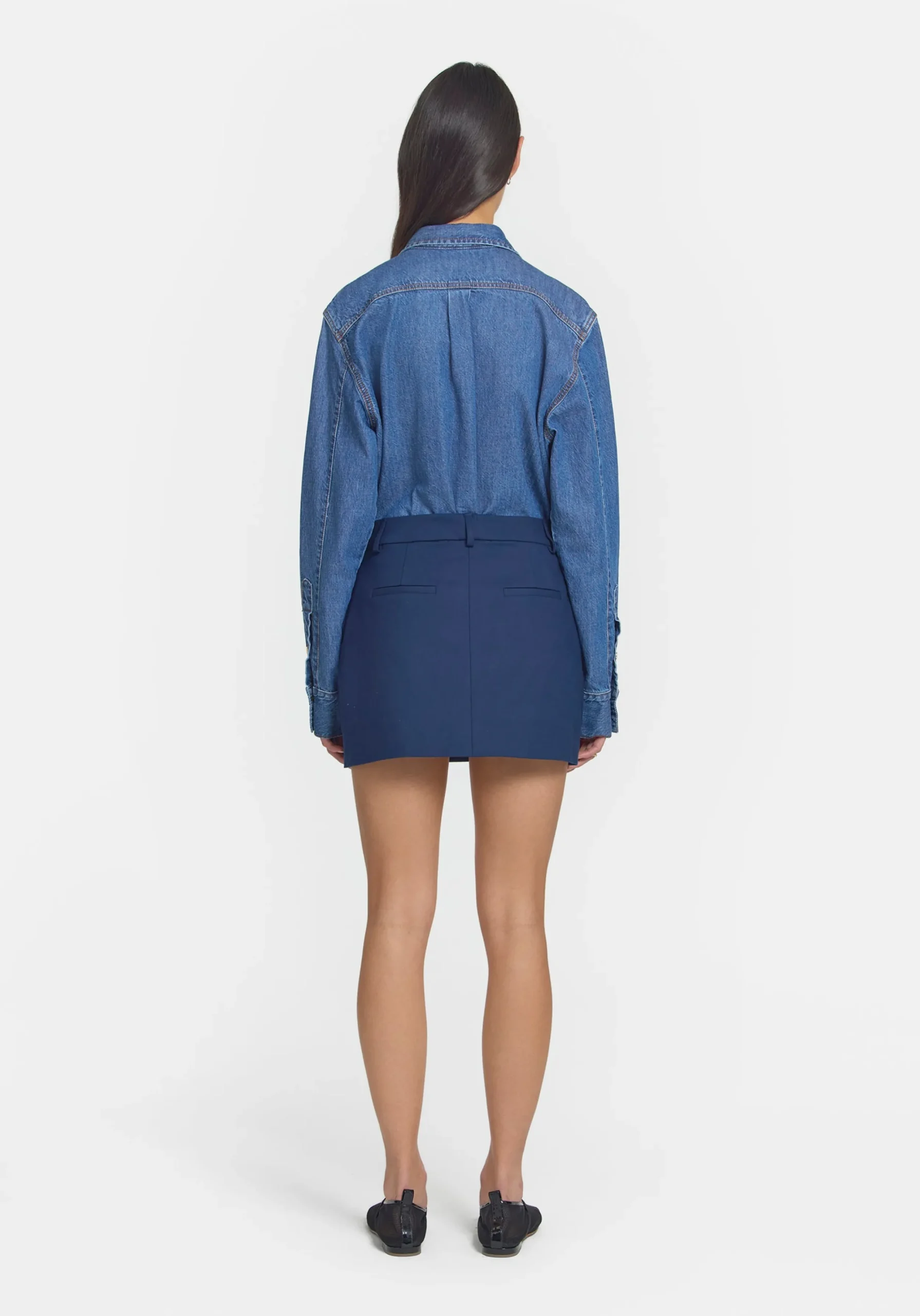 Update your tailoring with the Epilogue Skirt, a sophisticated take on a signature silhouette. In a classic navy hue, this mini-length skirt features angled front pockets, and a gold V&W logo button for an elegant touch. Style it with the Prelude Shirt or Trilogy Blazer for a chic coordinated look.MADE IN AUSTRALIA