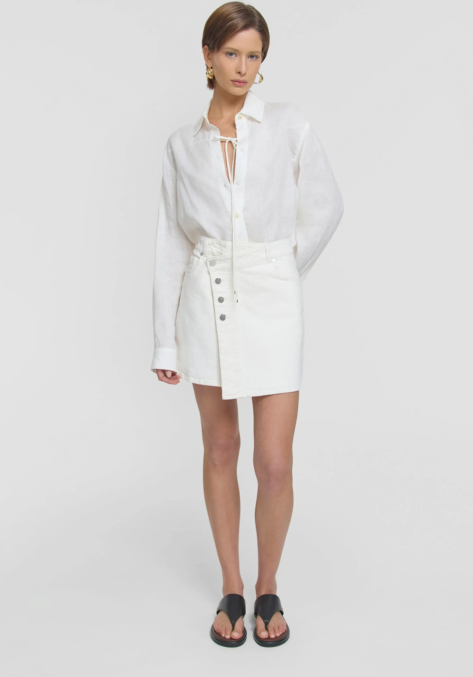 A modern update to the classic denim skirt, the Mustang Skirt is crafted from ivory stretch denim and boasts a high-waisted, mini-length A-line profile. Featuring a front wrap detail and adorned with a tan leather patch and logo buttons, this skirt effortlessly fuses style and comfort for chic, on-the-go dressing.MADE IN AUSTRALIA
