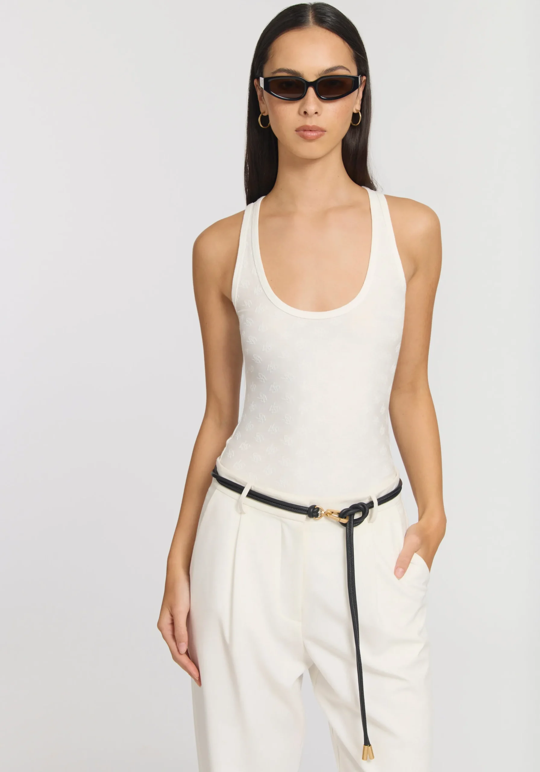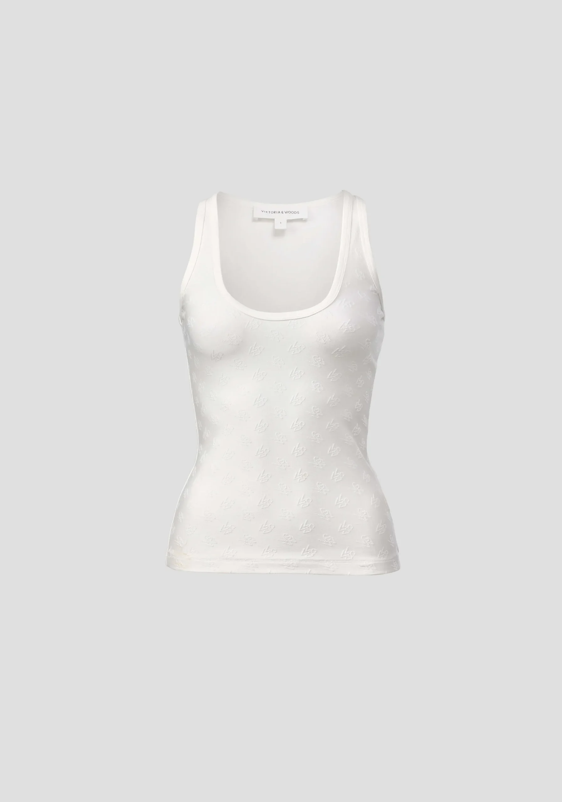 Introducing the Saint Tank, a seasonless basic for the modern wardrobe. This effortless white tank features a fitted silhouette, scooped neckline, and fun V&W jacquard detailing. The perfect first layer for everyday dressing, it fuses refined simplicity with a considered touch.