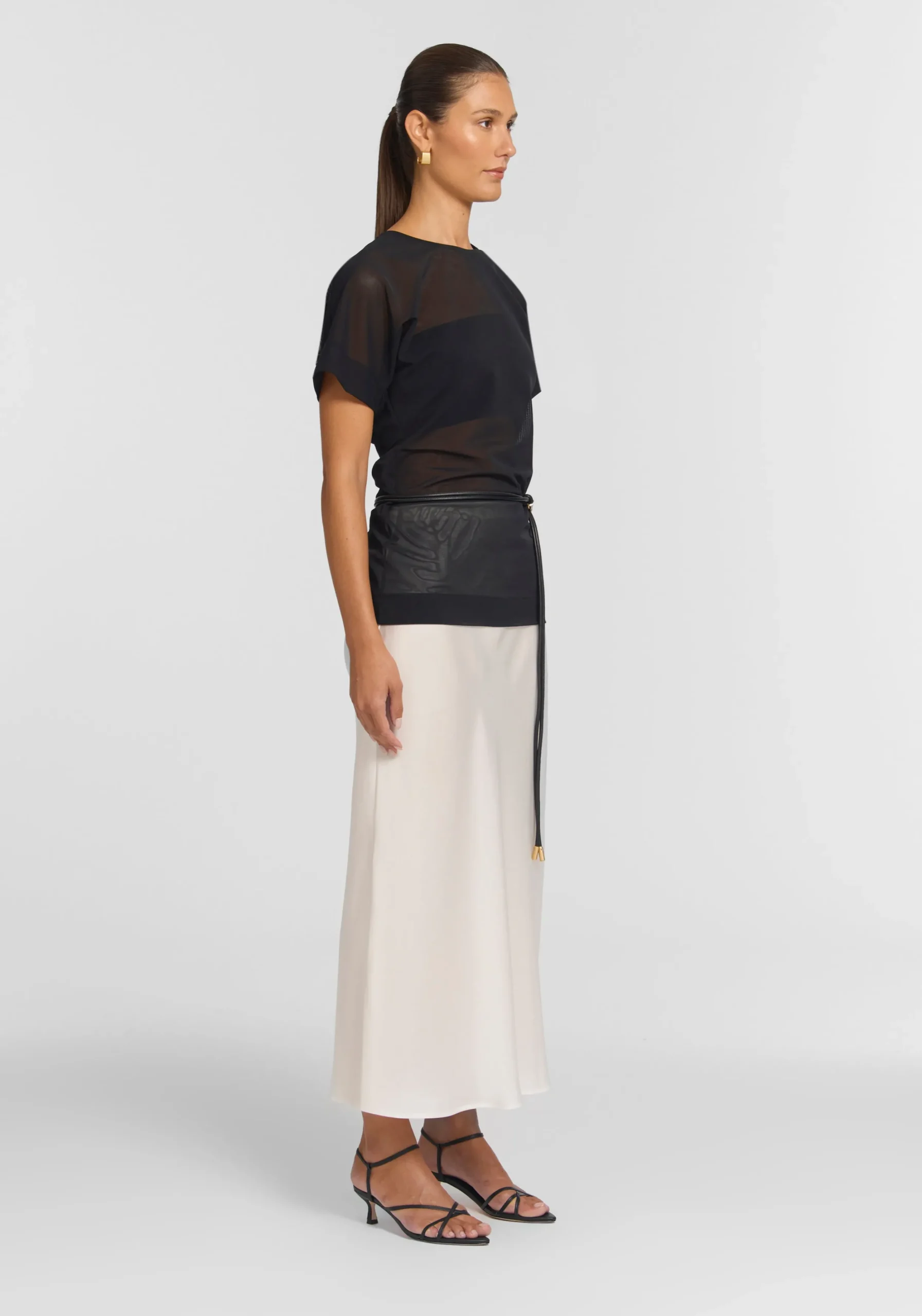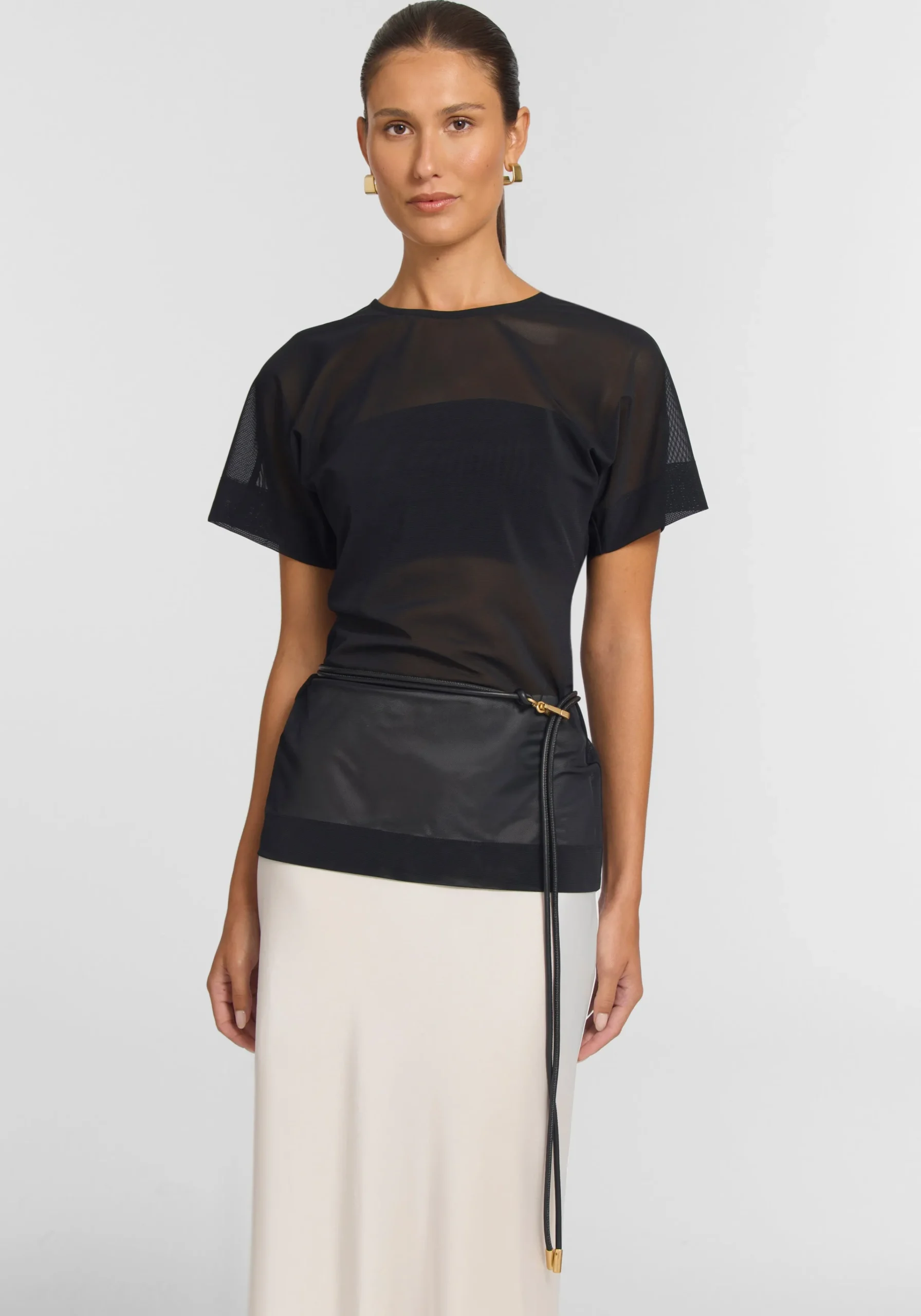 An elevated essential, the Polaris Top is crafted from our signature V&W Powermesh in black, fusing elevated ease with modern proportions. Defined by an extended shoulder silhouette and crew neckline, this structured tee features back waist tucks that cinch the waist. Pair with the V&W Foundation Bandeau in black for seamless, sheer styling.MADE IN AUSTRALIA