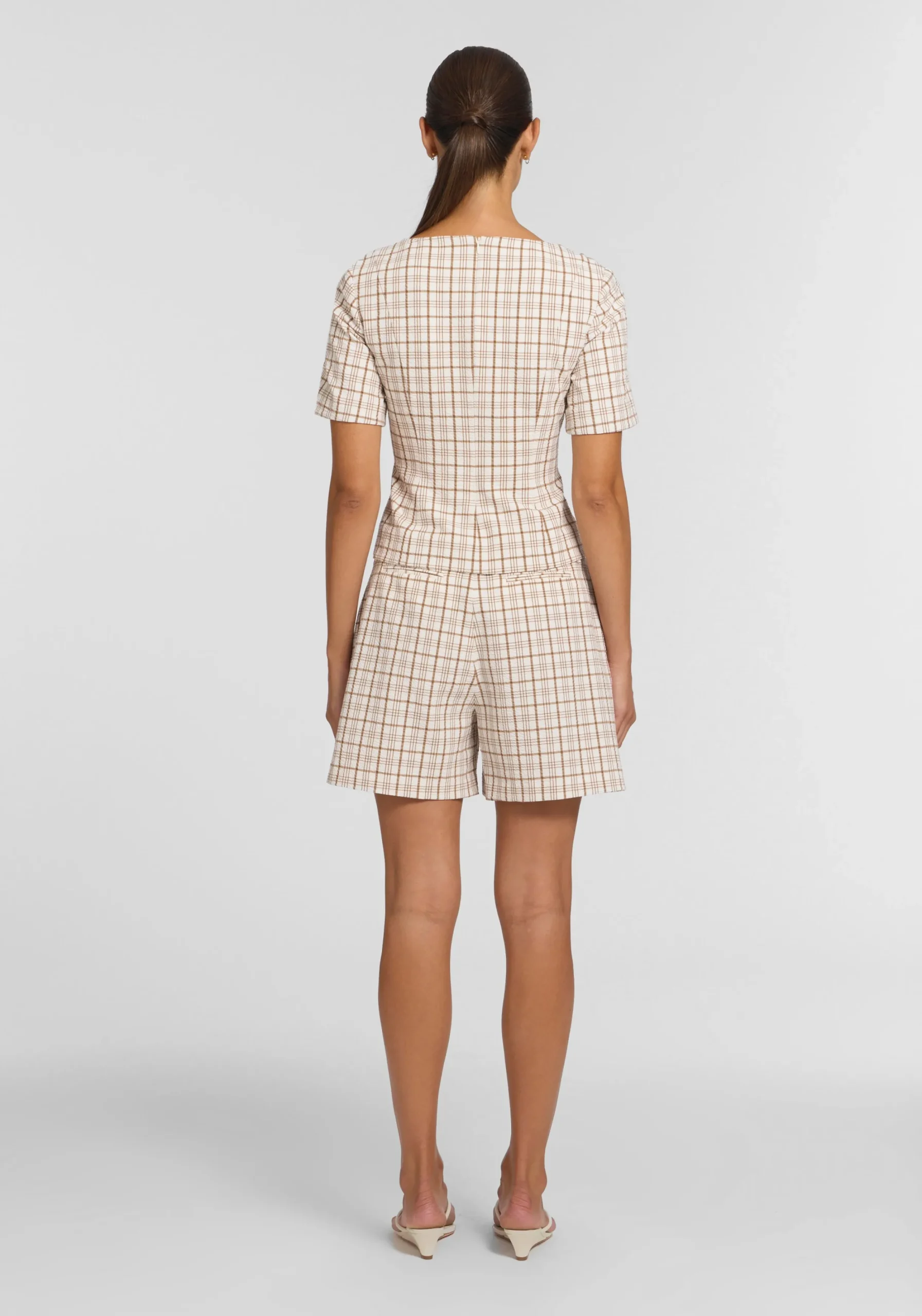 Exuding feminine sophistication, the Campus Top is crafted in a textured neutral check. Showcasing a square neckline, short sleeves, and front princess seams, it flatters the waist for a sleek silhouette. Pair with the Rupert Short for a matching set that embodies V&W’s signature tailoring with a preppy undertone, perfect for courtside style.