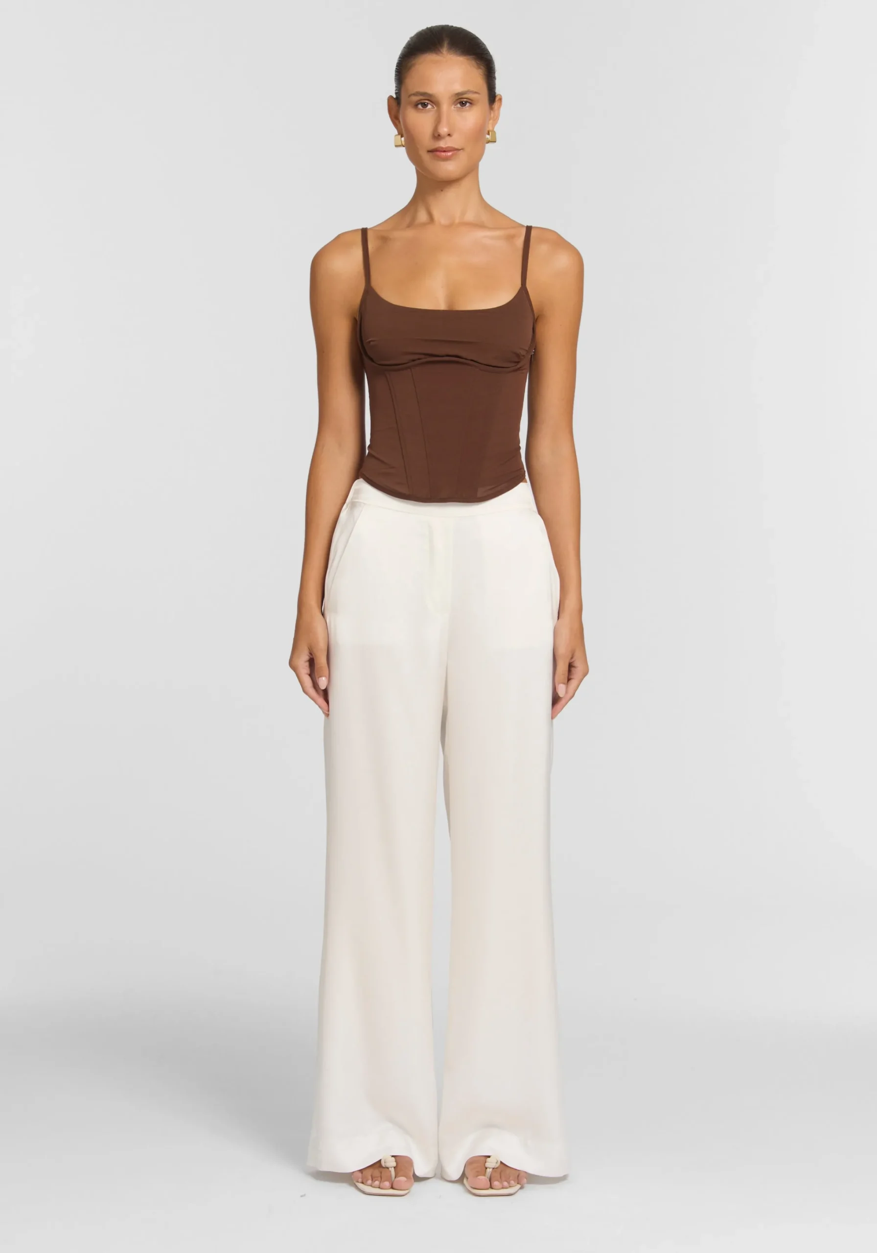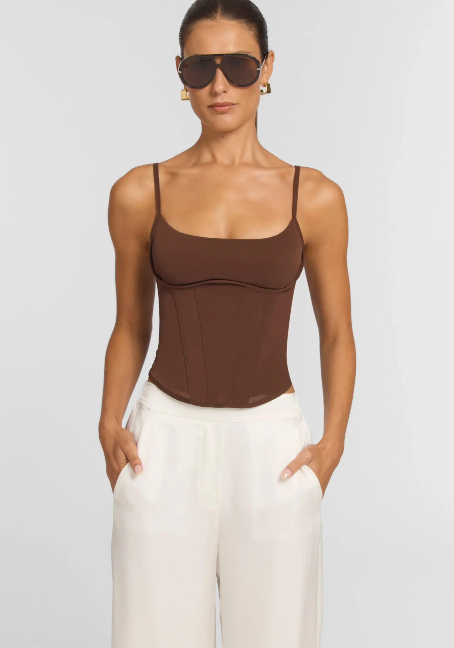 The Evocative Bustier introduces a new bustier silhouette, crafted from our signature V&W powermesh in a rich chestnut brown. Showcasing a straight neckline, adjustable straps, and a curved bust panel seam, it features layered panelling and boning. Pair with the Rocky Pant to blend fluid ease with sculpted structure or with this season’s rosewater pink for a dreamy colour block moment.MADE IN AUSTRALIA