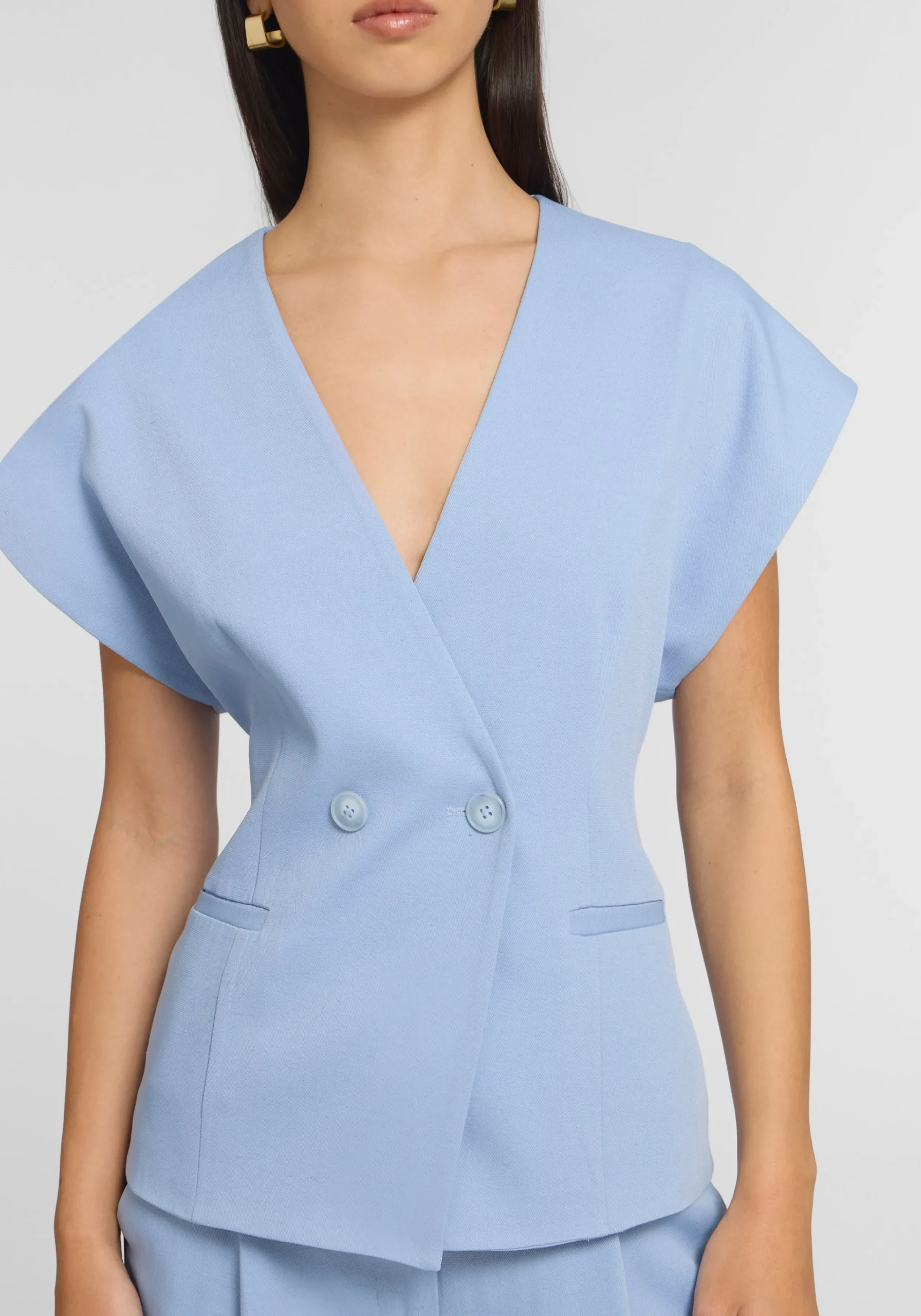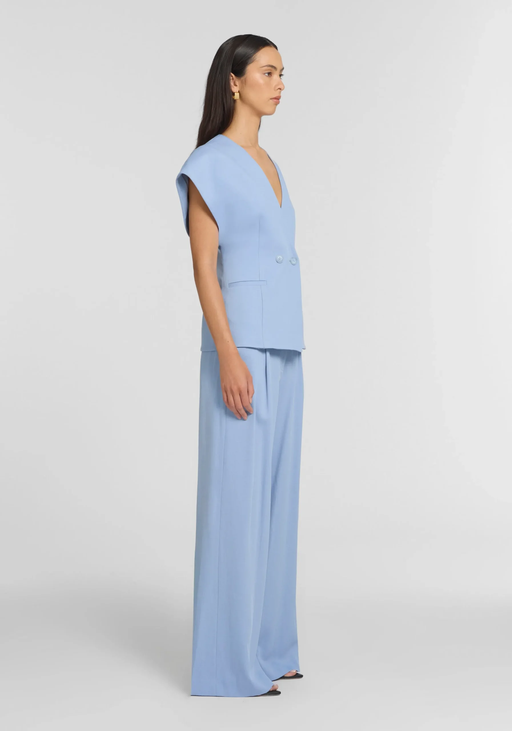 Infuse your tailoring with classic sophistication with the Ludlow Vest in serene saltwater blue, crafted from a recycled Japanese textile. Defined by a bold yet understated silhouette, this double-breasted design offers extended shoulders, a front button closure, and mock front pockets. Pair with the Draper Trouser to fuse fluid foundations with sharp tailoring, forming a modern uniform of considered ease.