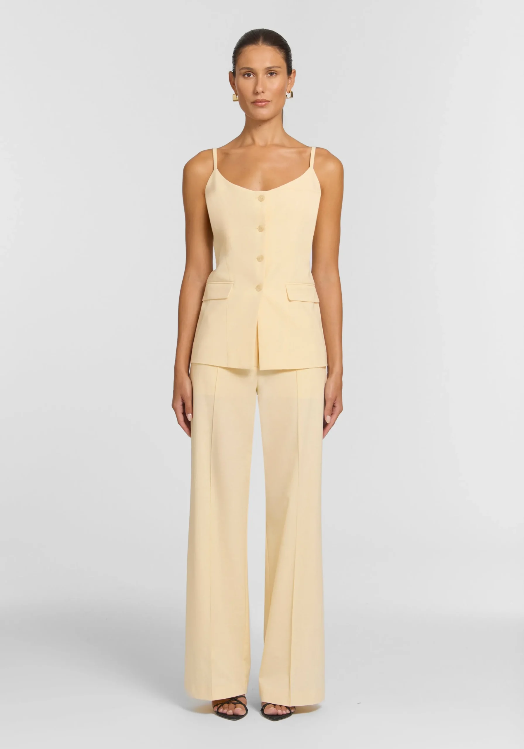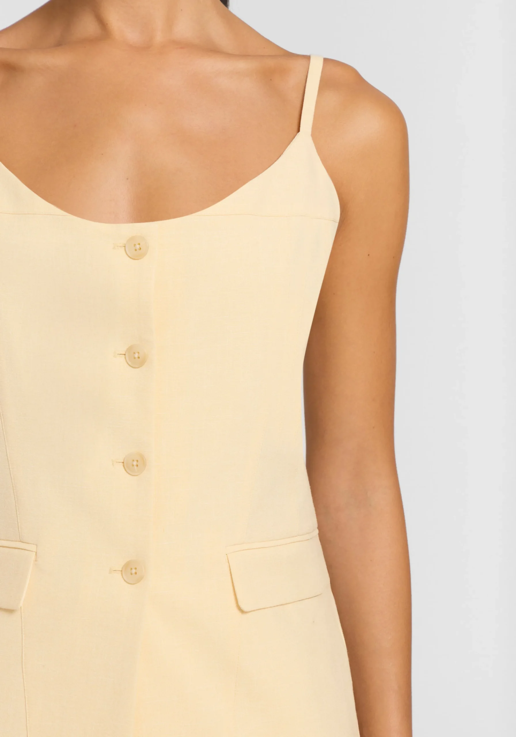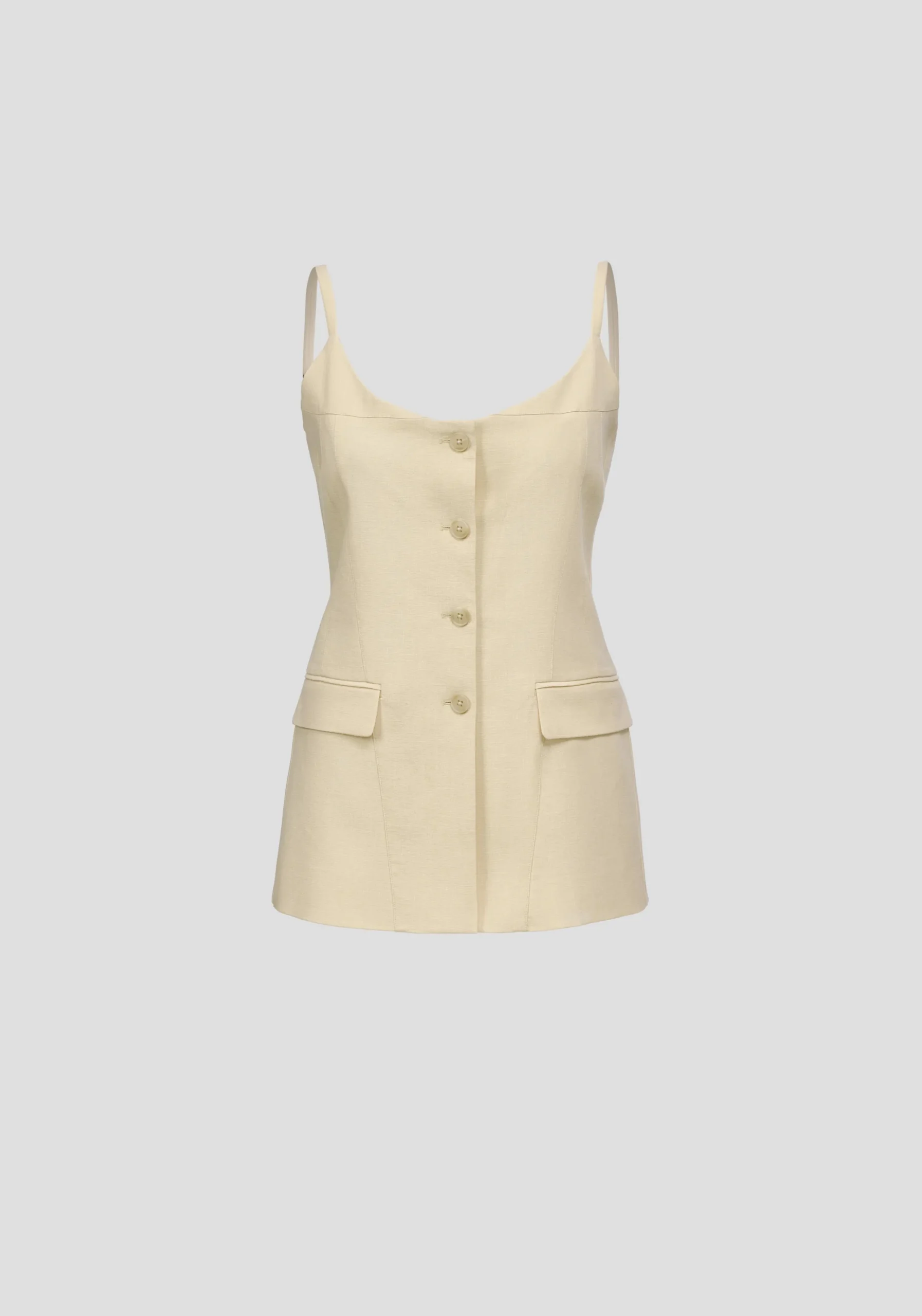 The Megawatt Top, precisely tailored in a confident sunflower-hued linen blend. Featuring a sharp, tapered silhouette, scooped neckline, and jetted pockets, it’s finished with adjustable straps and a centre back vent. Pair with the Barker Trouser or style with denim for versatile, elevated ease.