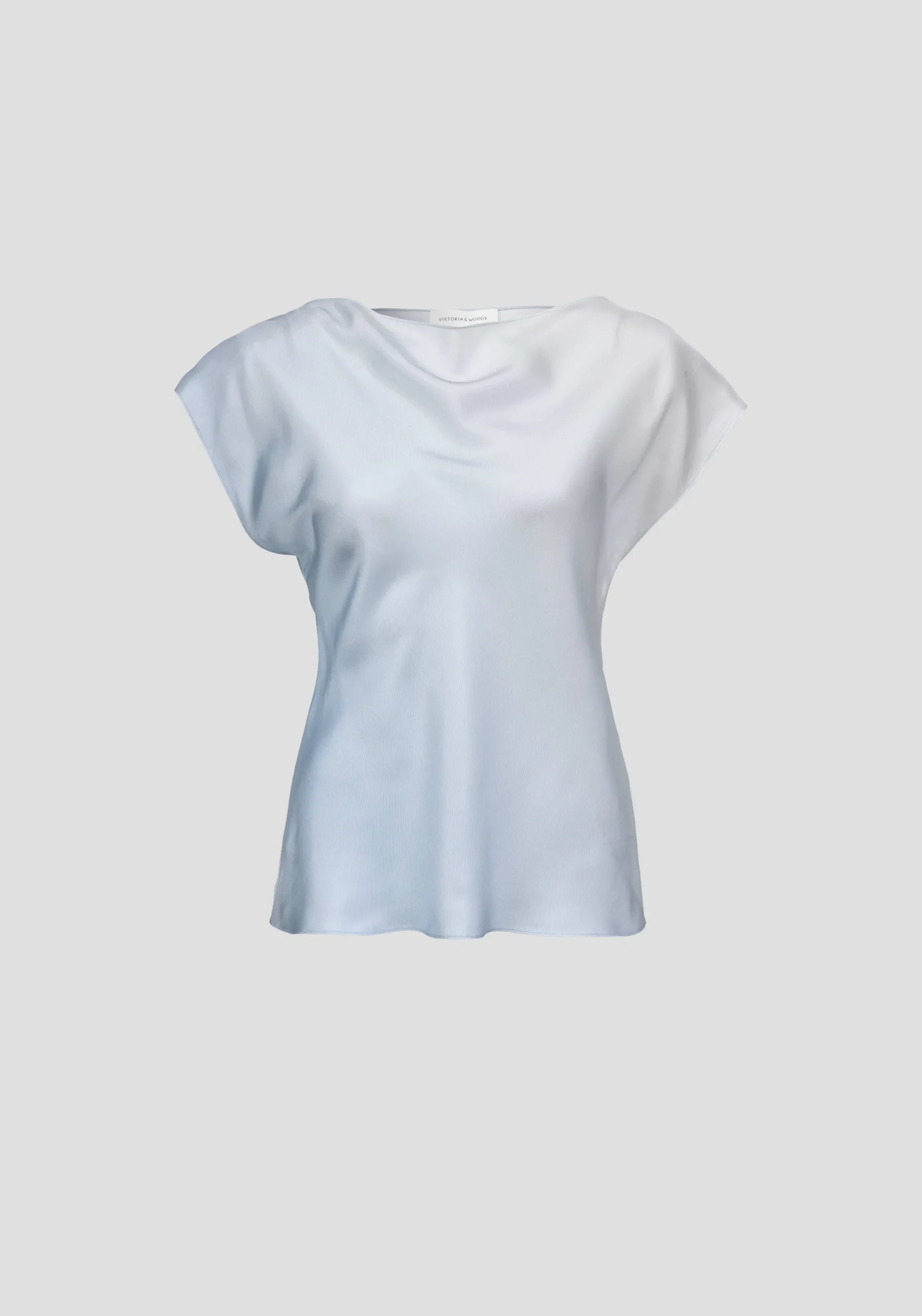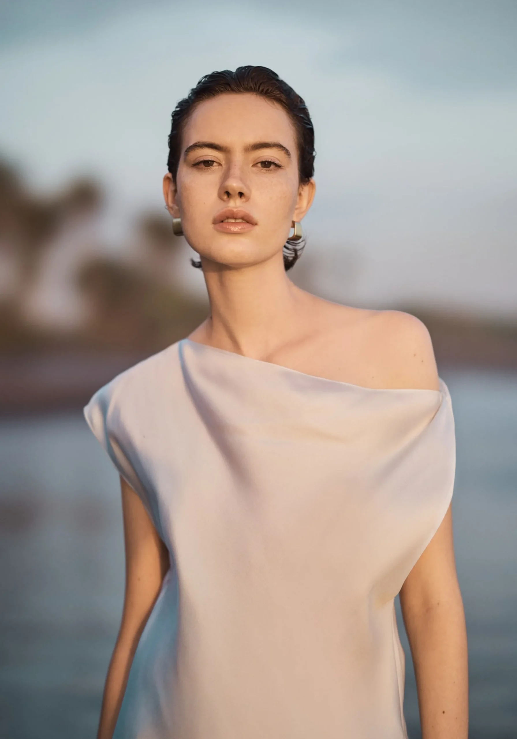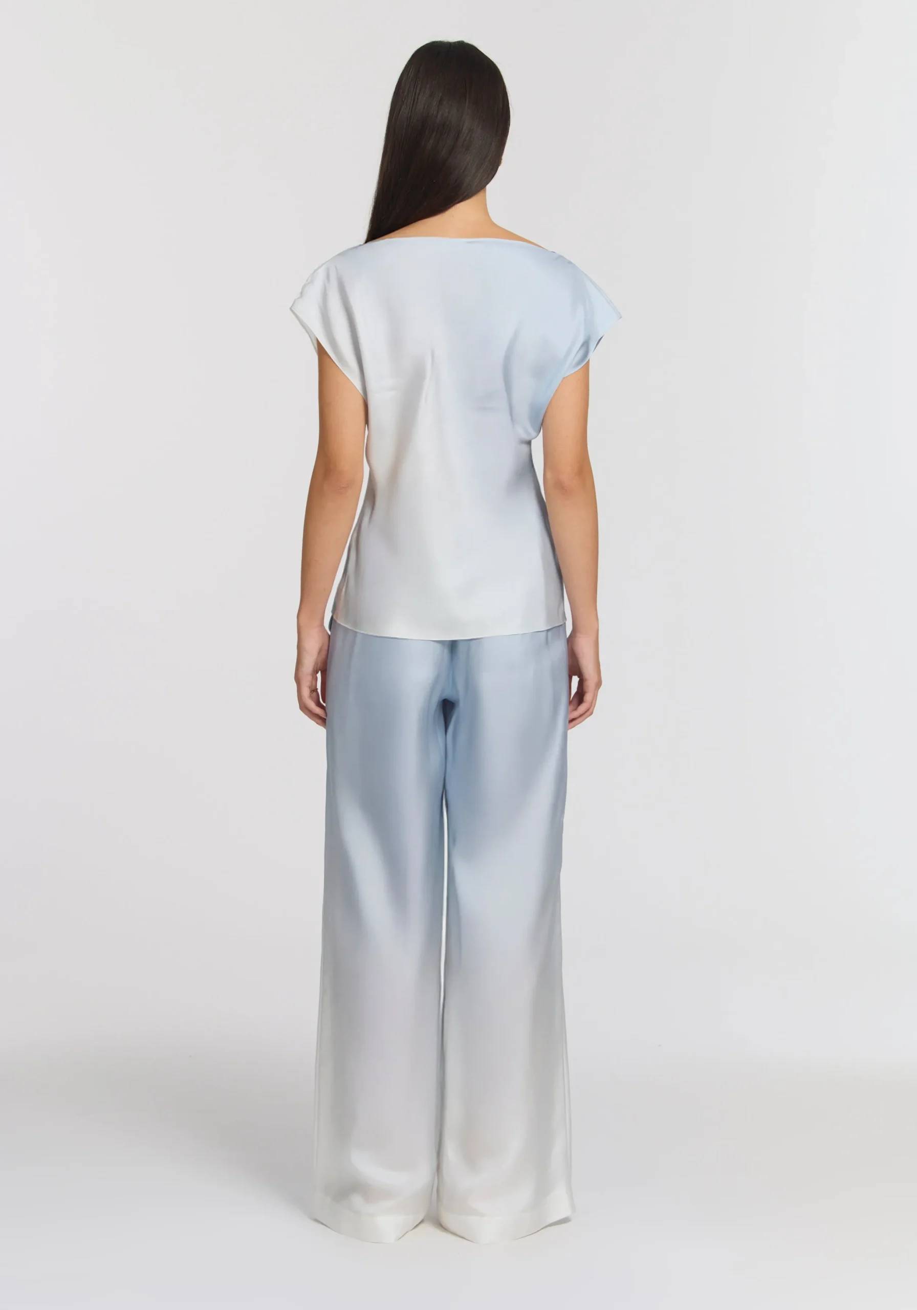 The Rosemary Top is crafted from luxurious, weightless silk and realised in a soft blue ombre print, echoing the waves of the sea. Bias-cut for a natural drape, it falls effortlessly through the body, showcasing a fluid cowl neckline and extended shoulders. Style with the Willow Pant to form a clean, expressive silhouette, an artful, wearable landscape.