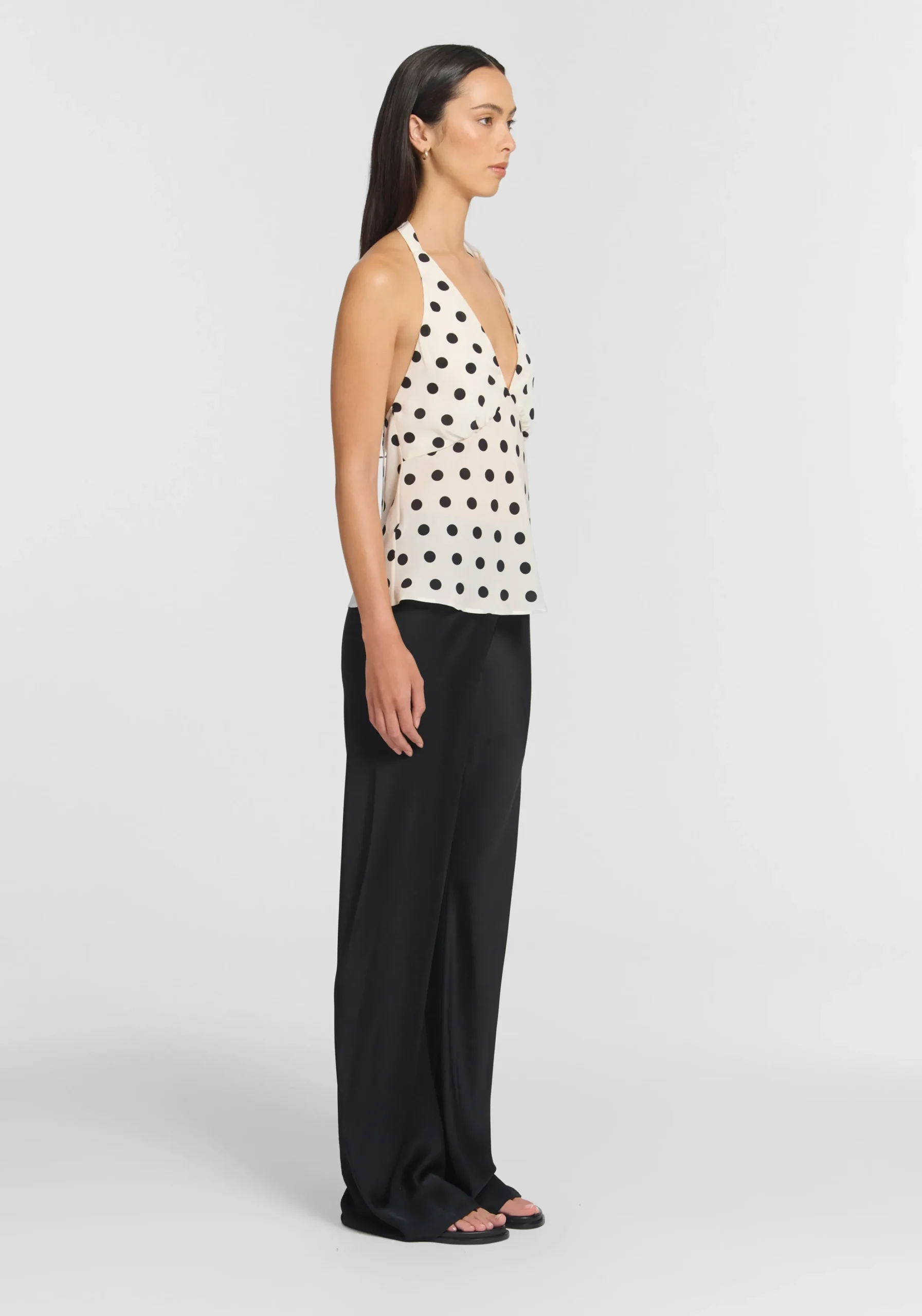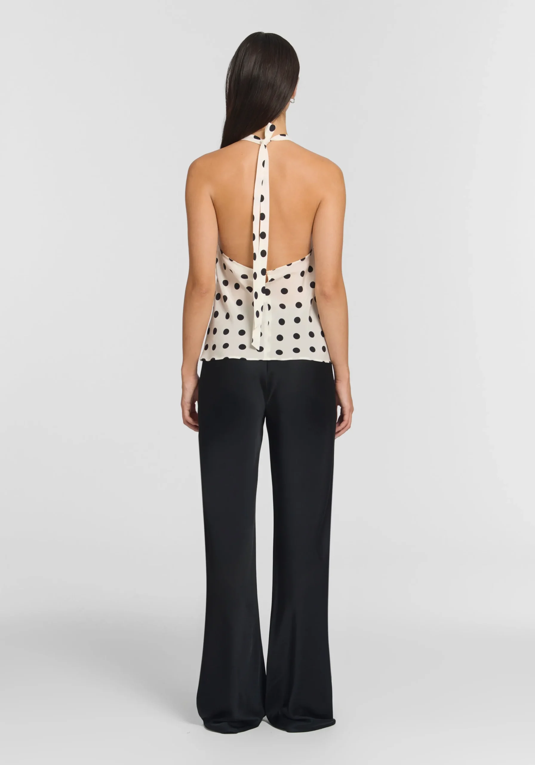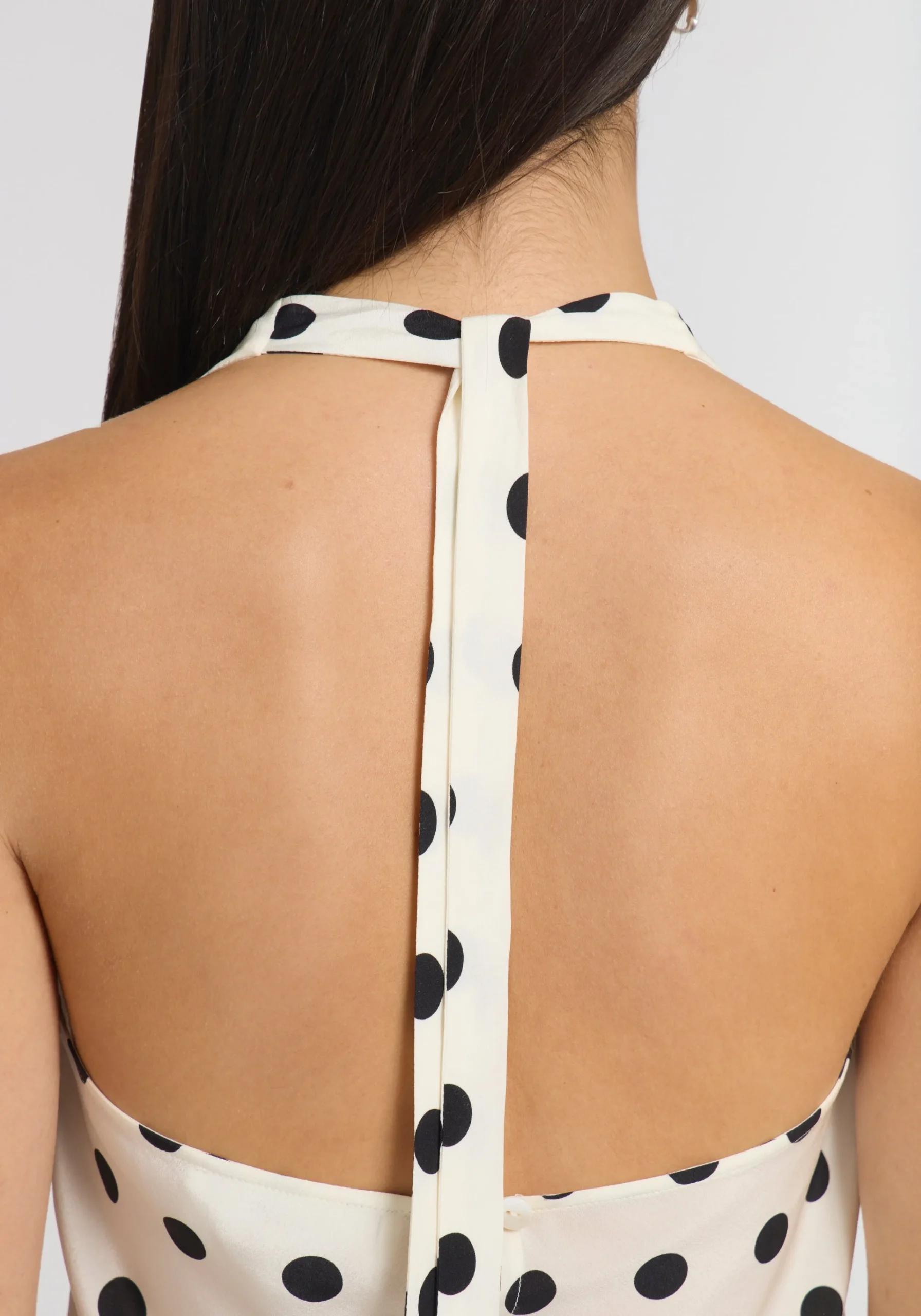 The Tribe Top, crafted from luxurious white silk with black polka dots, embodies classic simplicity. Showcasing a halter neckline, underbust seams with soft gathers, and a self-tie at the back neck, it falls to a softly flared, flattering silhouette. Style effortlessly with everyday essentials, or pair with the Reign Skirt and Ada Scarf for the perfect spring eventing look.MADE IN AUSTRALIA