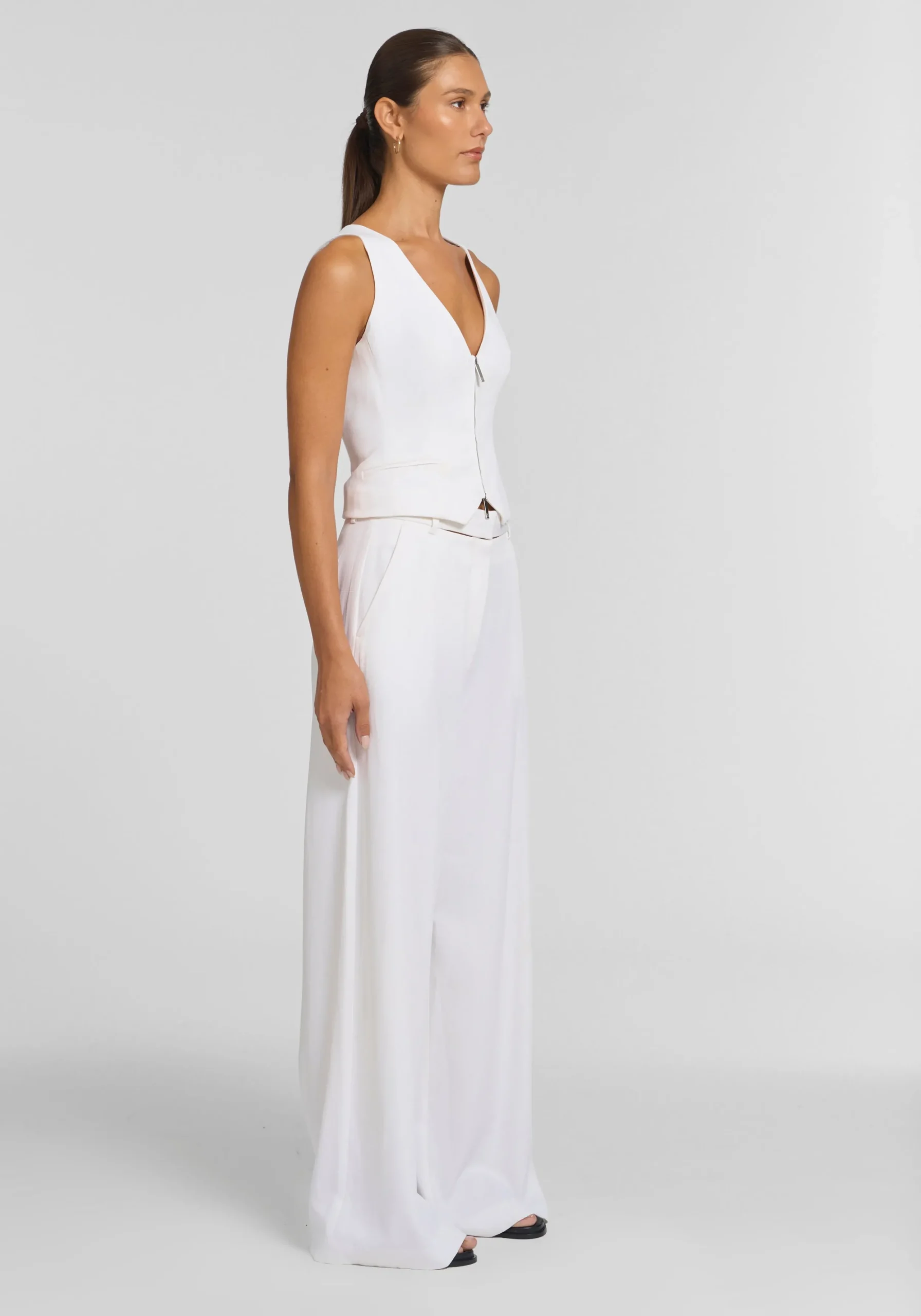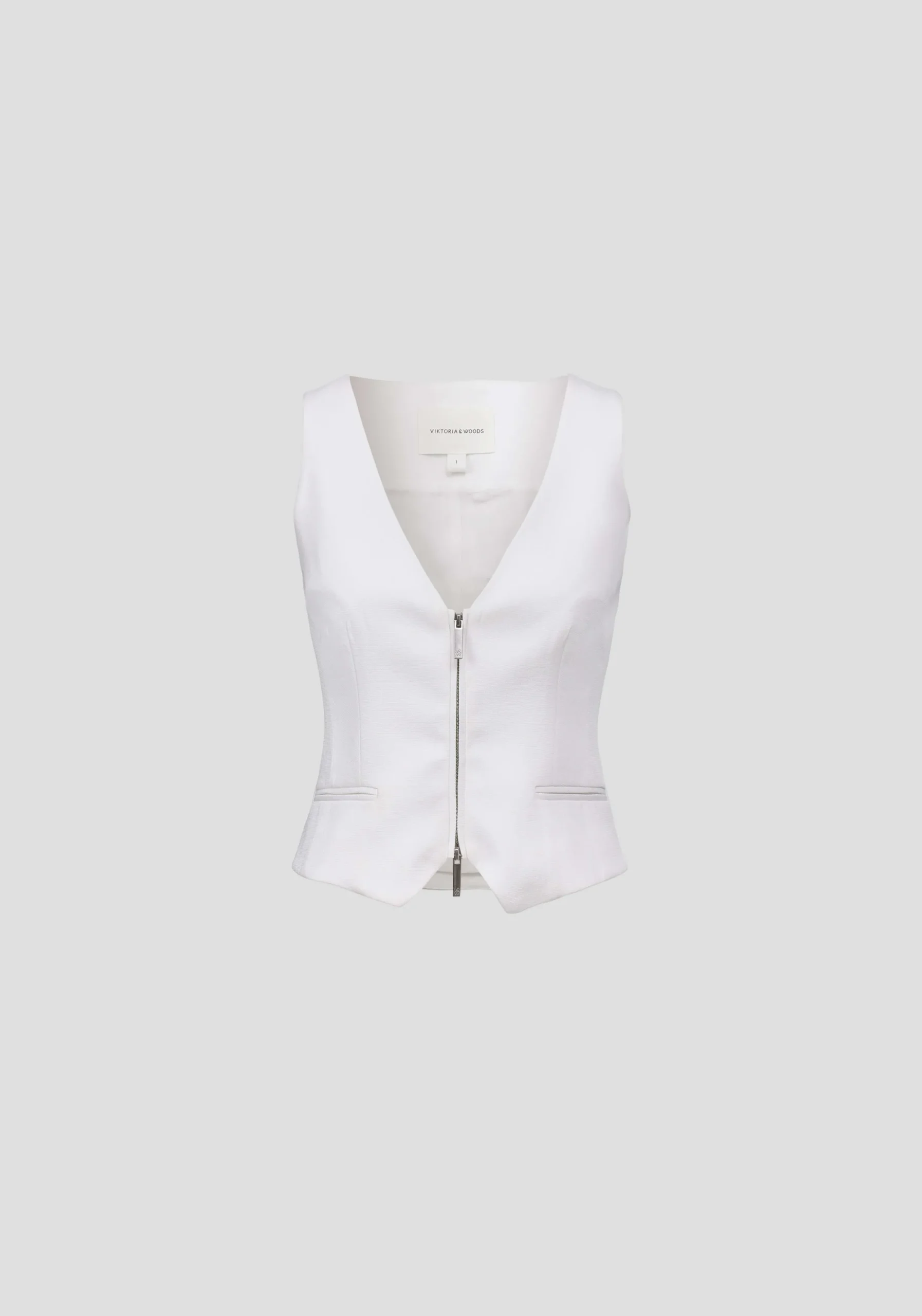 Grounded in architectural ease, the Tribute Vest is crafted from recycled plastics in crisp white. Showcasing a flattering V-neckline, it is adorned with a two-way zip, front jetted pockets, and a pointed hem. Pair with the Fitzroy Trouser for a summer tailoring that exudes understated elegance for any occasion.