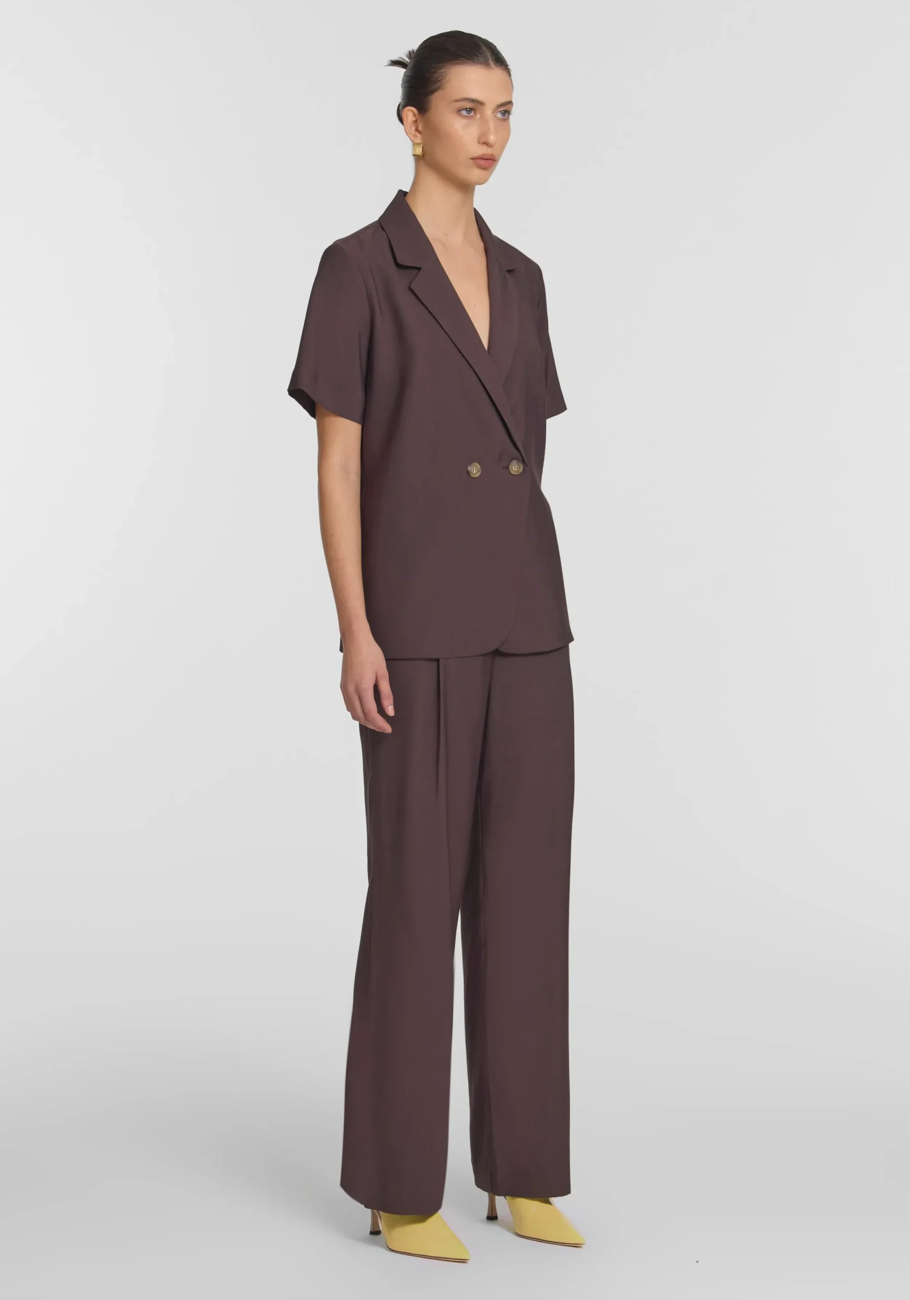 The Hepburn Shirt returns in a rich chocolate hue, tailored from our signature bamboo blend. Featuring a double-breasted front, relaxed fit, and back vent, it offers timeless versatility. Pair effortlessly with the Ivanhoe Pant for a refined set, or style back with denim for polished ease.MADE IN AUSTRALIA