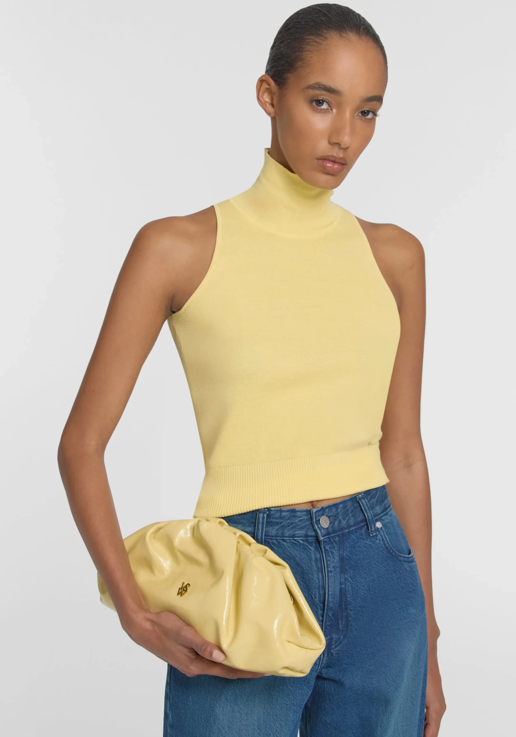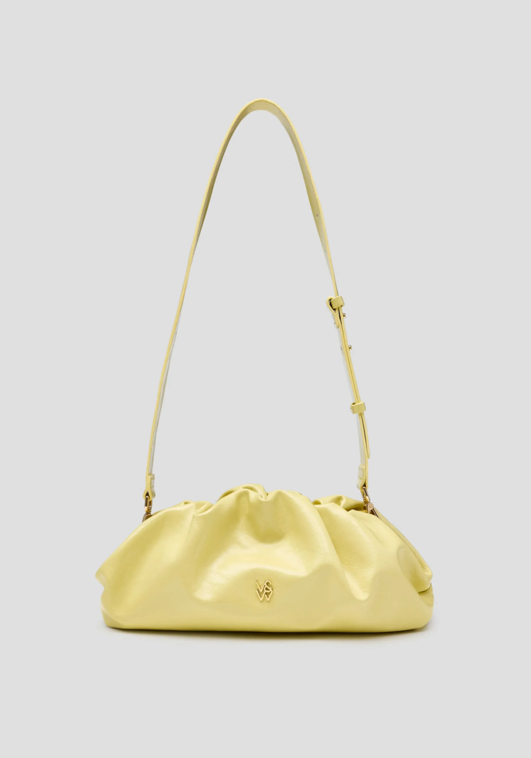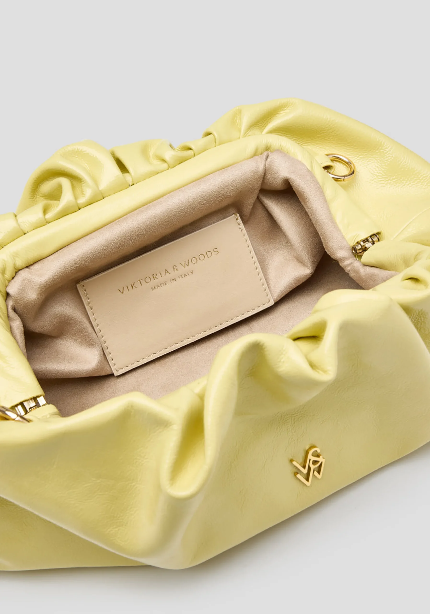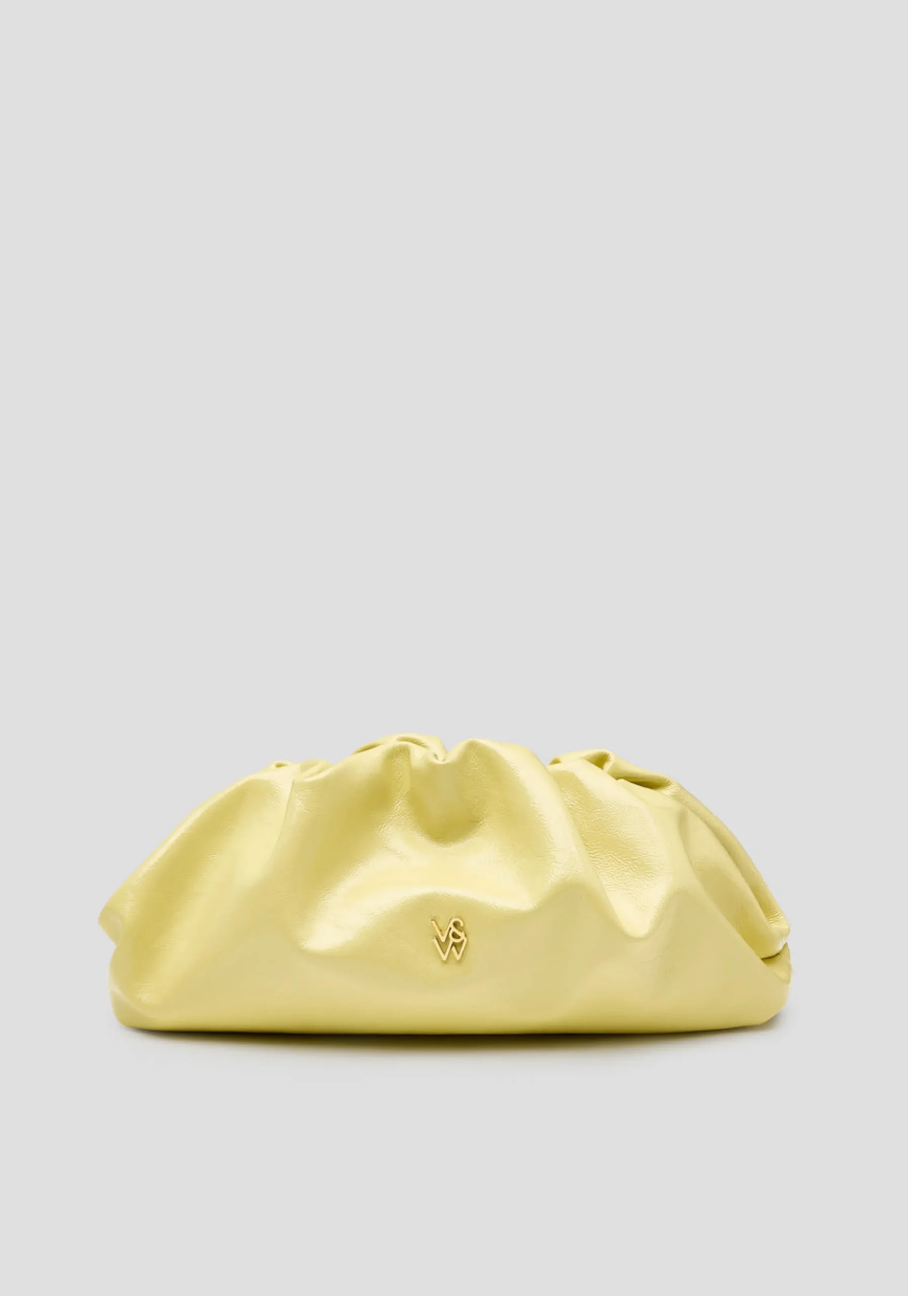 The Frankie Bag returns, a baguette-style clutch crafted from tumbled patent yellow leather. Detailed with gathered accents and adorned with intricate gold logo hardware, it features an internal pocket and a removable chain strap. Versatile and timeless, this bag adds an effortlessly vibrant touch to elevate any look.MADE IN ITALY