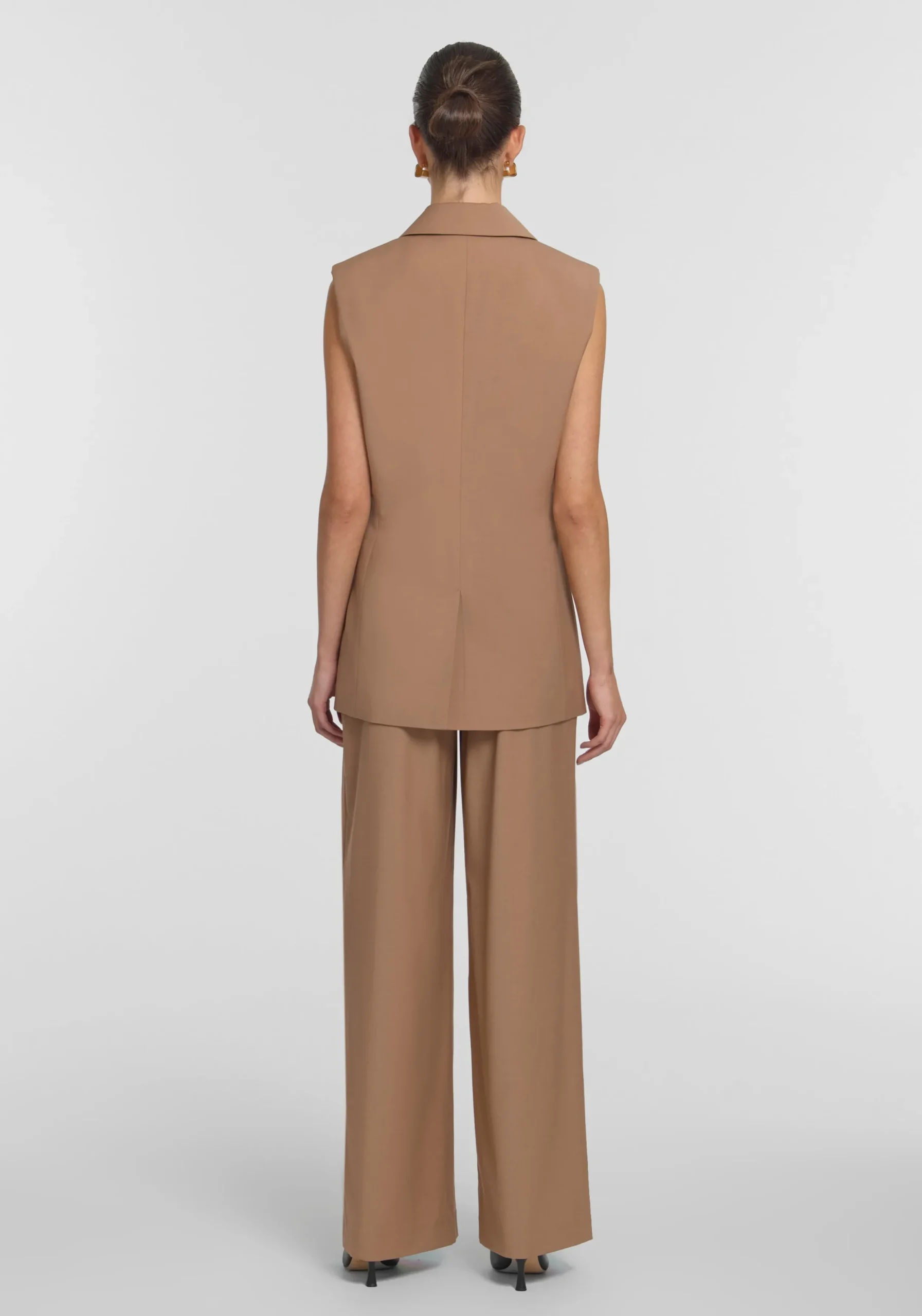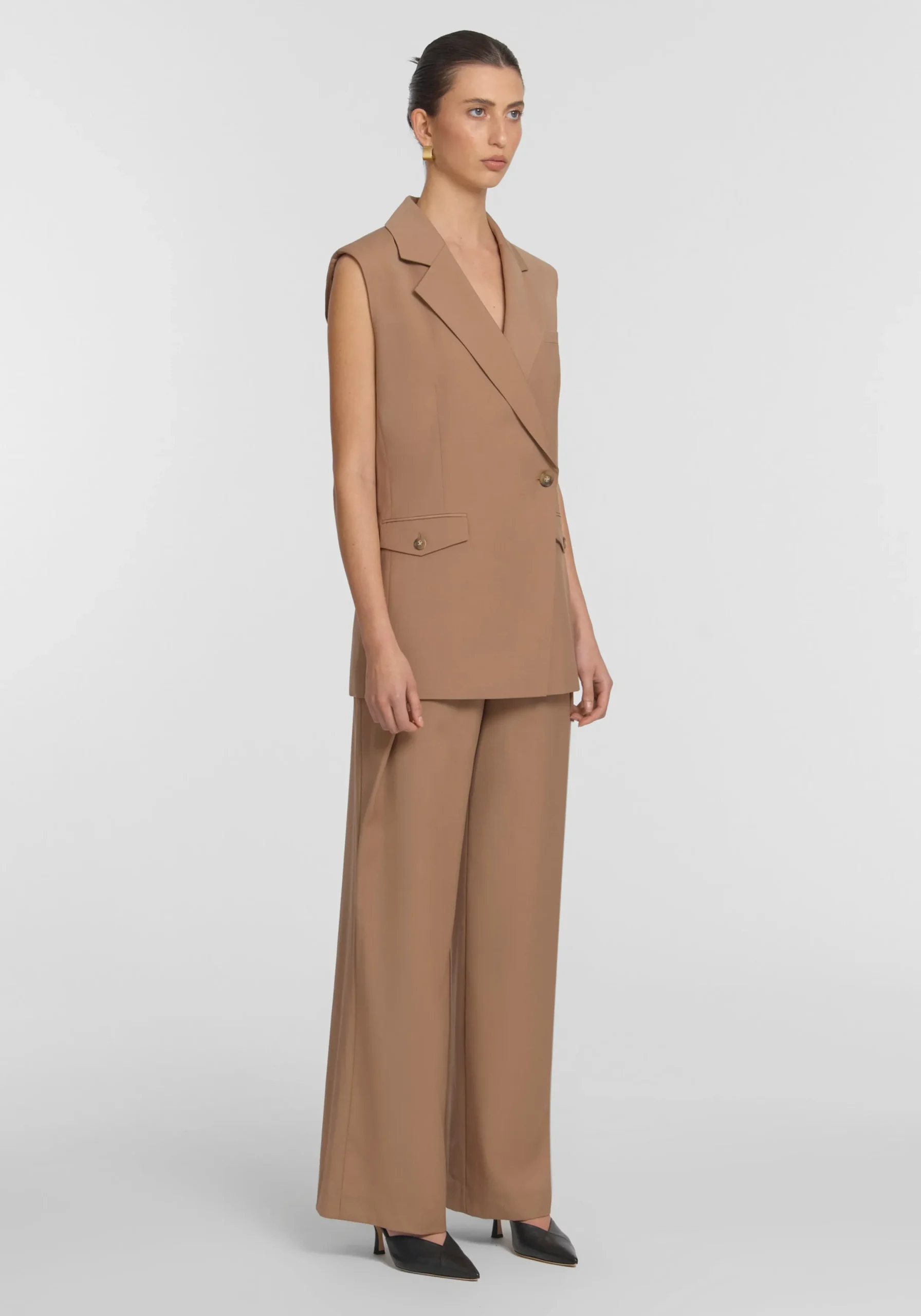 The Destination Sleeveless Blazer is an office essential, luxuriously crafted from a lightweight wool blend in a neutral light brown hue. Its double-breasted wrap silhouette features a notched collar, a logo button, utilitarian pocket detailing, and a centre back vent. Sophisticated and sculpted, it brings timeless modernity to workwear – pair with the Preston Trouser or style back with denim for more relaxed wear.