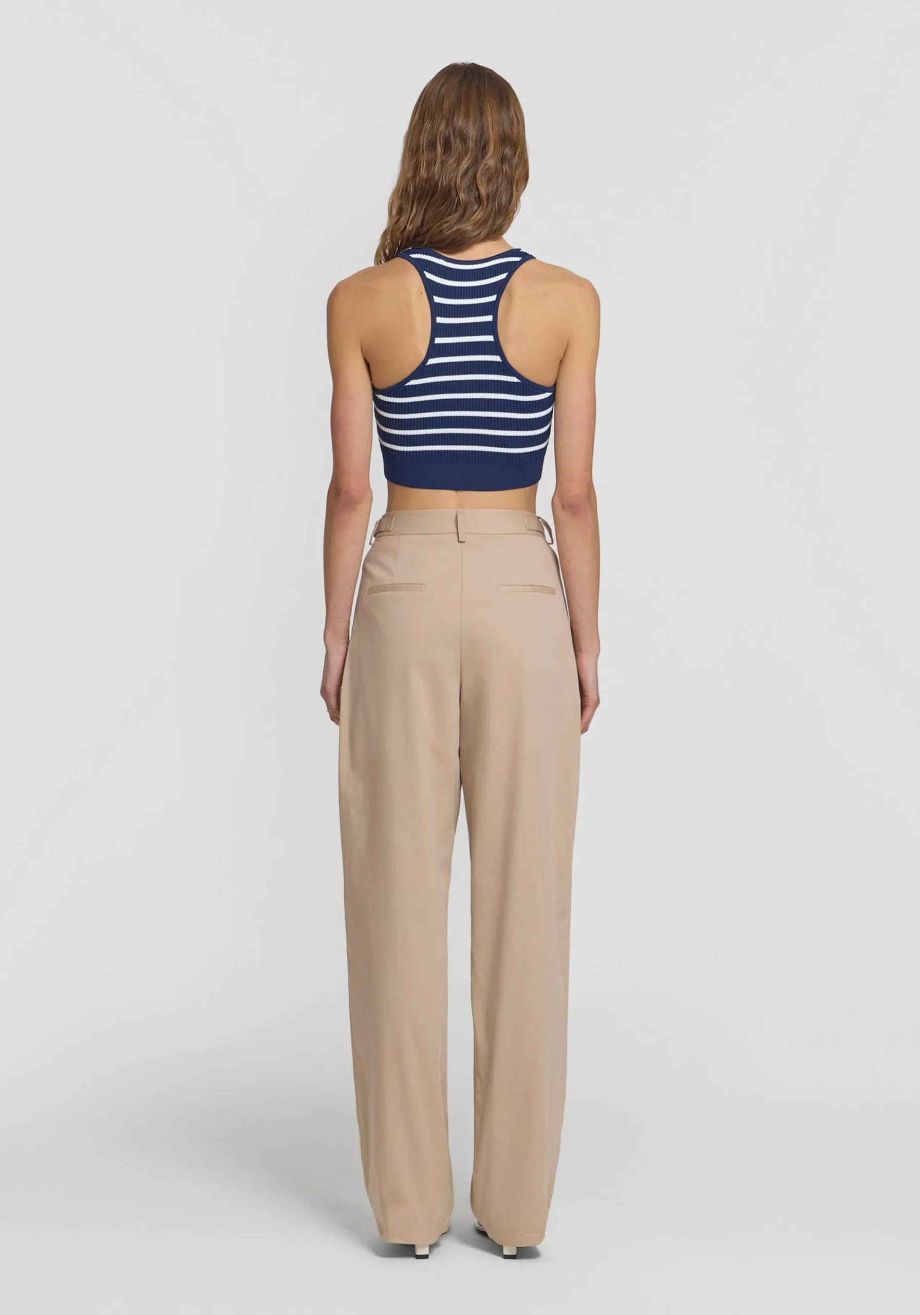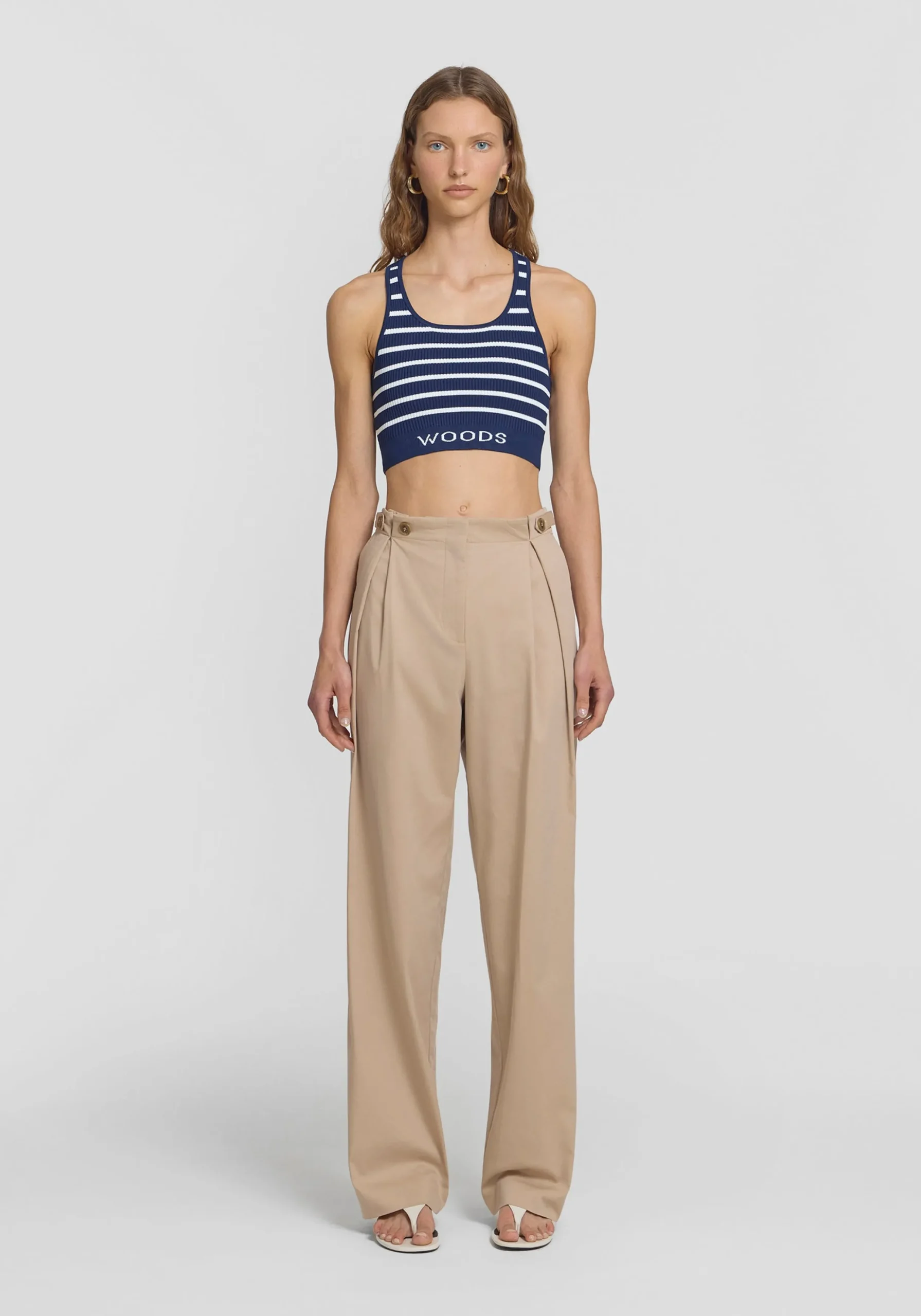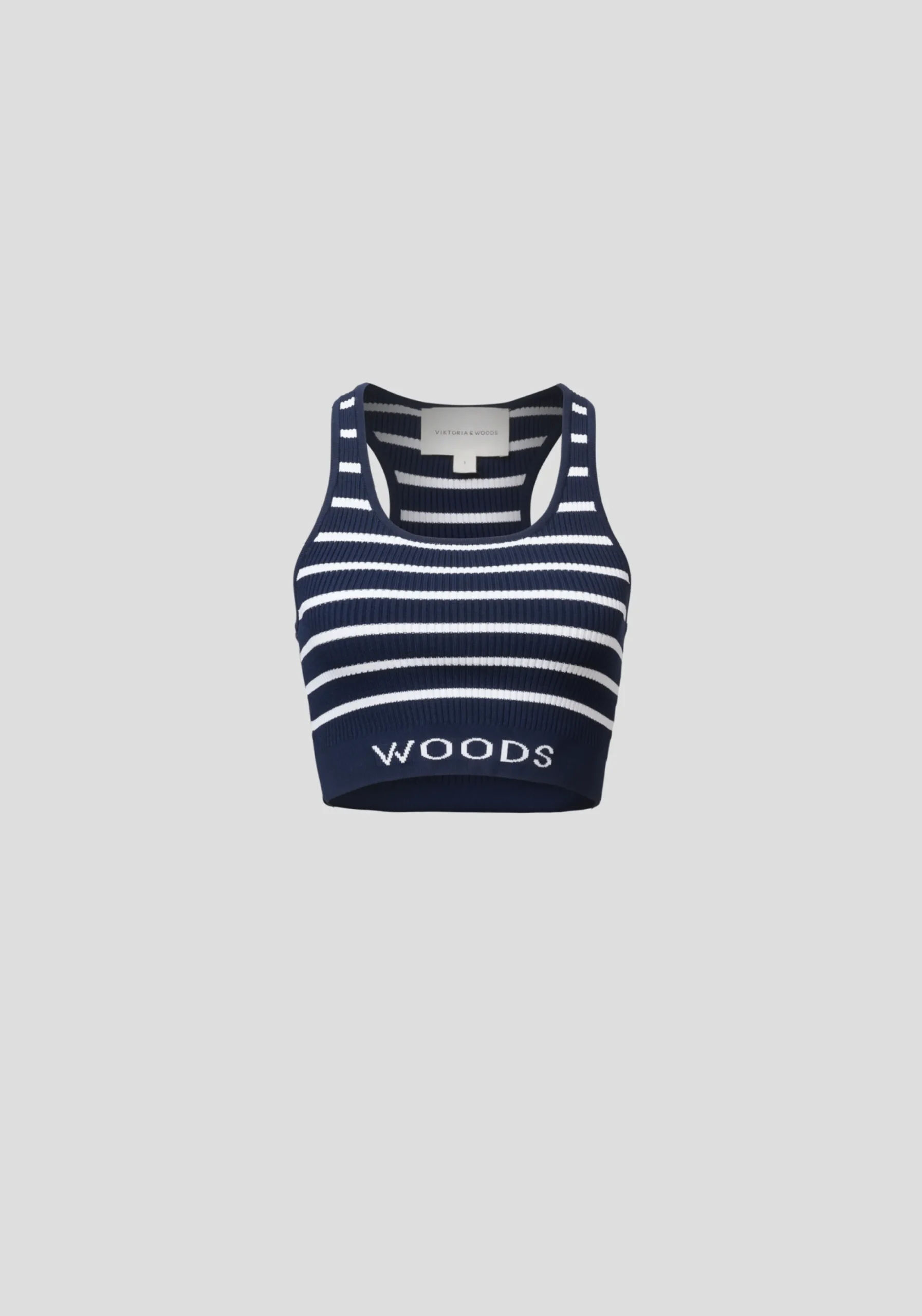 Introducing the newest rendition of the Lyra Crop in a nautical-inspired navy and white stripe. This refined yet sporty piece brings timeless style to your summer wardrobe. Crafted from a fully fashioned ribbed knit with a contrast stripe, this crop top has a front scoop neckline and racerback design with a WOODS jacquard logo on the front band. A timeless, elevated essential that pairs effortlessly with a relaxed white tailored blazer, short or pant for yacht club chic.