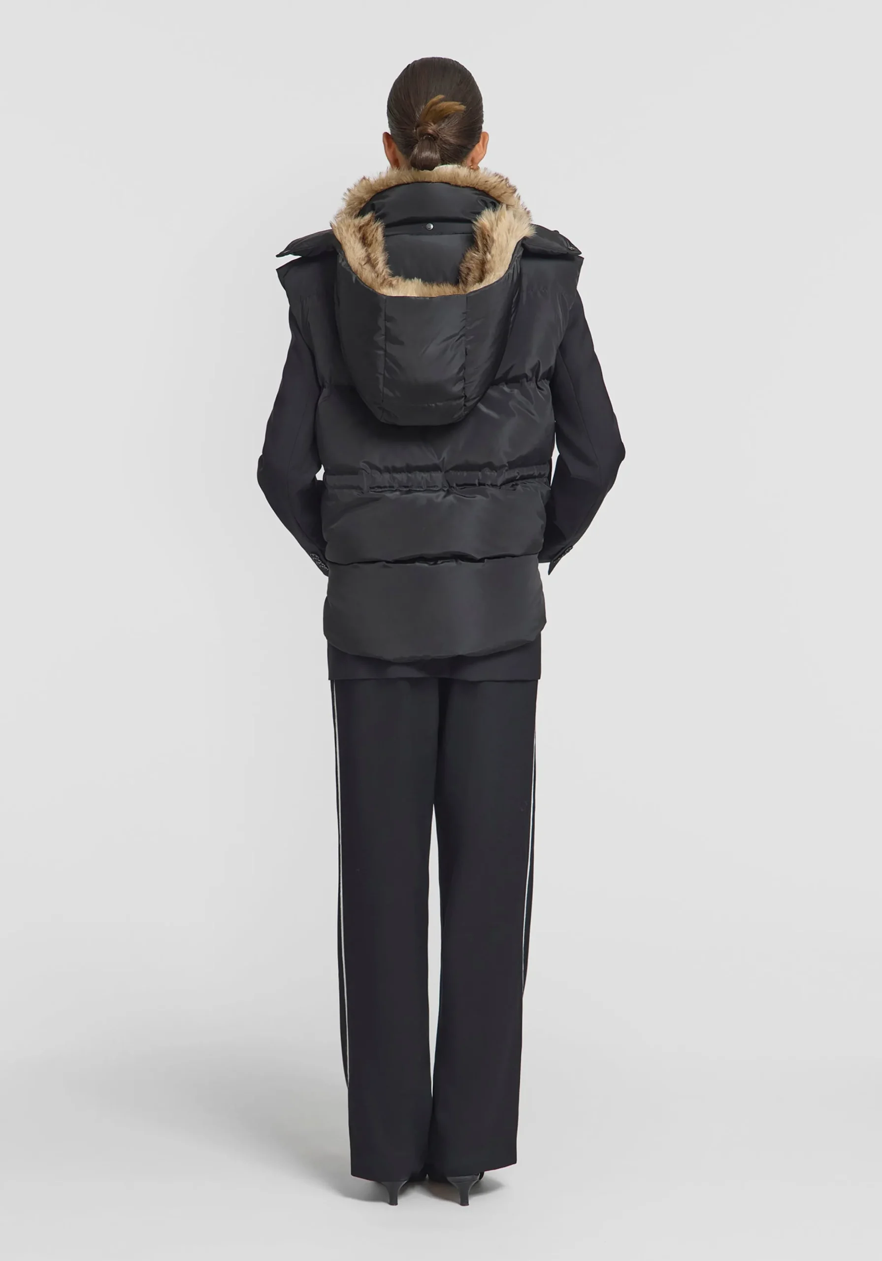 The Morpheus Puffer Vest is a versatile investment in winter functionality, crafted from recycled polyester and filled with ethically sourced down. Designed with a detachable faux fur-lined hood, faux fur inserts along the collar and placket, and a two-way zip, it blends sporty aesthetics with statement style. Adorned with an internal drawcord, pockets, and finished with V&W embroidery, this black vest is an essential piece for cold-weather layering.