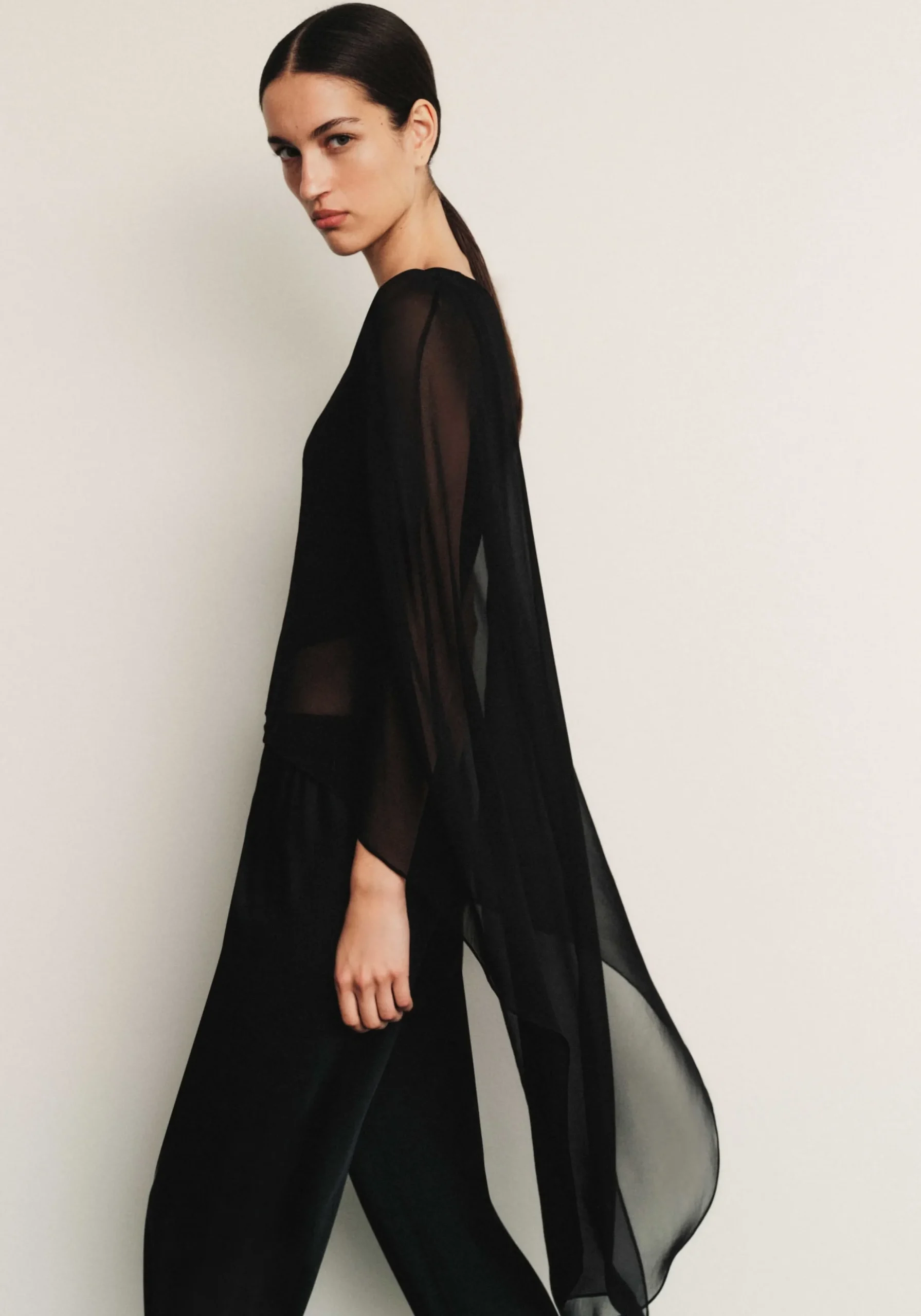 Exude ethereal femininity in the Holliday Cape Top, crafted from black silk georgette. Falling longer at the back with a soft waterfall drape, it captures the essence of fluidity in luxurious sheer detailing. Pair with V&W Foundation undergarments for effortless wear.MADE IN AUSTRALIA