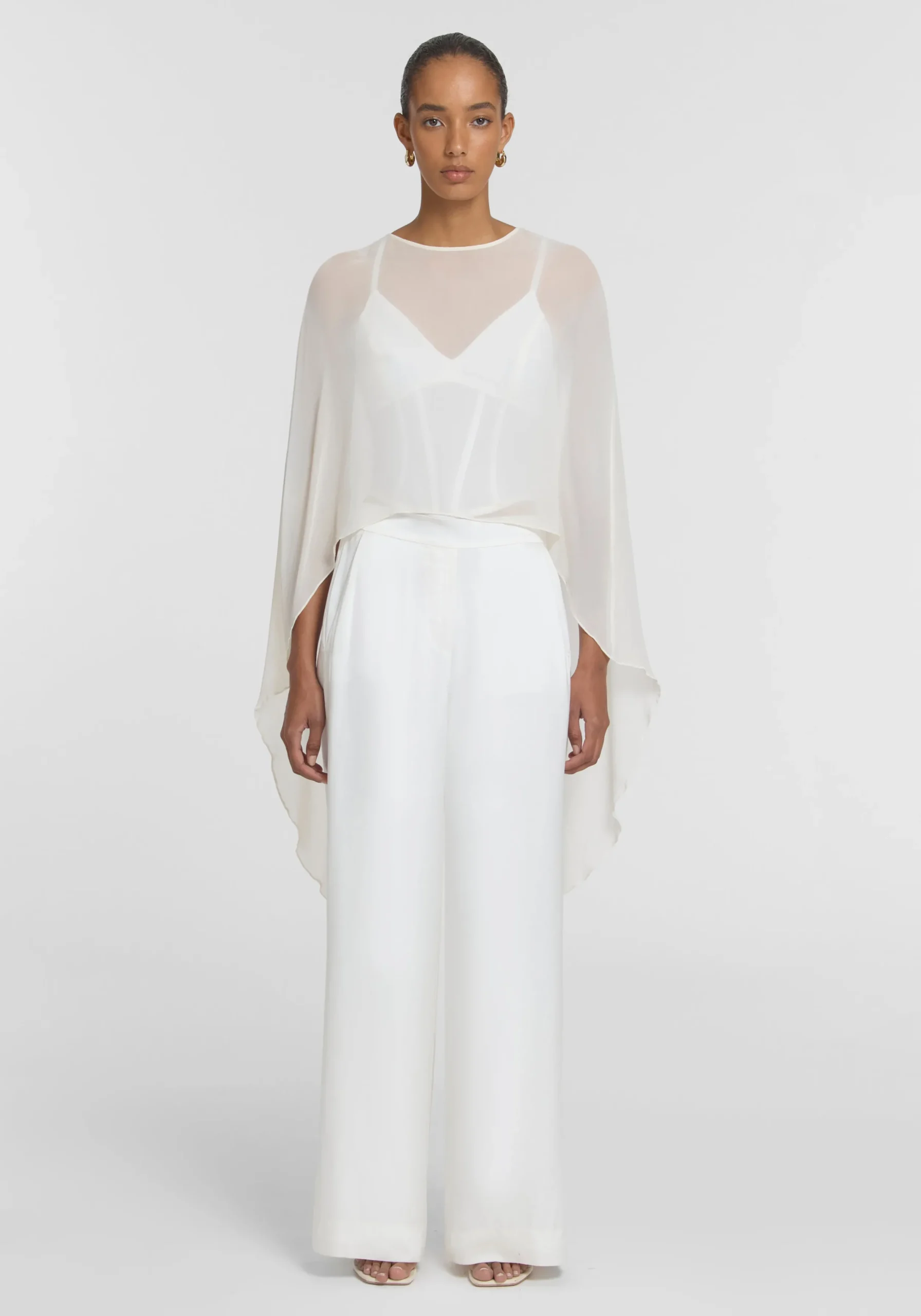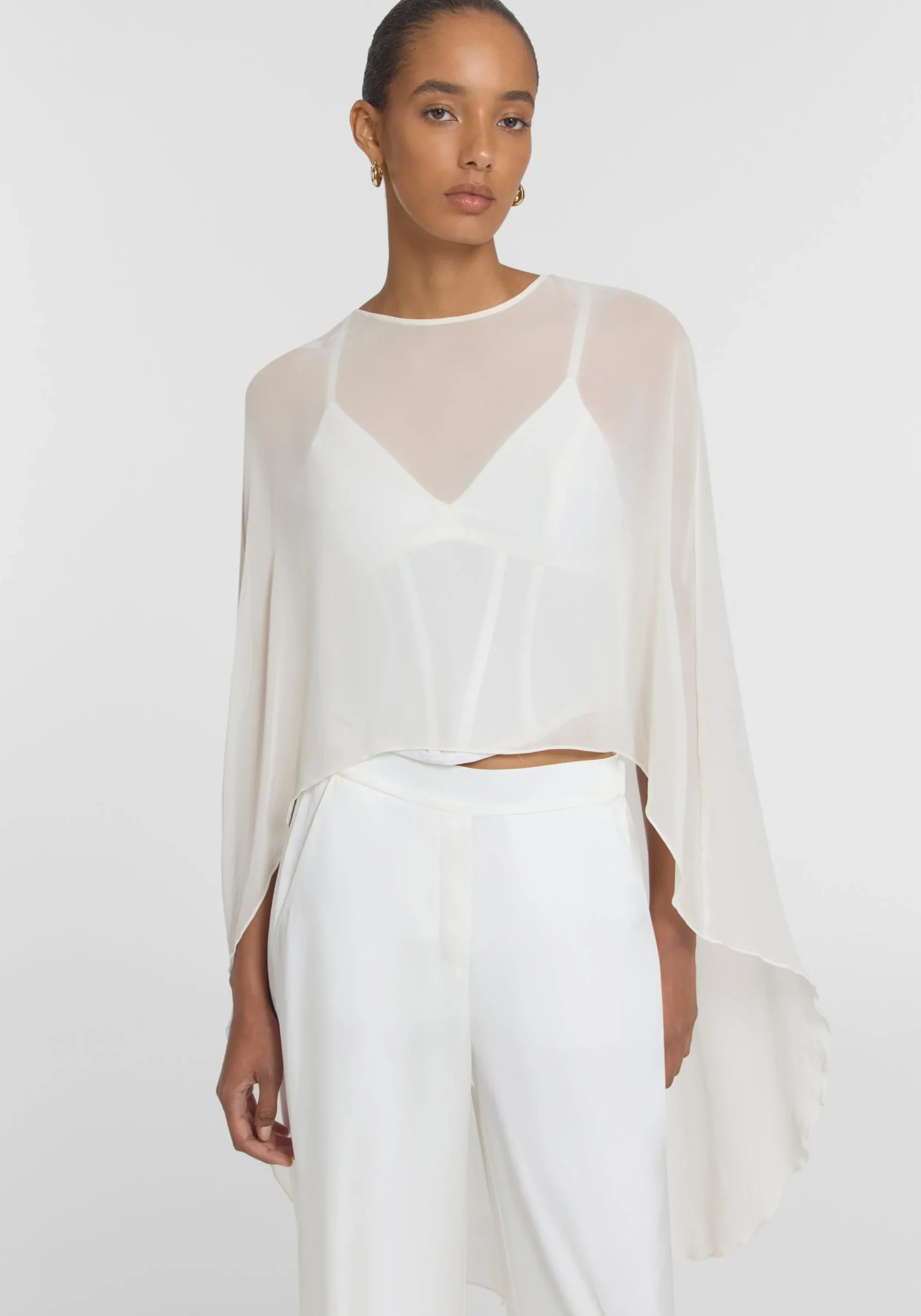 Exude ethereal femininity in the Holliday Cape Top, crafted from ivory silk georgette. Falling longer at the back with a soft waterfall drape, it captures the essence of fluidity in luxurious sheer detailing. Pair with the Omega Bustier or V&W Foundation undergarments for effortless wear. MADE IN AUSTRALIA