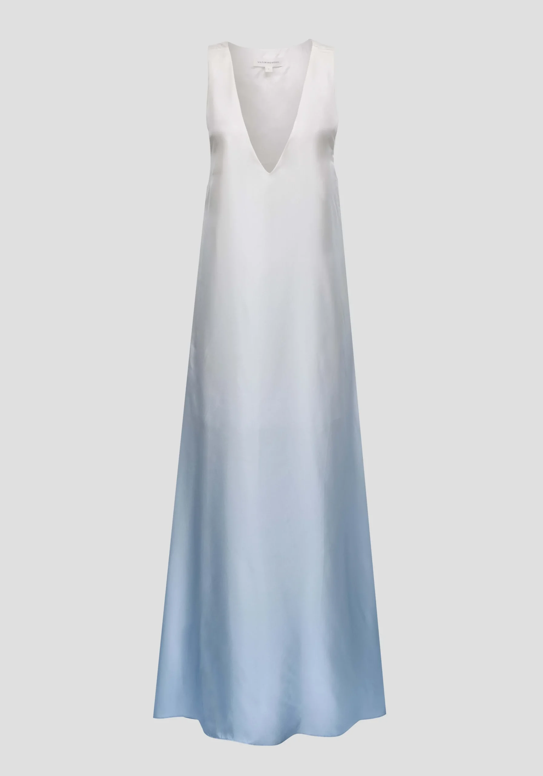 The Dreamland Dress echoes the waves of the sea, with deep blue washing into crisp white in a graceful silk ombré. This uncomplicated dress features a deep V-neckline and flows effortlessly into a soft A-line silhouette, with pockets discreetly concealed. Embodying the quiet luxury of calm, style it with the Asta Scarf for a serene statement.