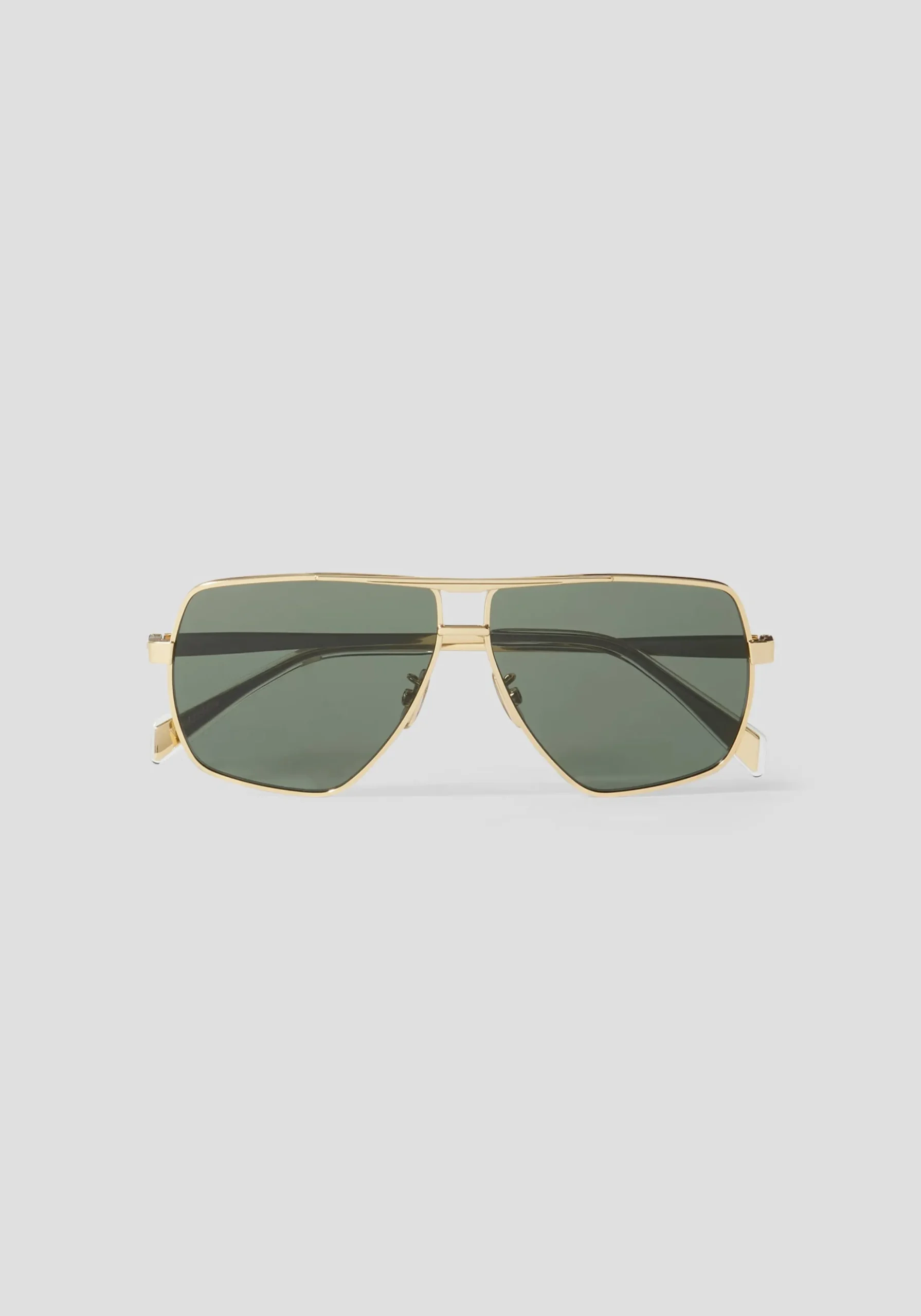 Introducing the Celine Aviator, an embodiment of sophistication. Crafted from luxurious gold metal with an irregular frame shape, these shades feature vibrant green lenses. The Metaltriomphe model exudes charm, offering exceptional comfort, durability, and superior UV protection.