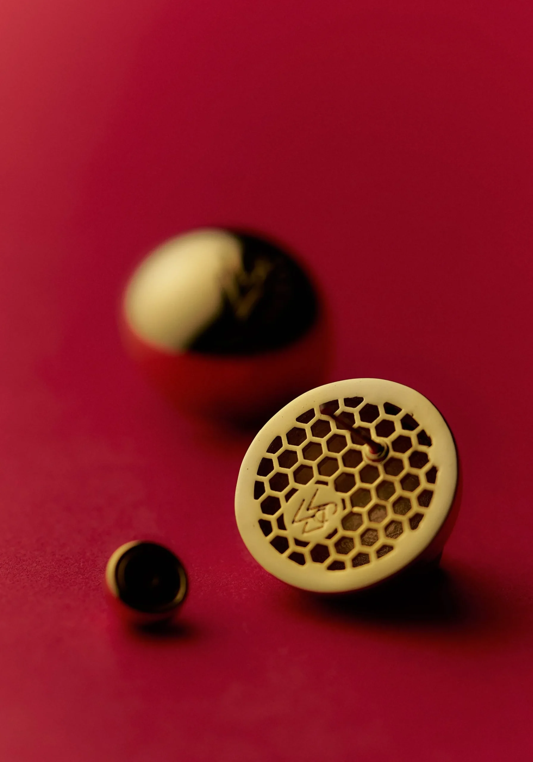 The V&W Dome Earrings, crafted in 16k plated gold, feature a statement dome shape with debossed V&W branding. Finished with a honeycomb partition on the back, they make a defining statement in modern, transitional elegance.Please note, for health and hygiene reasons, all jewellery is not eligible for return.
