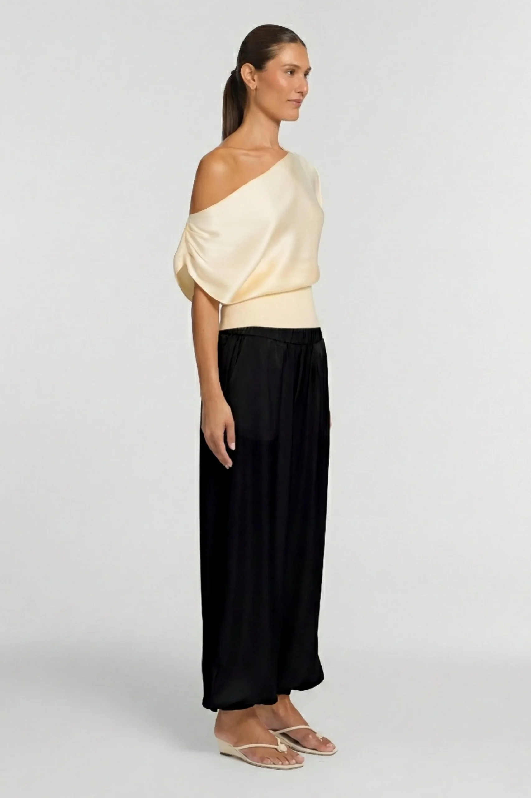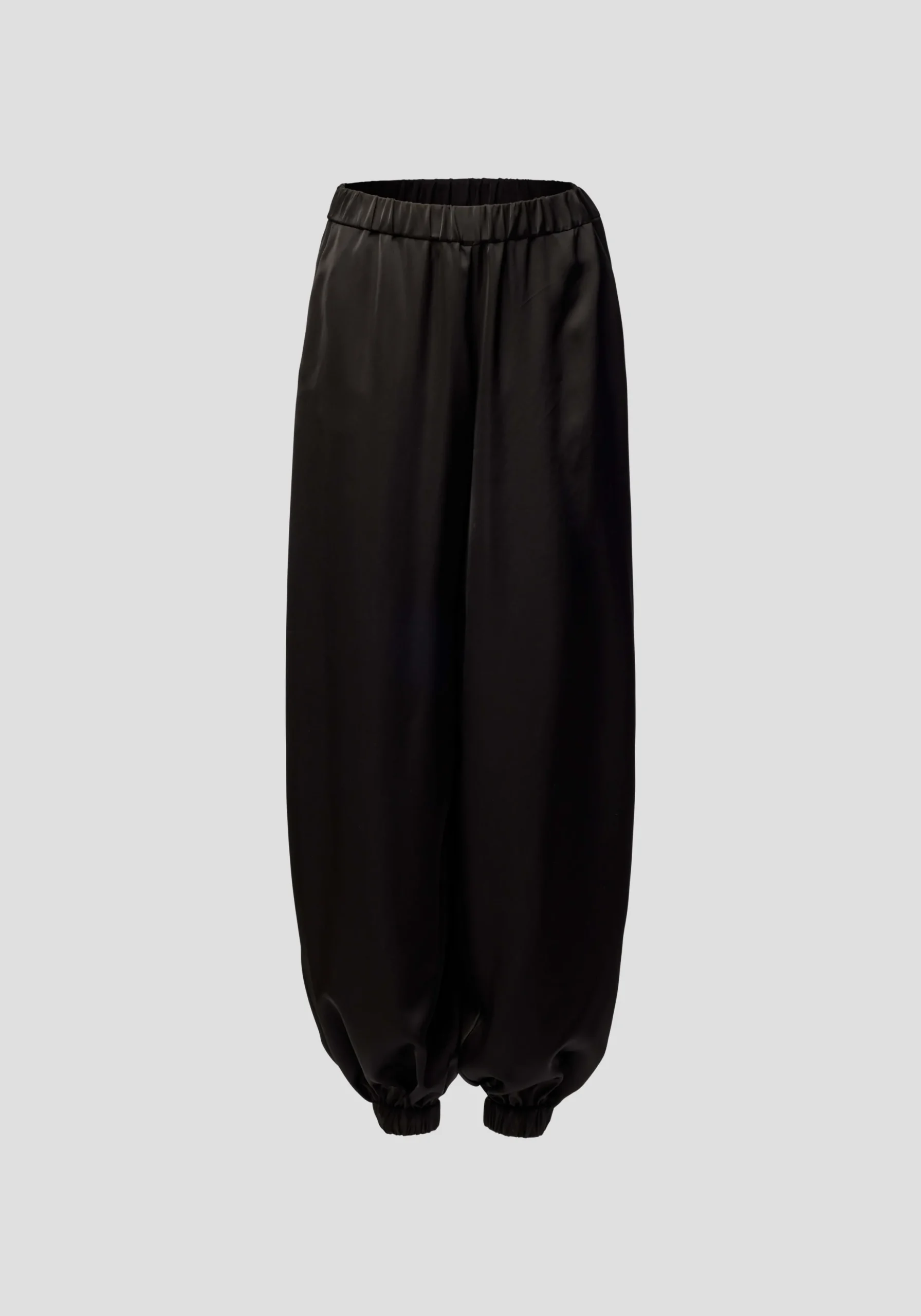The Duetto Trouser, crafted in our signature cupro blend in black, offers relaxed elevation and a refreshing point of interest. Designed with a mid-rise, genie-inspired balloon leg silhouette, it features an elasticated waistband, pockets, and an elasticated cuff that can be worn long or adjusted for varied lengths.MADE IN AUSTRALIA