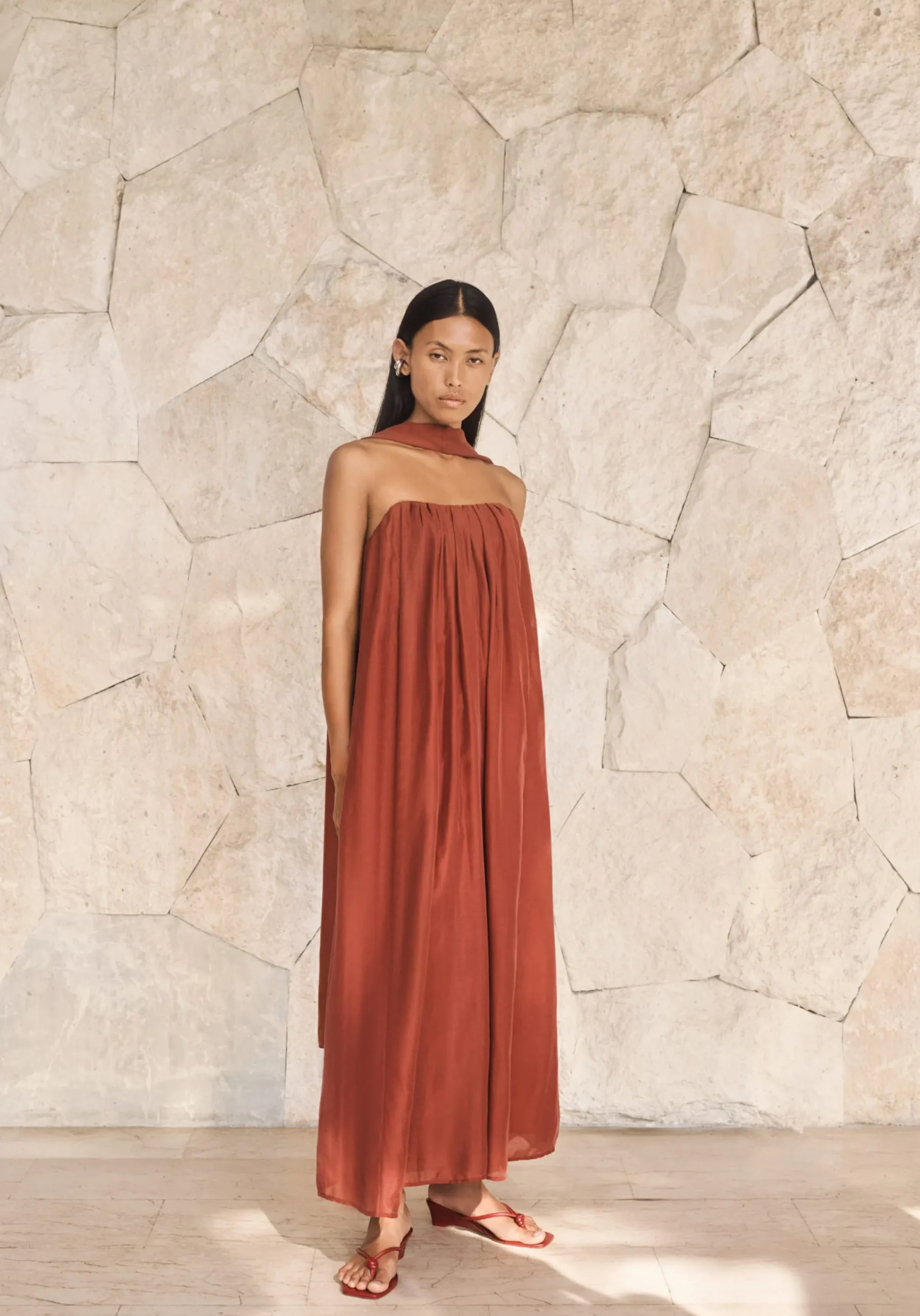 The Vale Scarf, a modern accessory crafted from a linen blend in a deep red hue, offers versatile styling as a headscarf, top, neck piece, hair accessory, or handbag tie – infusing spirited individuality into any outfit. Pair with the Beaumont Dress for a sculptural statement, perfect for your next event or elevated resort-season styling.MADE IN AUSTRALIA
