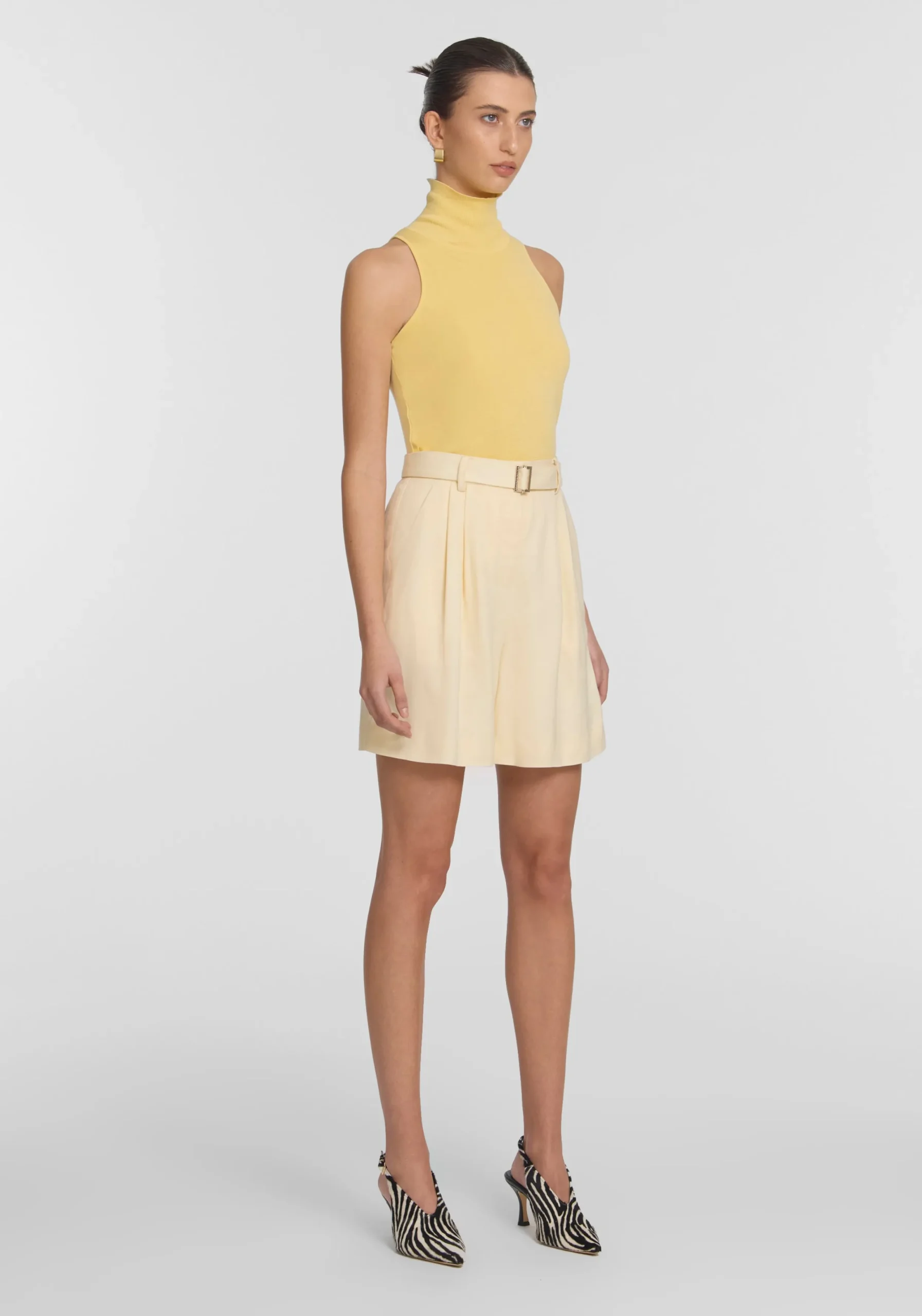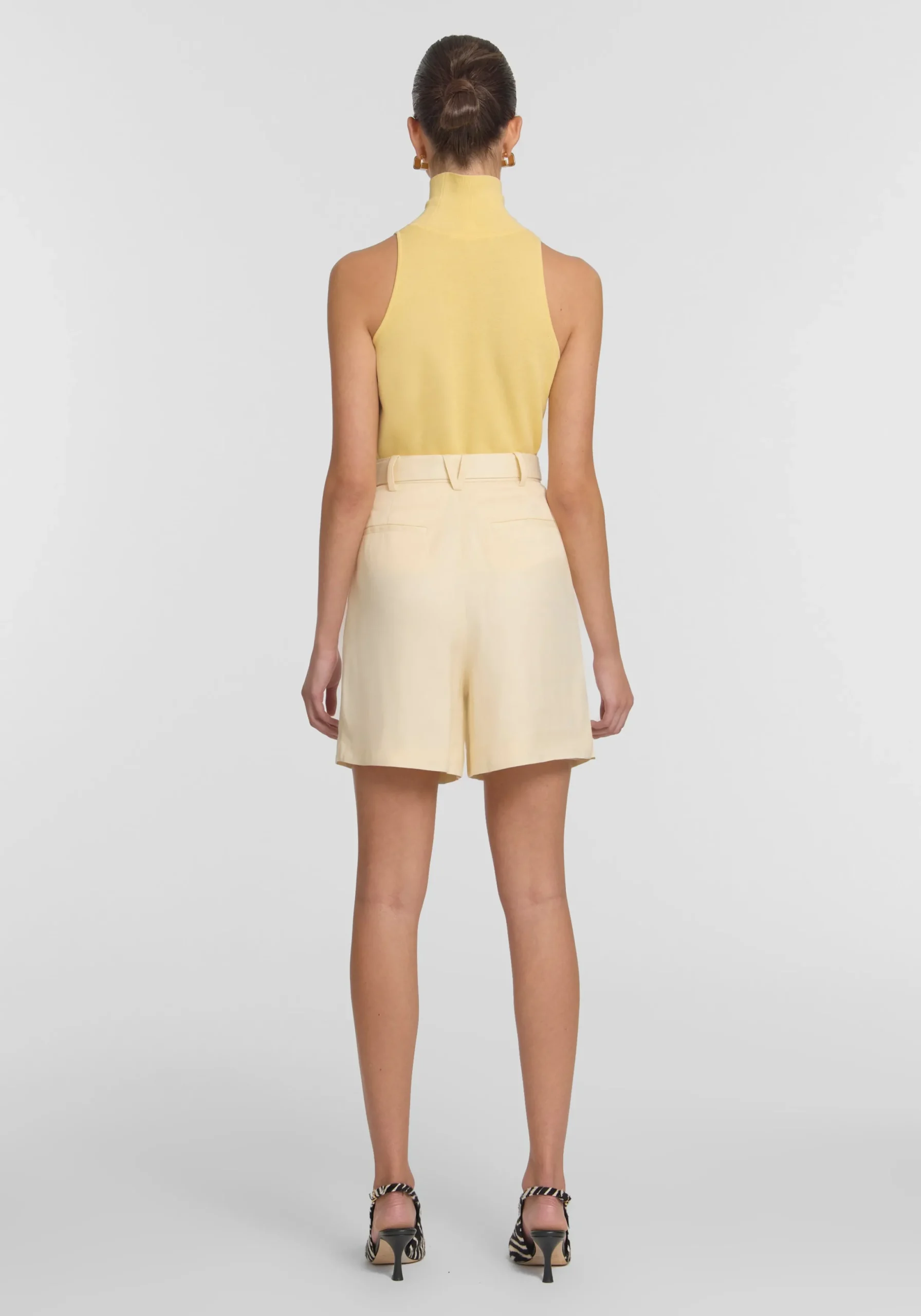 Elevate your tailoring with the Seneca Short, offering relaxed sophistication in a soft yellow hue. Boasting a high-waisted bermuda silhouette, it features front pleats, belt loops, pockets, and complete with considered belt detailing. Pair with the Freefall Blazer for a modern spring suit, or with this season’s yellow offerings for a subtle mix of fabrications and hues.