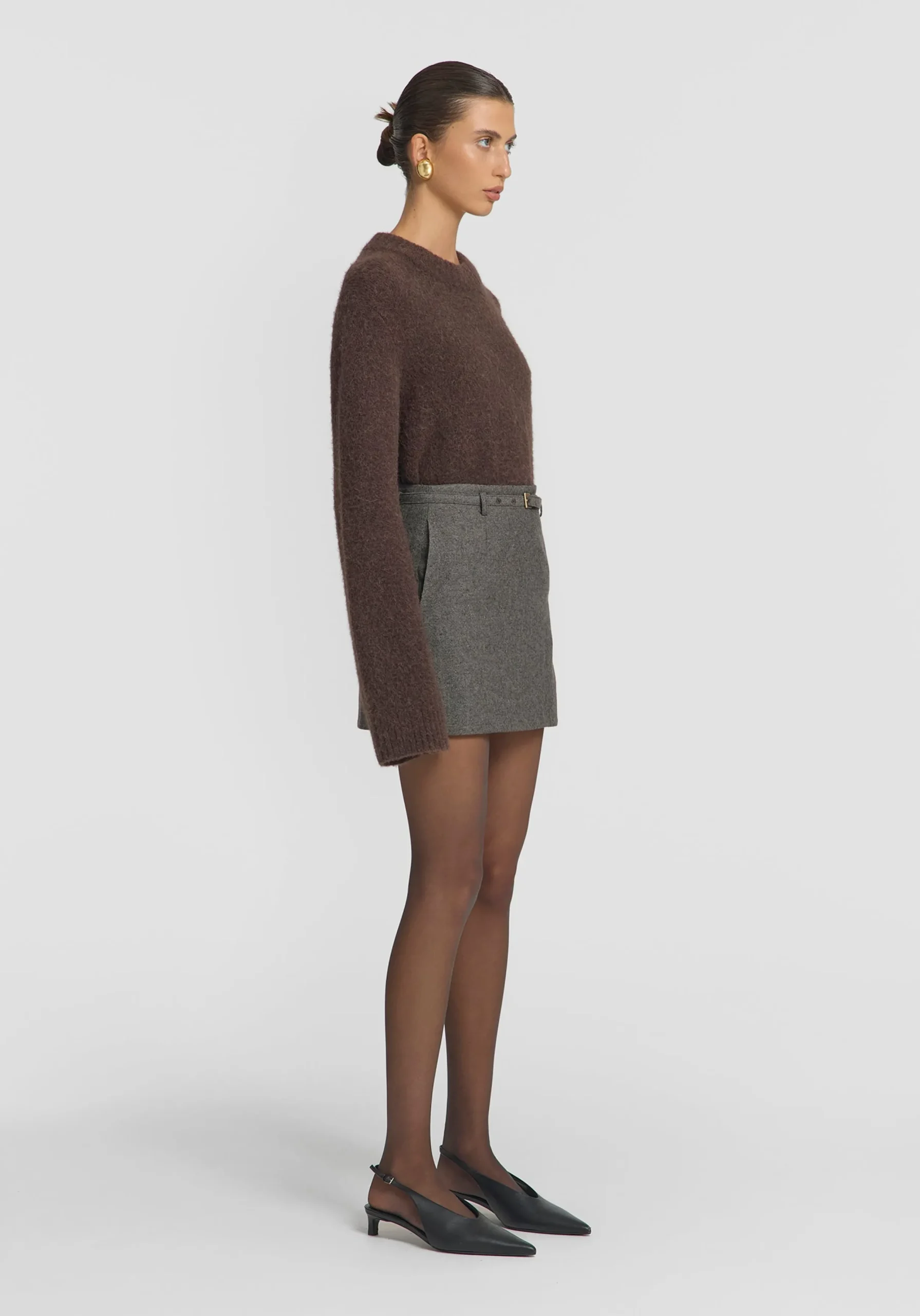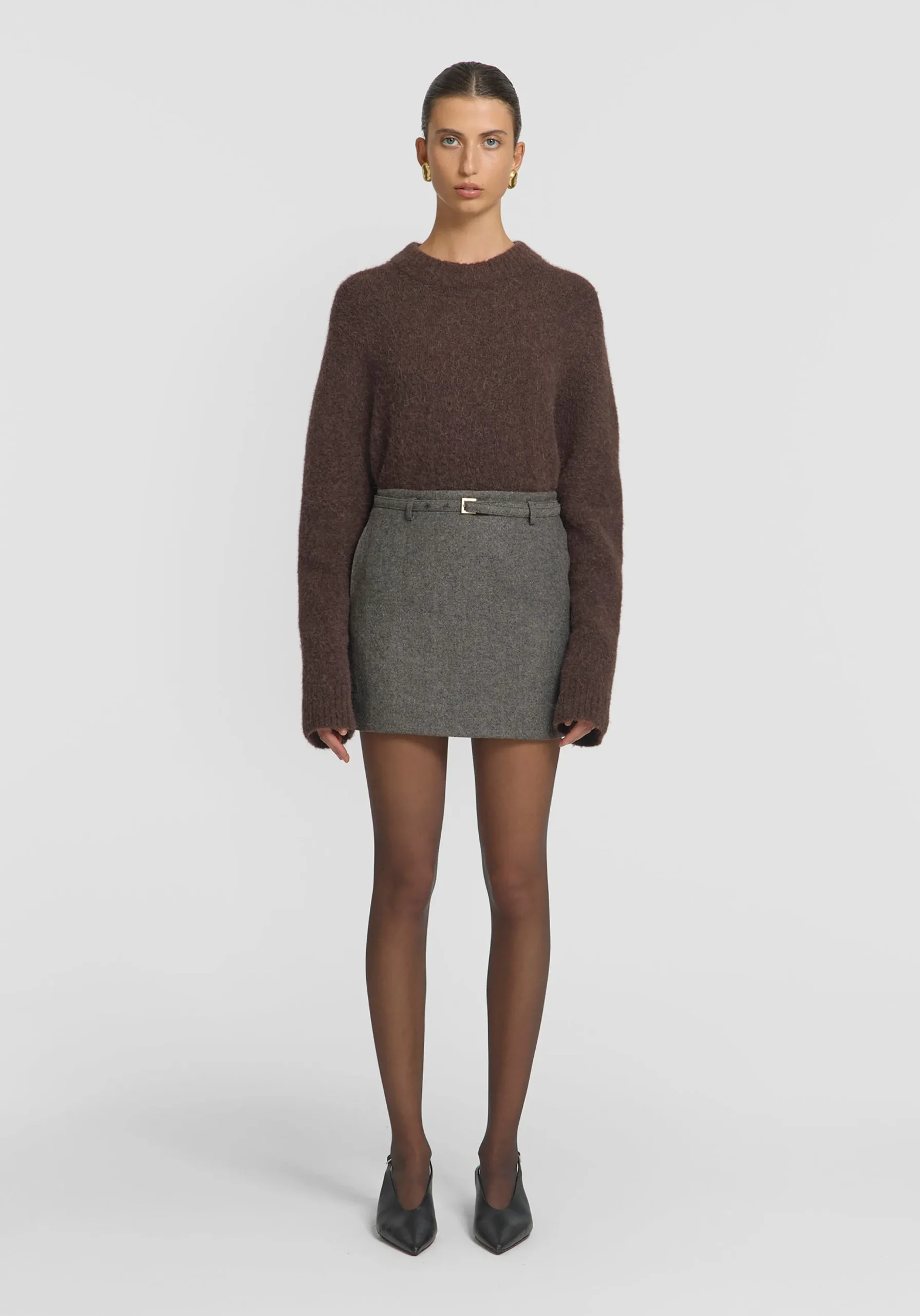 Introducing the Sterling Skirt, the perfect winter mini skirt, luxuriously crafted from a textured brown wool blend tweed. Showcasing a mid-rise fit, grown-on waist, pockets, and delicate belt detailing, it exudes effortless elegance. Complete the look with the Timberlake Jacket, or pair with the Winnipeg Knit or Alberta Knit Top for a chic blend of brown hues.MADE IN AUSTRALIA