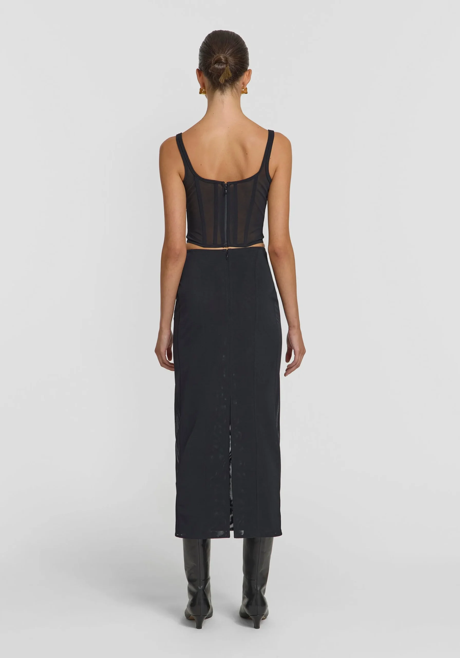 An alluring addition to the V&W powermesh narrative, the Underdog Skirt is a fitted midi-length skirt in sleek black. Enhanced by intricate seam details, subtly sheer side panels, and a back vent – with double lining at the front and back – it offers a bold yet refined silhouette. Pair it with the Salacious Bustier for the ultimate statement in black.MADE IN AUSTRALIA
