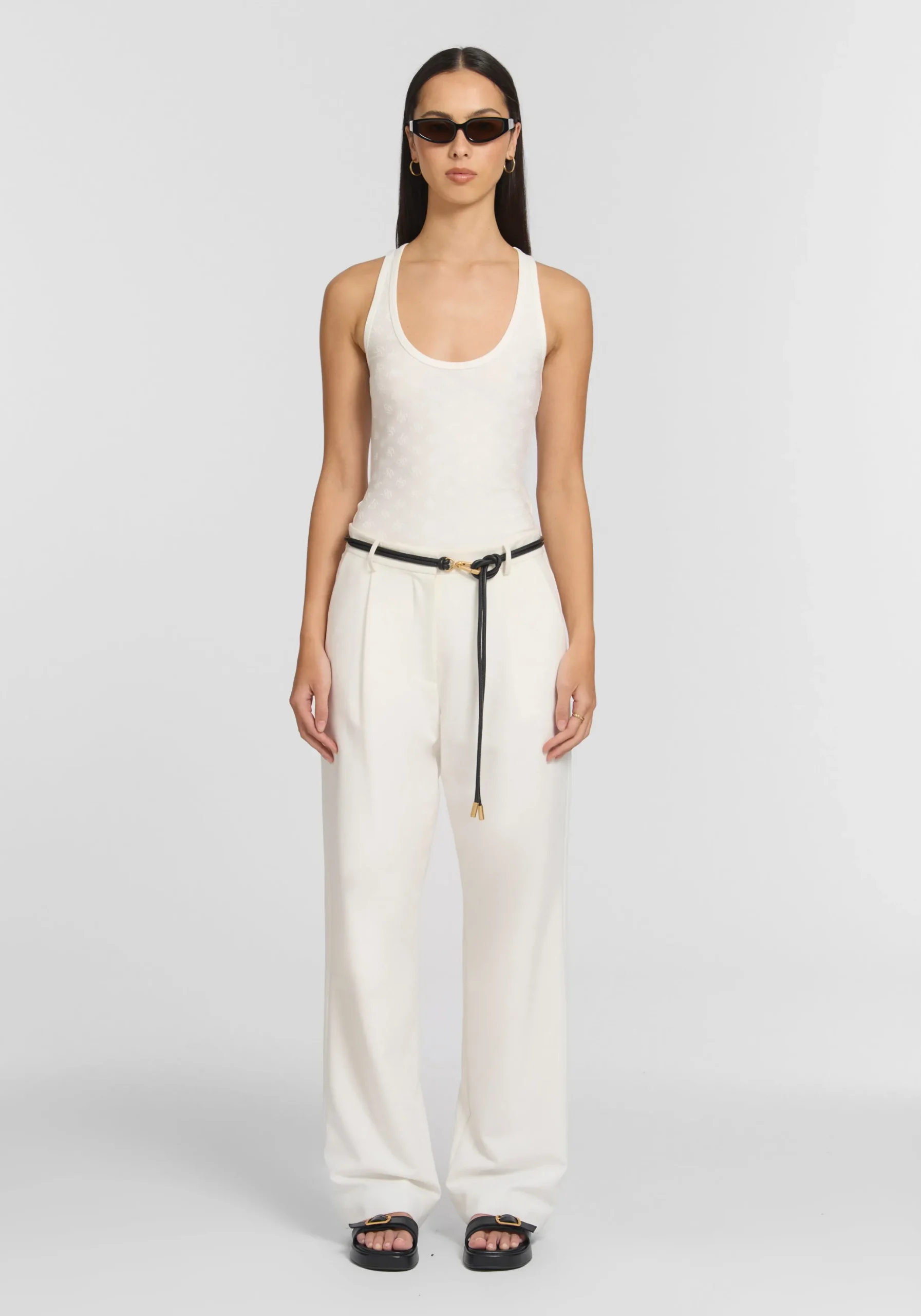 Introducing the Saint Tank, a seasonless basic for the modern wardrobe. This effortless white tank features a fitted silhouette, scooped neckline, and fun V&W jacquard detailing. The perfect first layer for everyday dressing, it fuses refined simplicity with a considered touch.