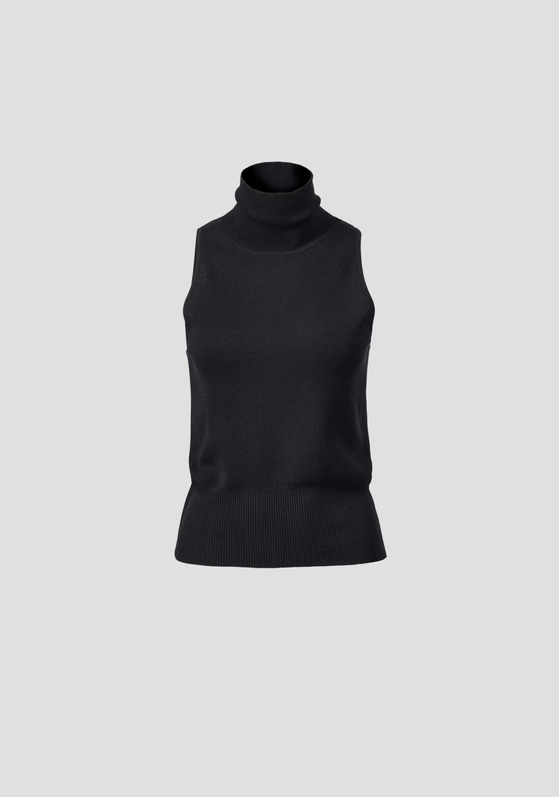 Exuding quiet confidence, the Awestruck Knit Top is an elevated essential in a black cotton-silk blend with a mid-weight milano stitch. Its sleeveless, fitted silhouette and high neckline are finished with ribbed trims, creating a sleek, modern minimalist shape.