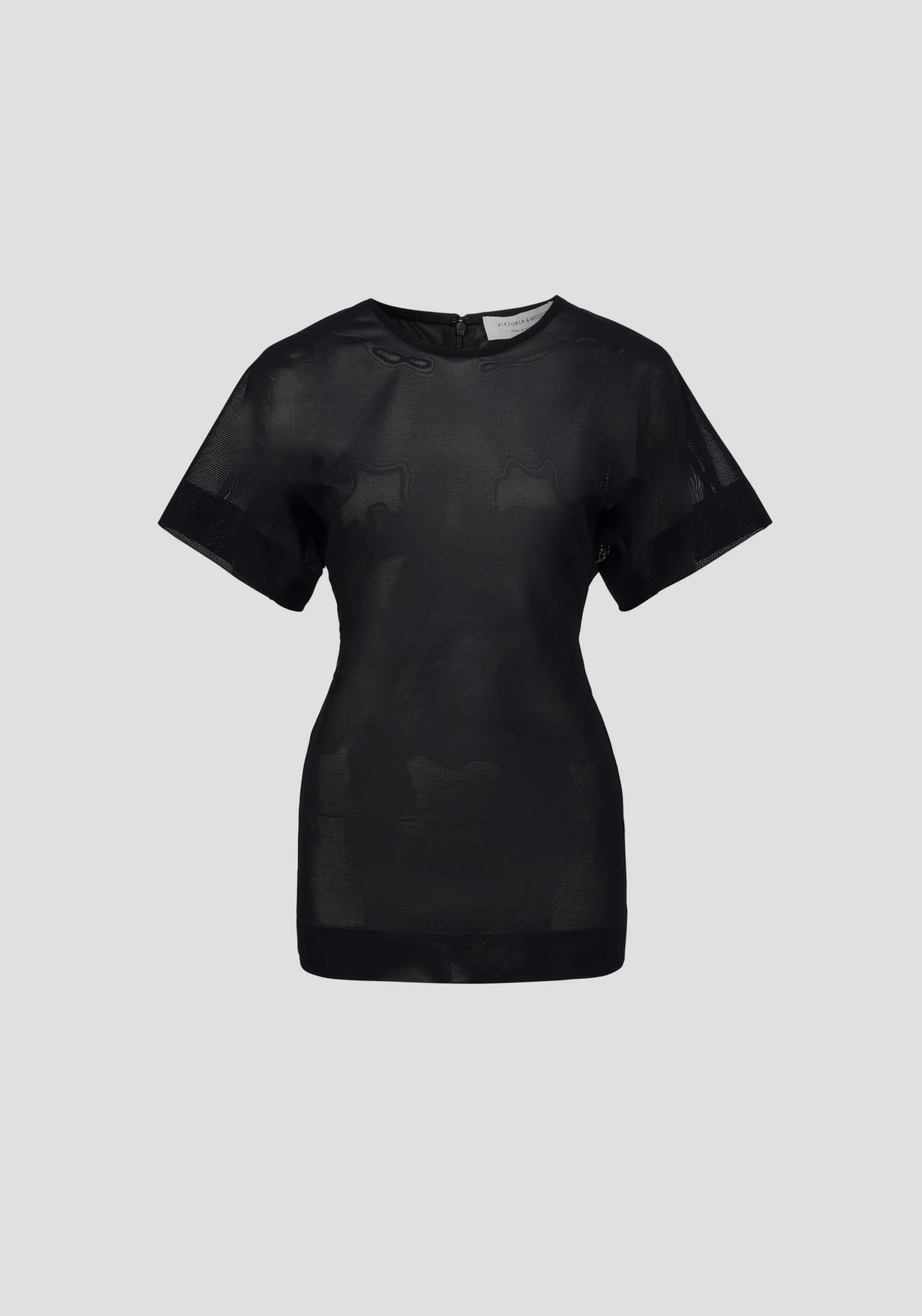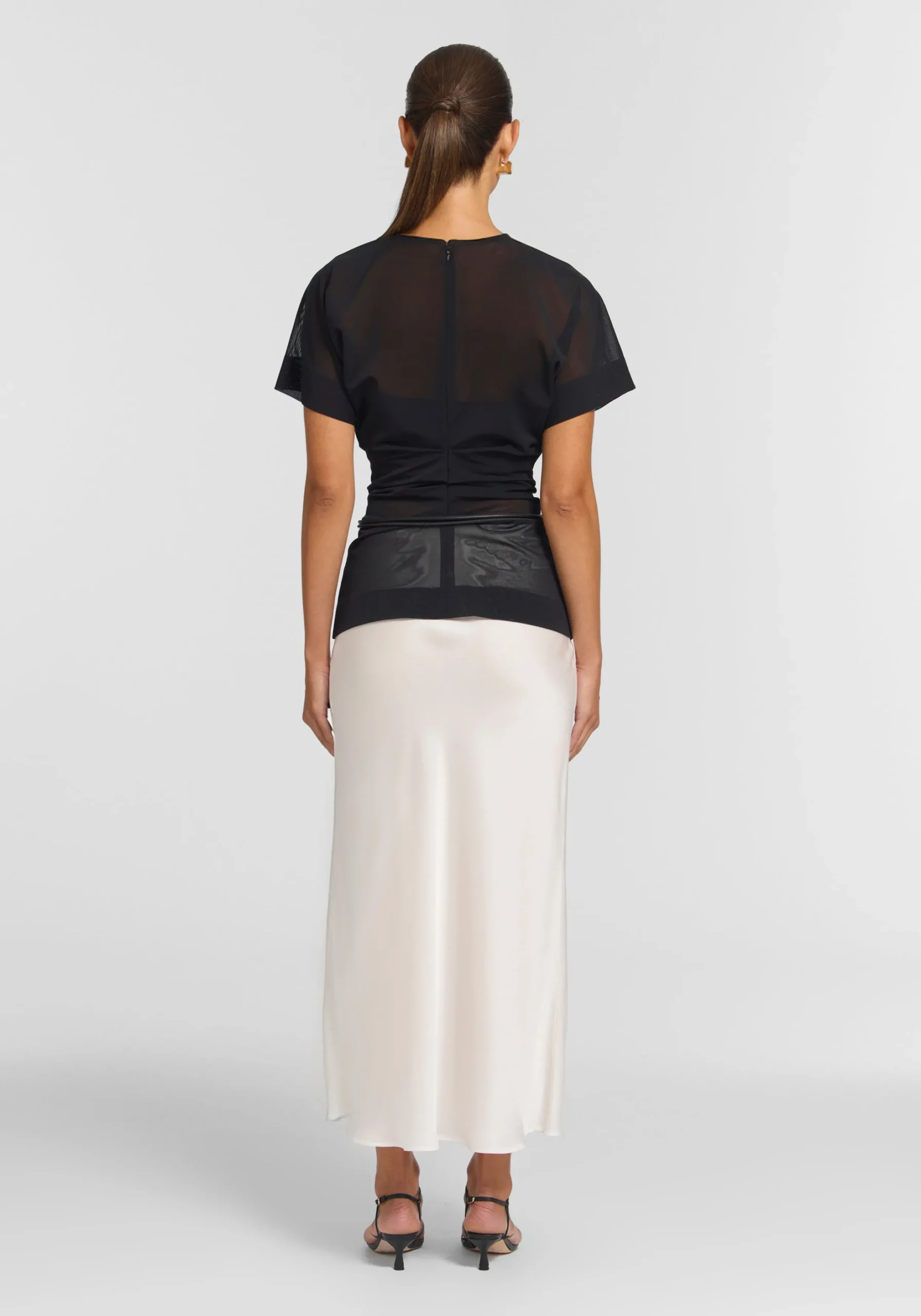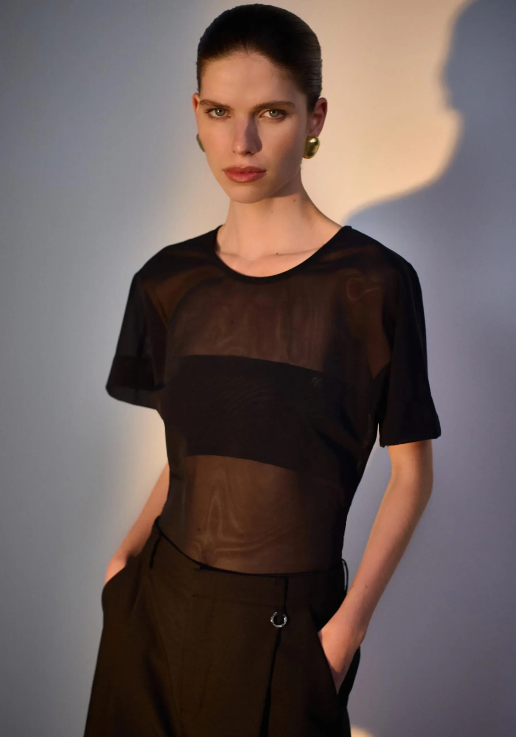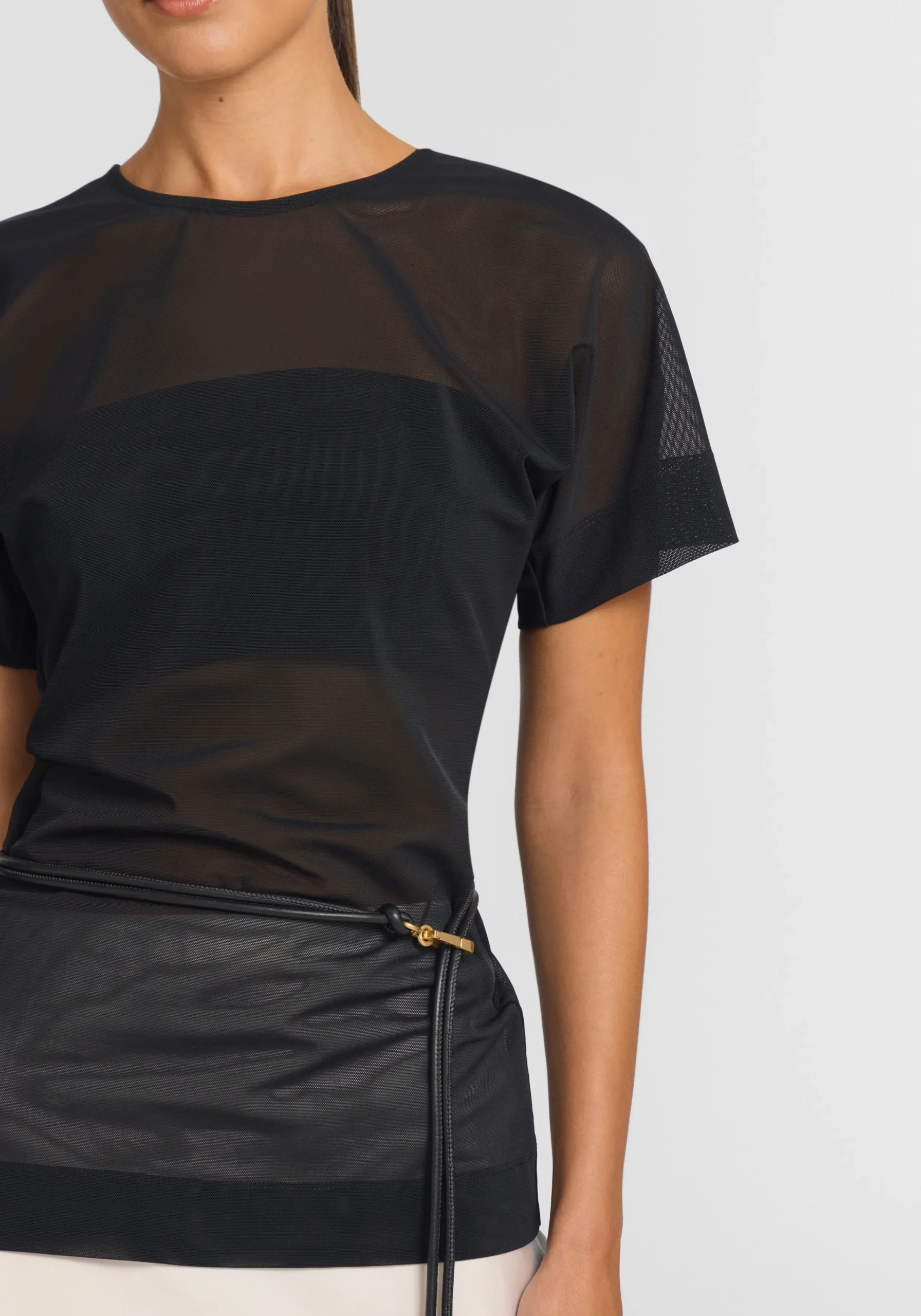 An elevated essential, the Polaris Top is crafted from our signature V&W Powermesh in black, fusing elevated ease with modern proportions. Defined by an extended shoulder silhouette and crew neckline, this structured tee features back waist tucks that cinch the waist. Pair with the V&W Foundation Bandeau in black for seamless, sheer styling.MADE IN AUSTRALIA