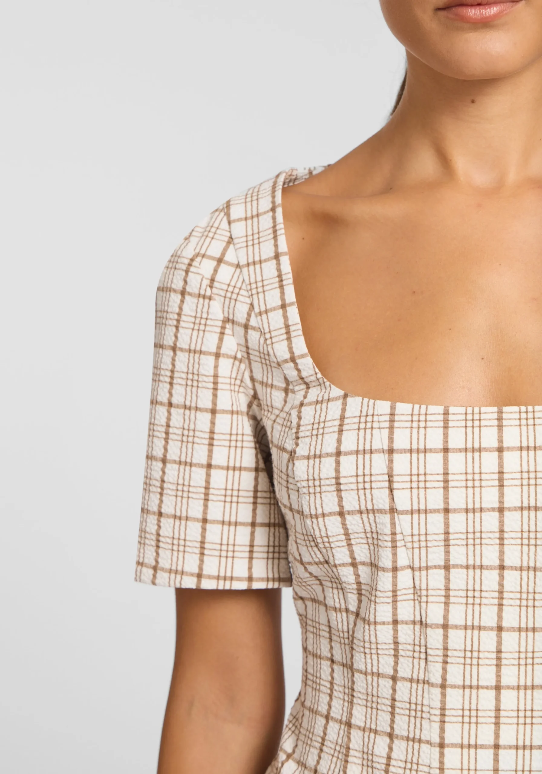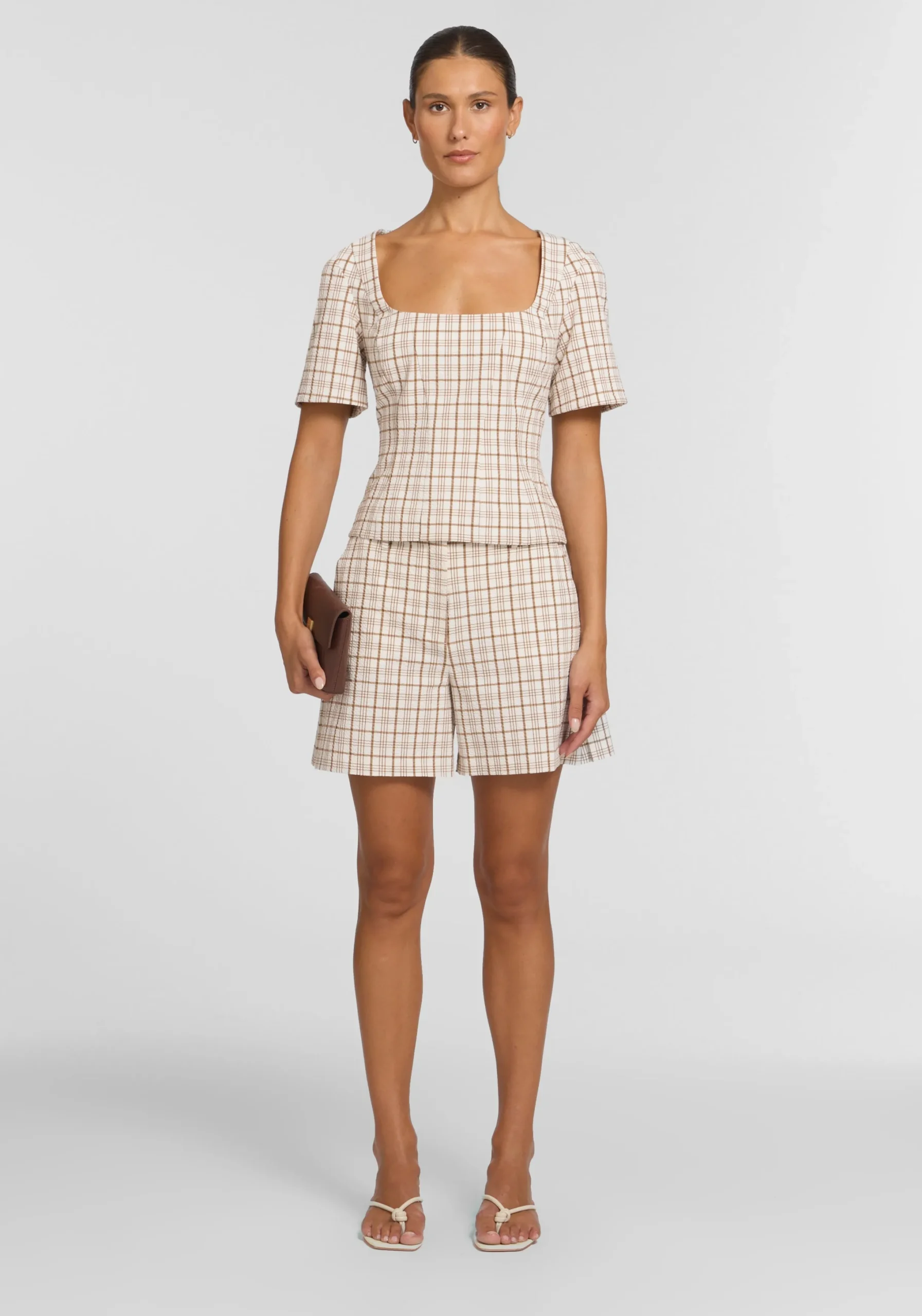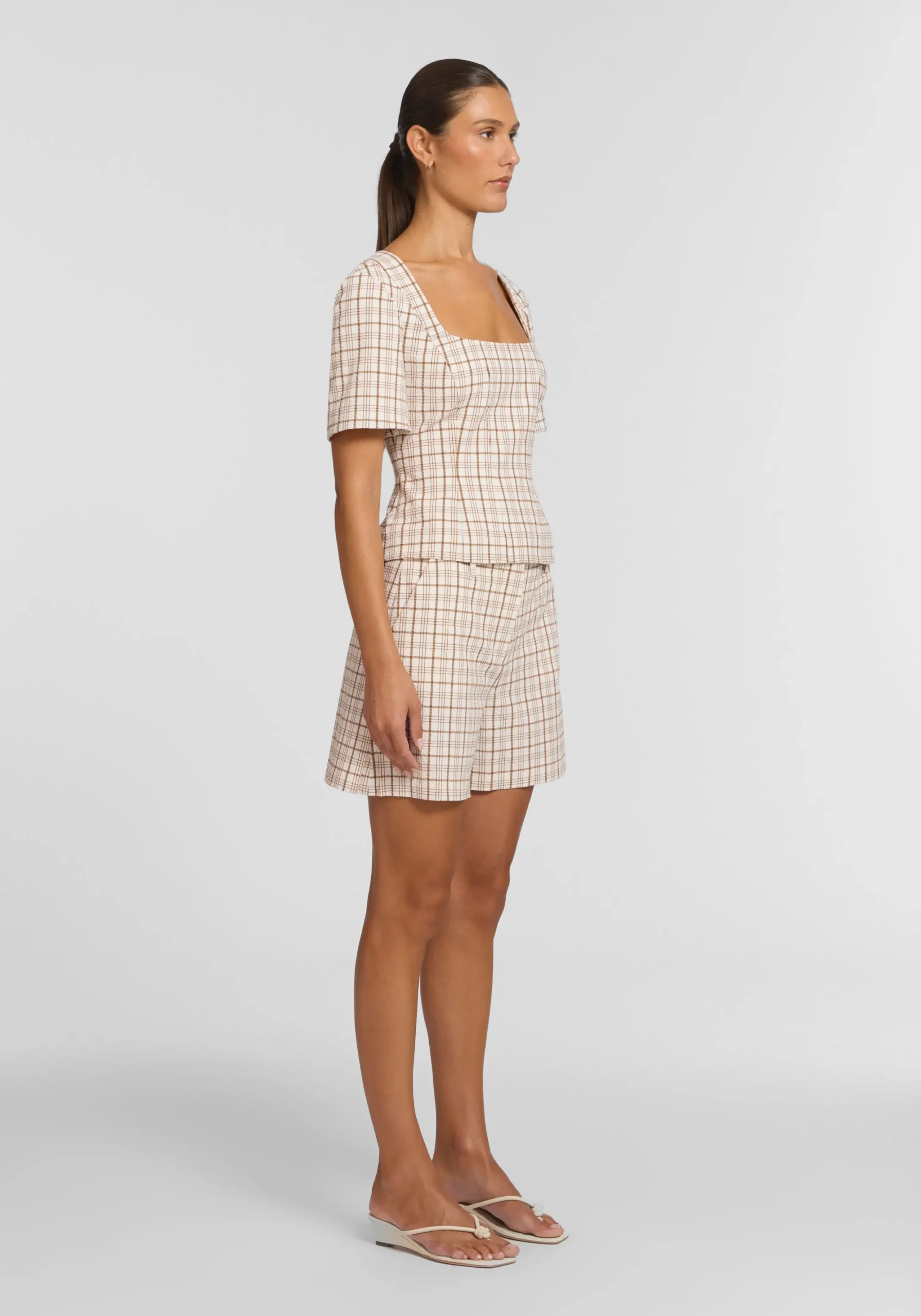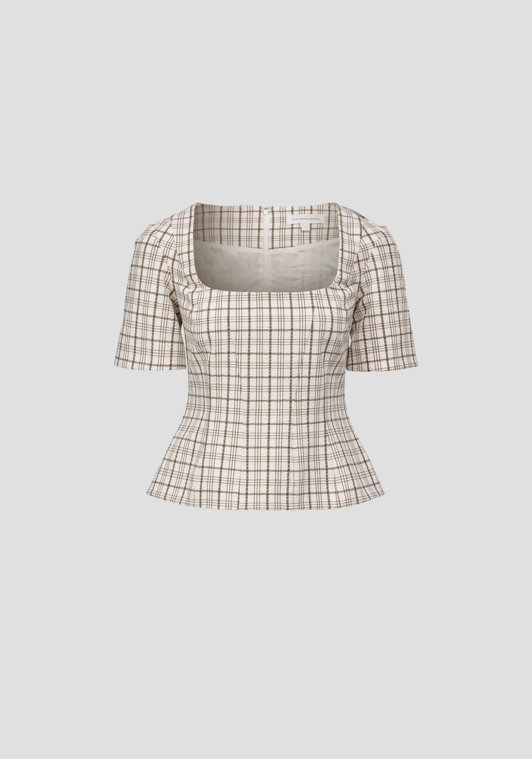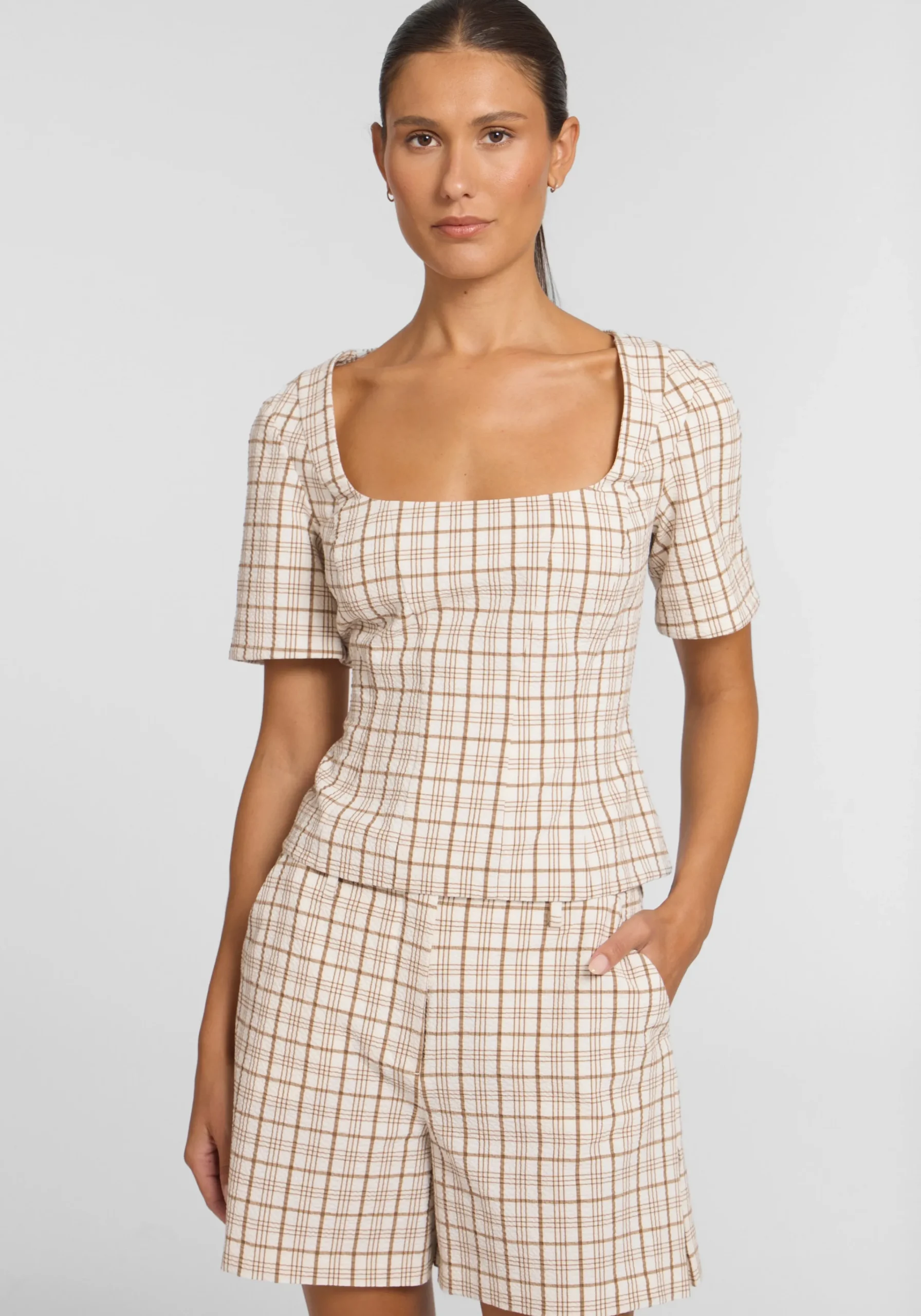 Exuding feminine sophistication, the Campus Top is crafted in a textured neutral check. Showcasing a square neckline, short sleeves, and front princess seams, it flatters the waist for a sleek silhouette. Pair with the Rupert Short for a matching set that embodies V&W’s signature tailoring with a preppy undertone, perfect for courtside style.