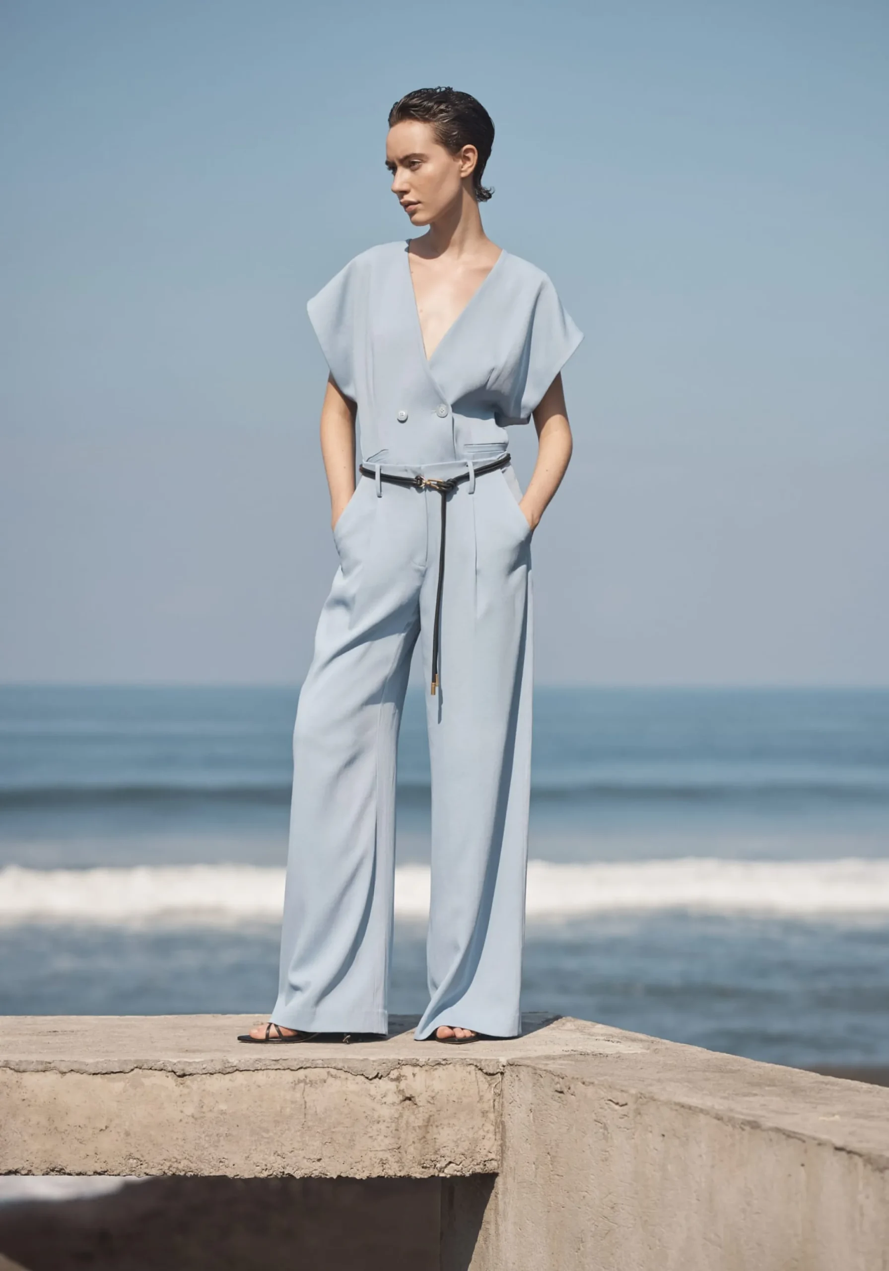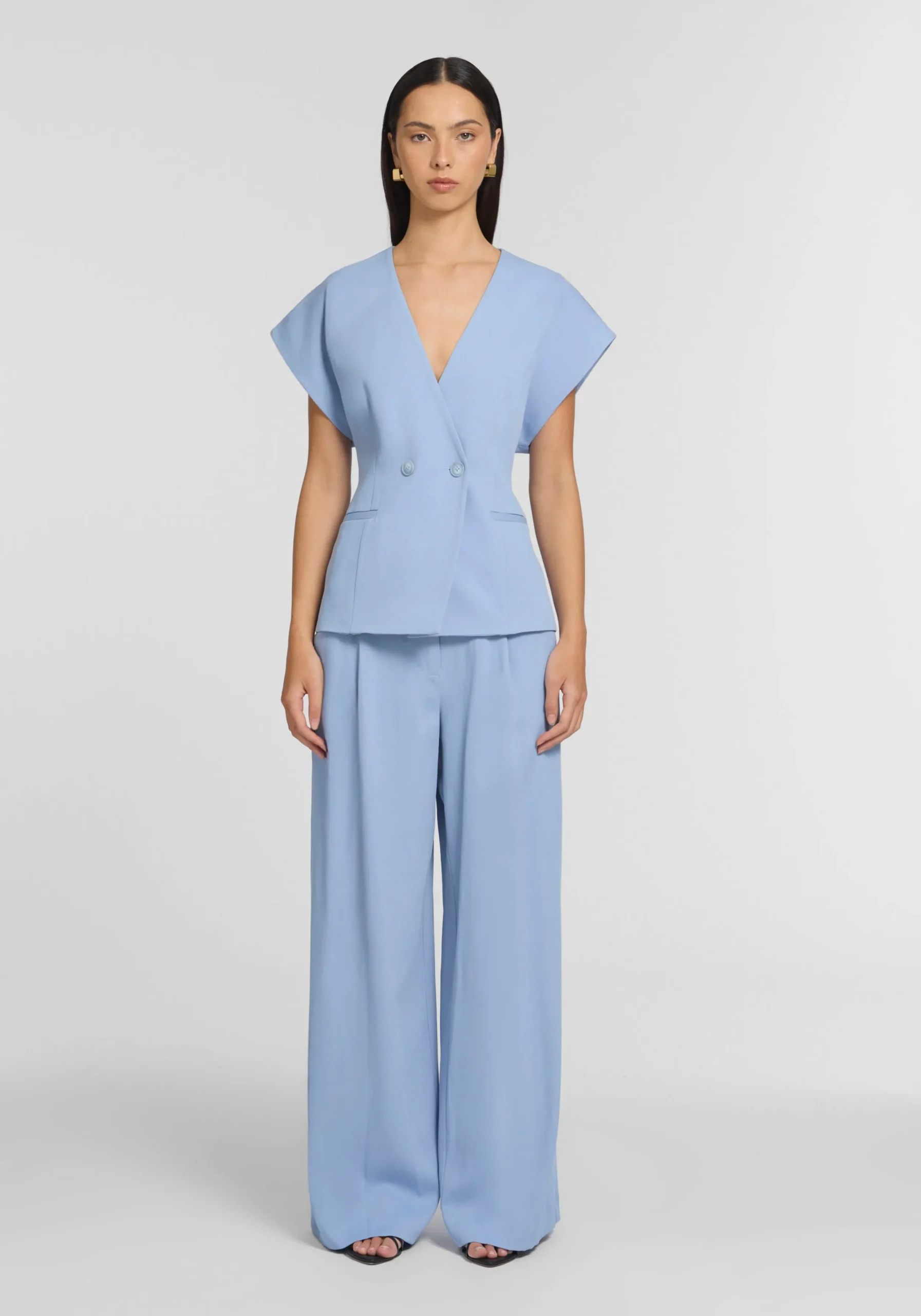 Infuse your tailoring with classic sophistication with the Ludlow Vest in serene saltwater blue, crafted from a recycled Japanese textile. Defined by a bold yet understated silhouette, this double-breasted design offers extended shoulders, a front button closure, and mock front pockets. Pair with the Draper Trouser to fuse fluid foundations with sharp tailoring, forming a modern uniform of considered ease.