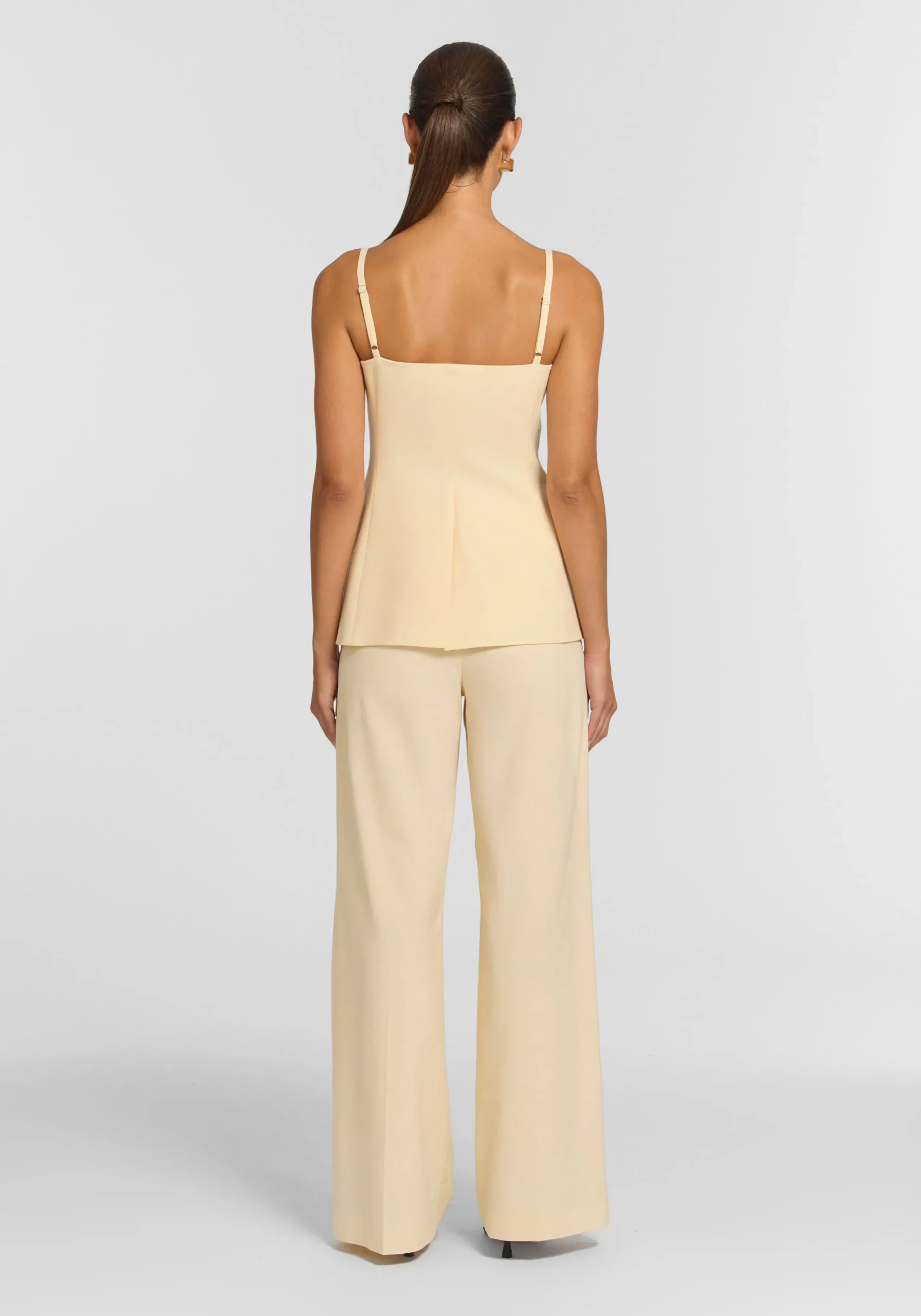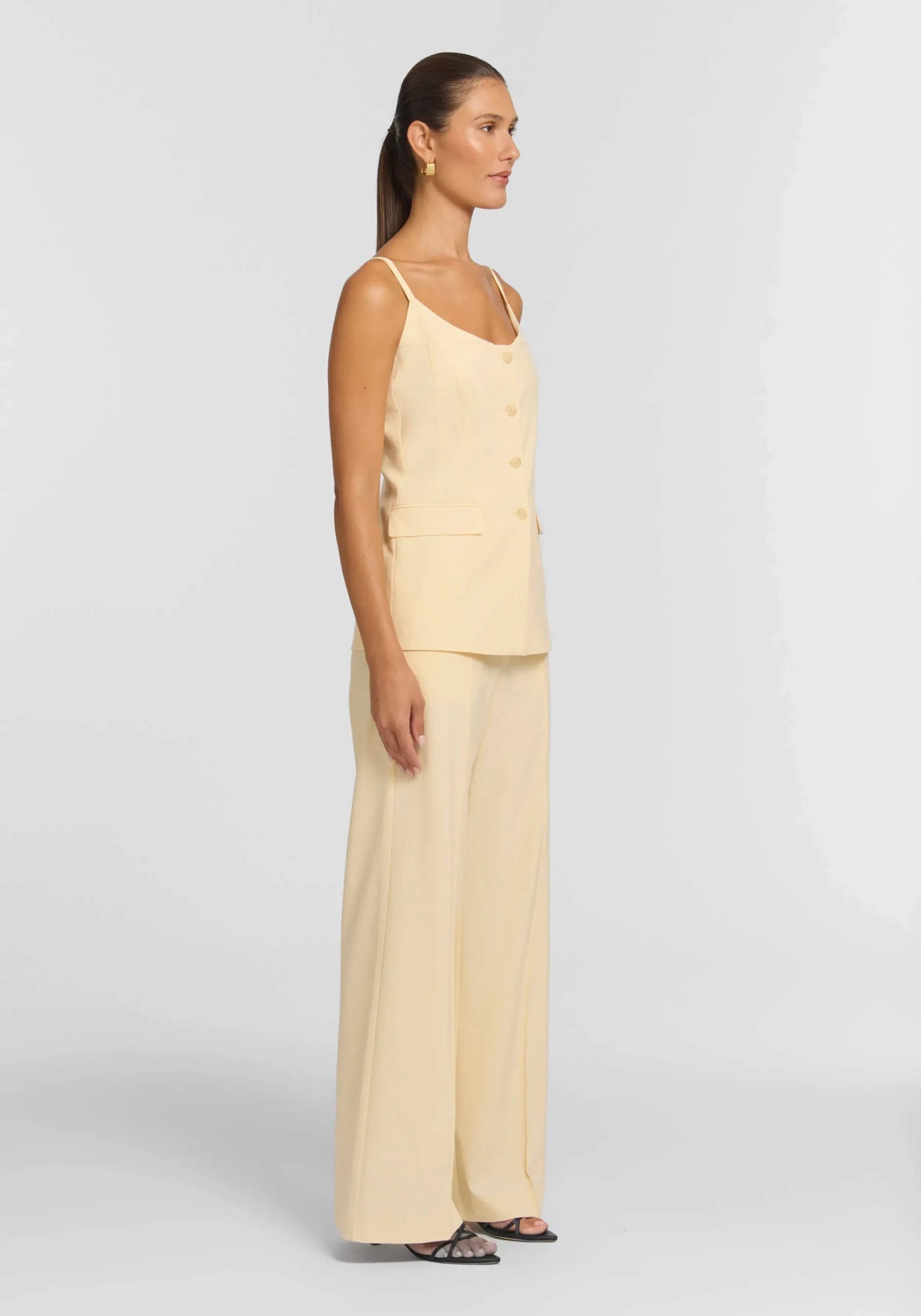 The Megawatt Top, precisely tailored in a confident sunflower-hued linen blend. Featuring a sharp, tapered silhouette, scooped neckline, and jetted pockets, it’s finished with adjustable straps and a centre back vent. Pair with the Barker Trouser or style with denim for versatile, elevated ease.