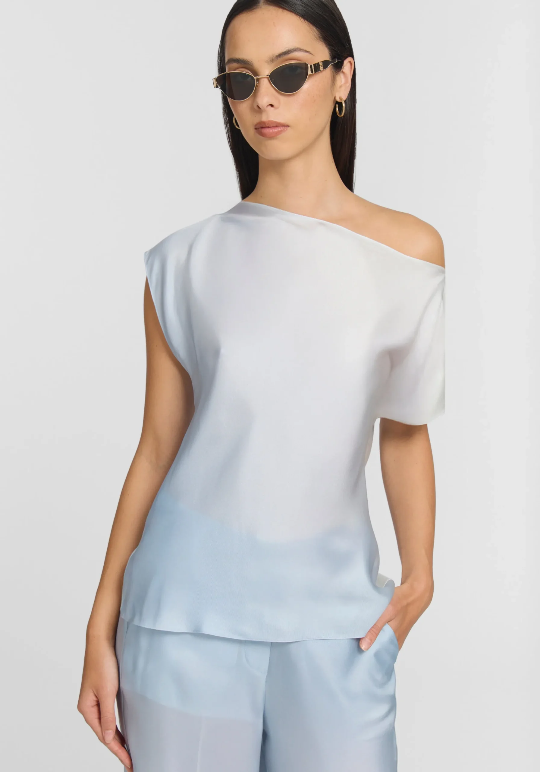The Rosemary Top is crafted from luxurious, weightless silk and realised in a soft blue ombre print, echoing the waves of the sea. Bias-cut for a natural drape, it falls effortlessly through the body, showcasing a fluid cowl neckline and extended shoulders. Style with the Willow Pant to form a clean, expressive silhouette, an artful, wearable landscape.