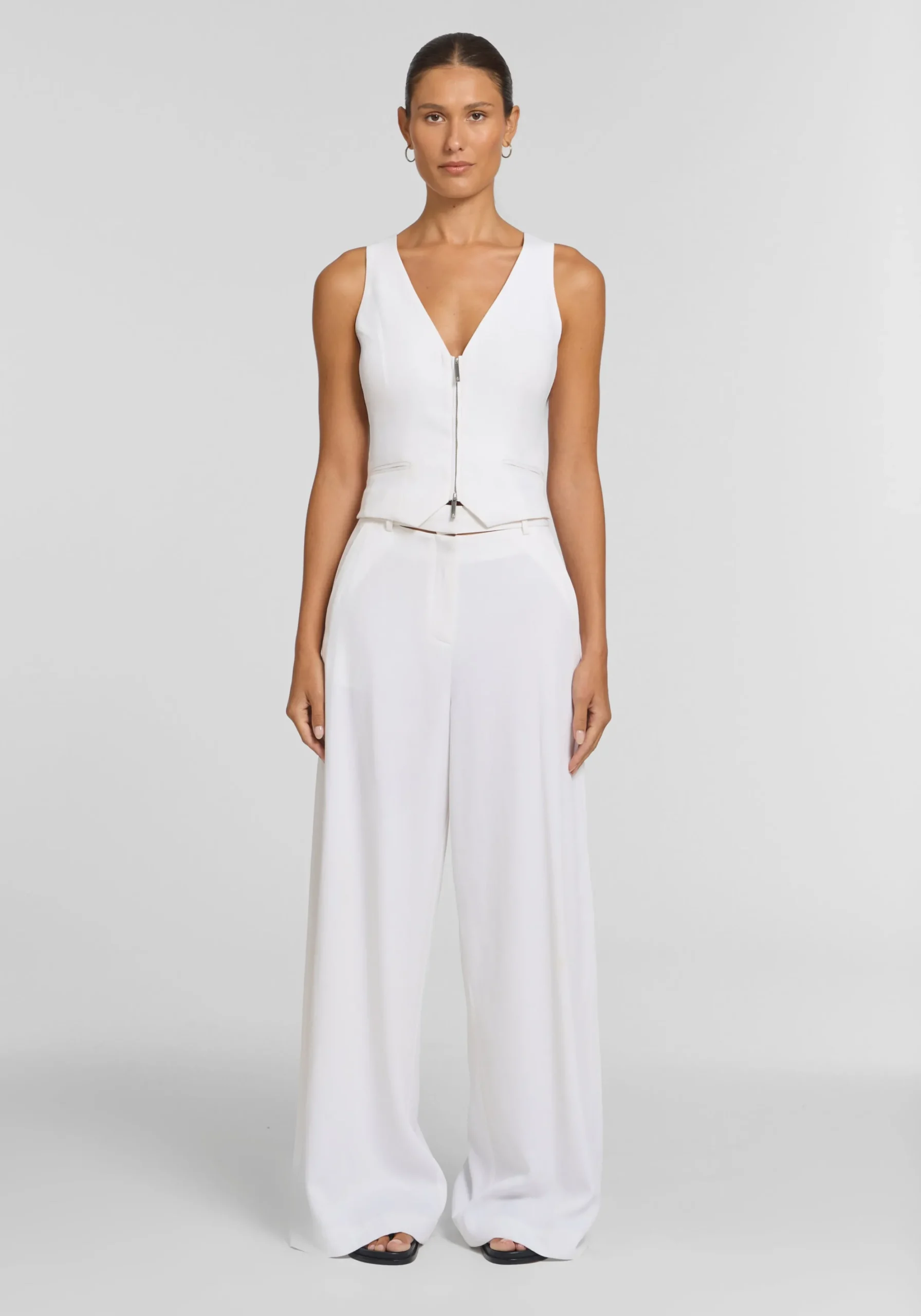 Grounded in architectural ease, the Tribute Vest is crafted from recycled plastics in crisp white. Showcasing a flattering V-neckline, it is adorned with a two-way zip, front jetted pockets, and a pointed hem. Pair with the Fitzroy Trouser for a summer tailoring that exudes understated elegance for any occasion.