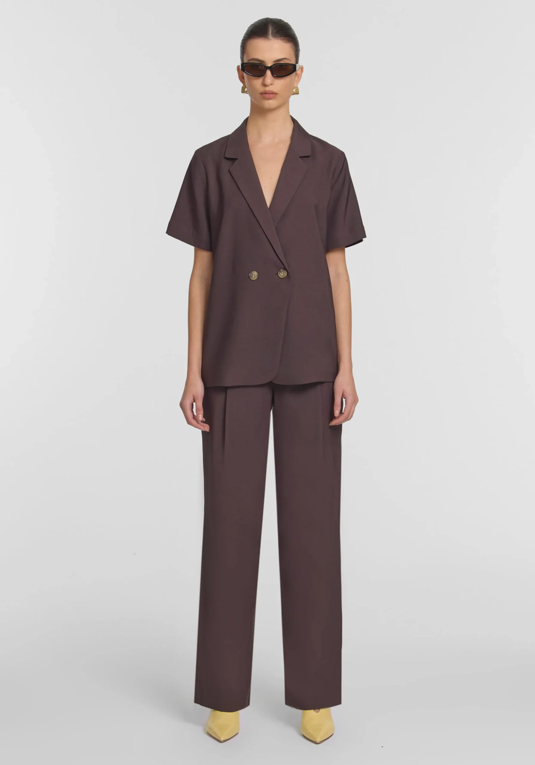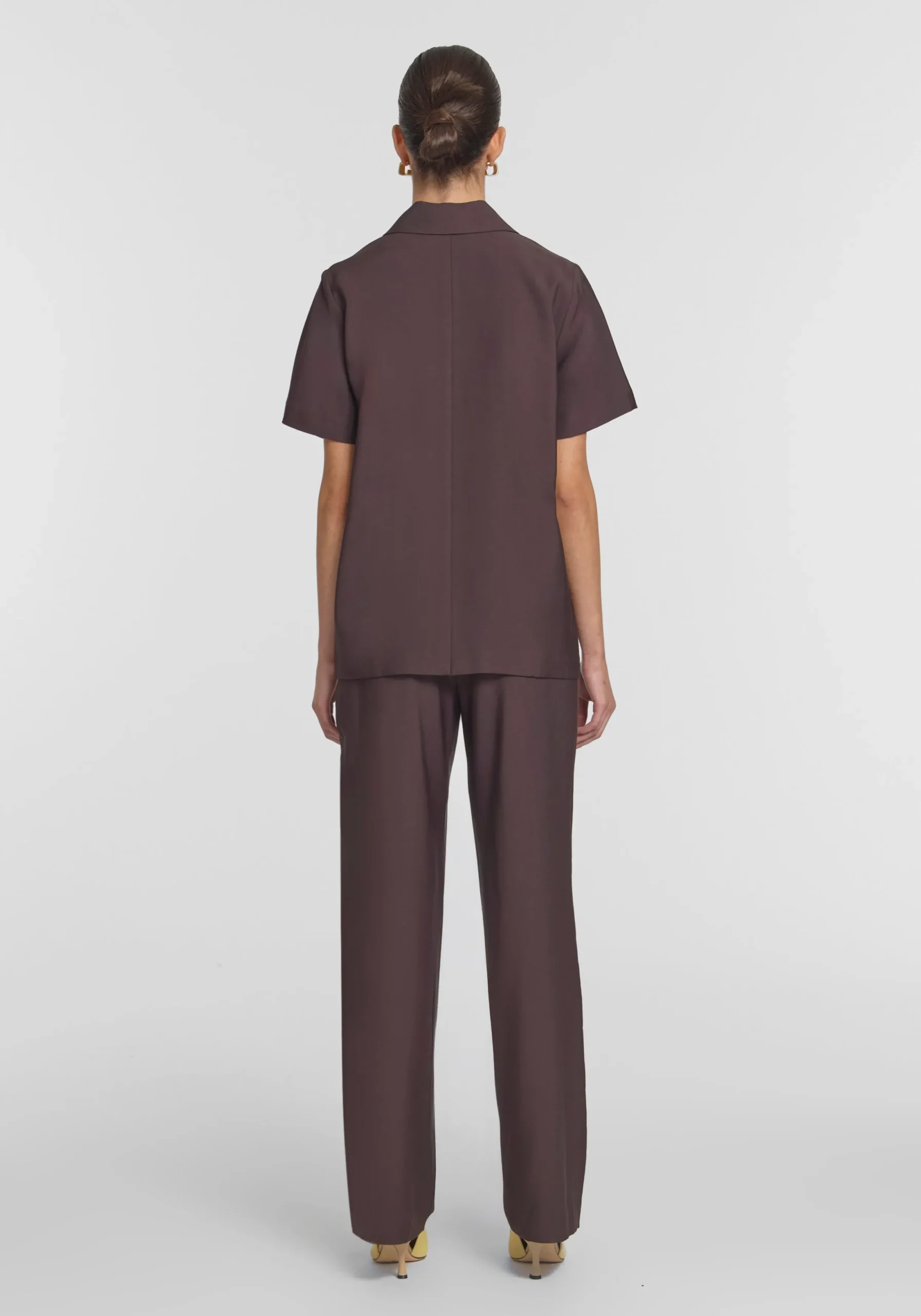 The Hepburn Shirt returns in a rich chocolate hue, tailored from our signature bamboo blend. Featuring a double-breasted front, relaxed fit, and back vent, it offers timeless versatility. Pair effortlessly with the Ivanhoe Pant for a refined set, or style back with denim for polished ease.MADE IN AUSTRALIA